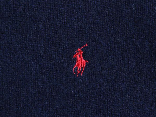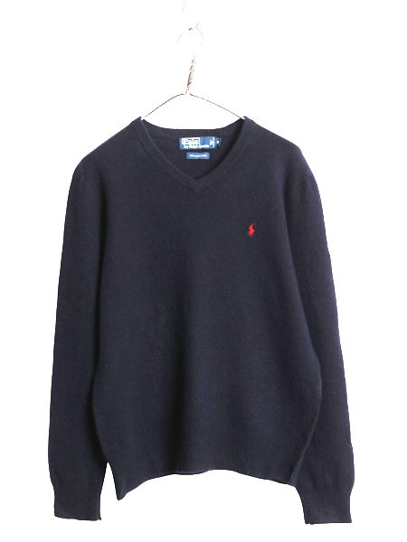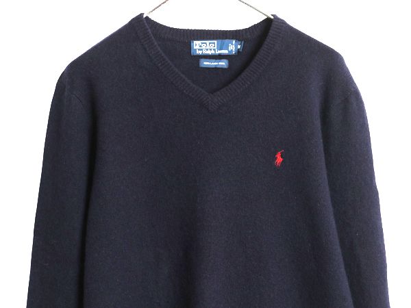 00s ポロ ラルフローレン Vネック ニット セーター メンズ М オールド ラム ウール ハイゲージ ワンポイント シンプル きれいめ ネイビー