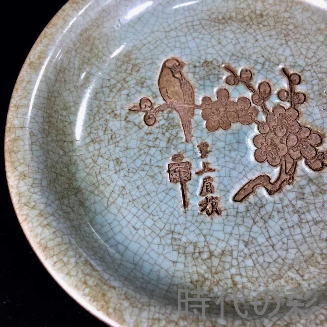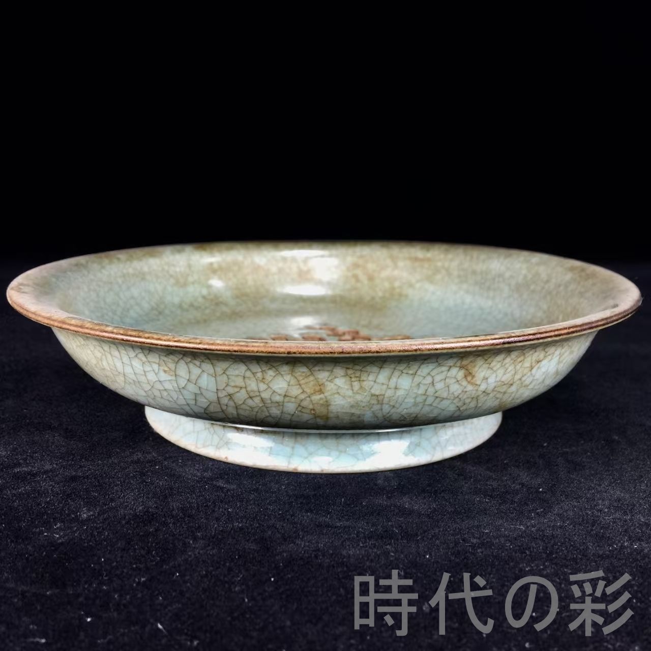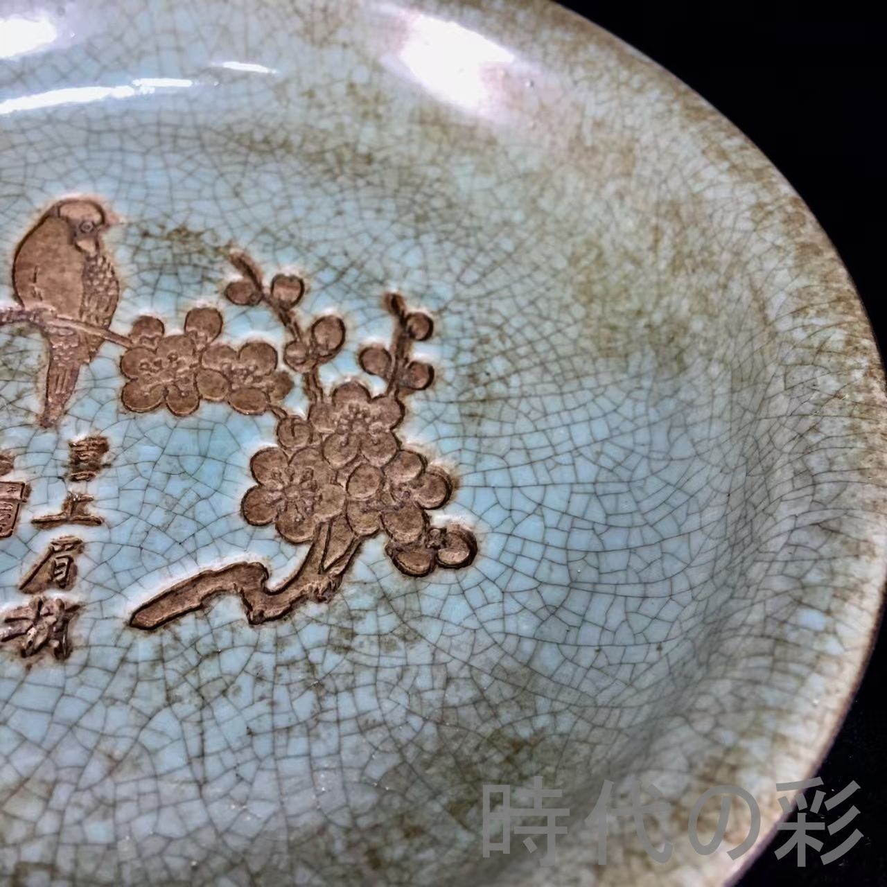 宋代汝窯の吉祥文様「喜上眉梢」を描いた盤。伝世包漿が濃く、柔らかな釉色と古色の調和が魅力。飾皿・鑑賞用として高い価値を持つ逸品です。