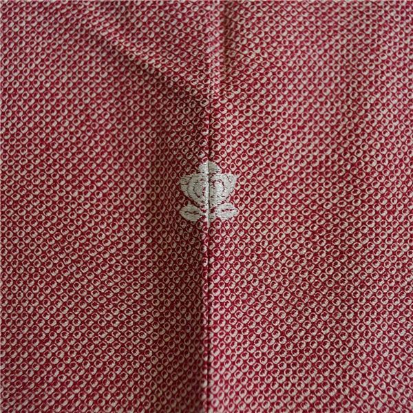 ・鹿の子絞り染め生地、江戸小紋、背中側衿下に橘の刺繍紋あり。衿留めスナップボタン付き。