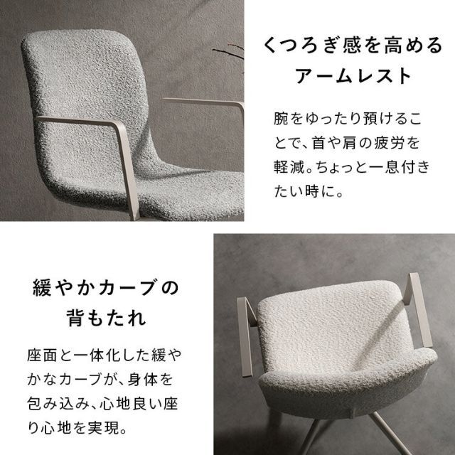 光の角度によって表情を変えるブークレ生地と直線的なアームレストが、空間に上質で、モダンな印象を与えます。
