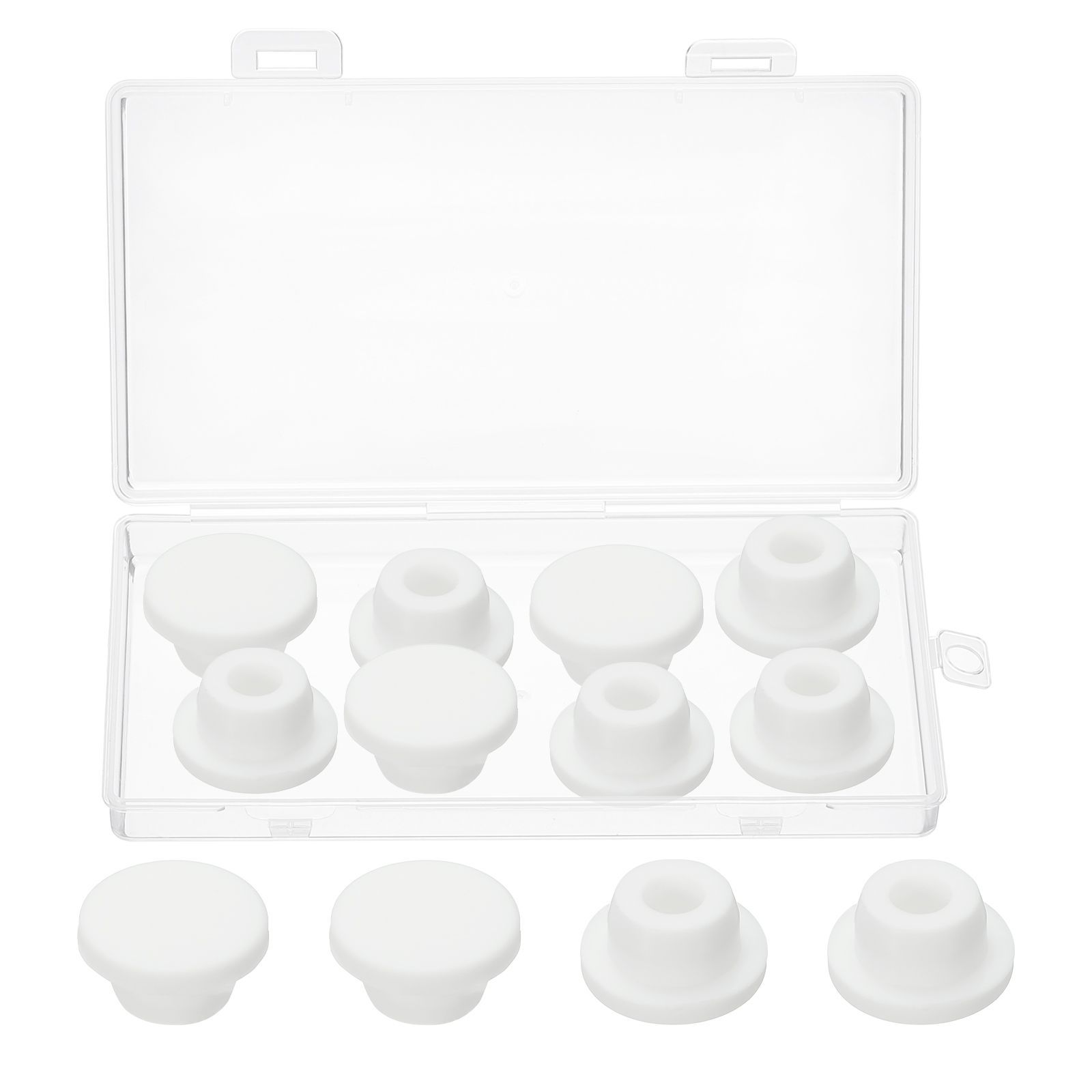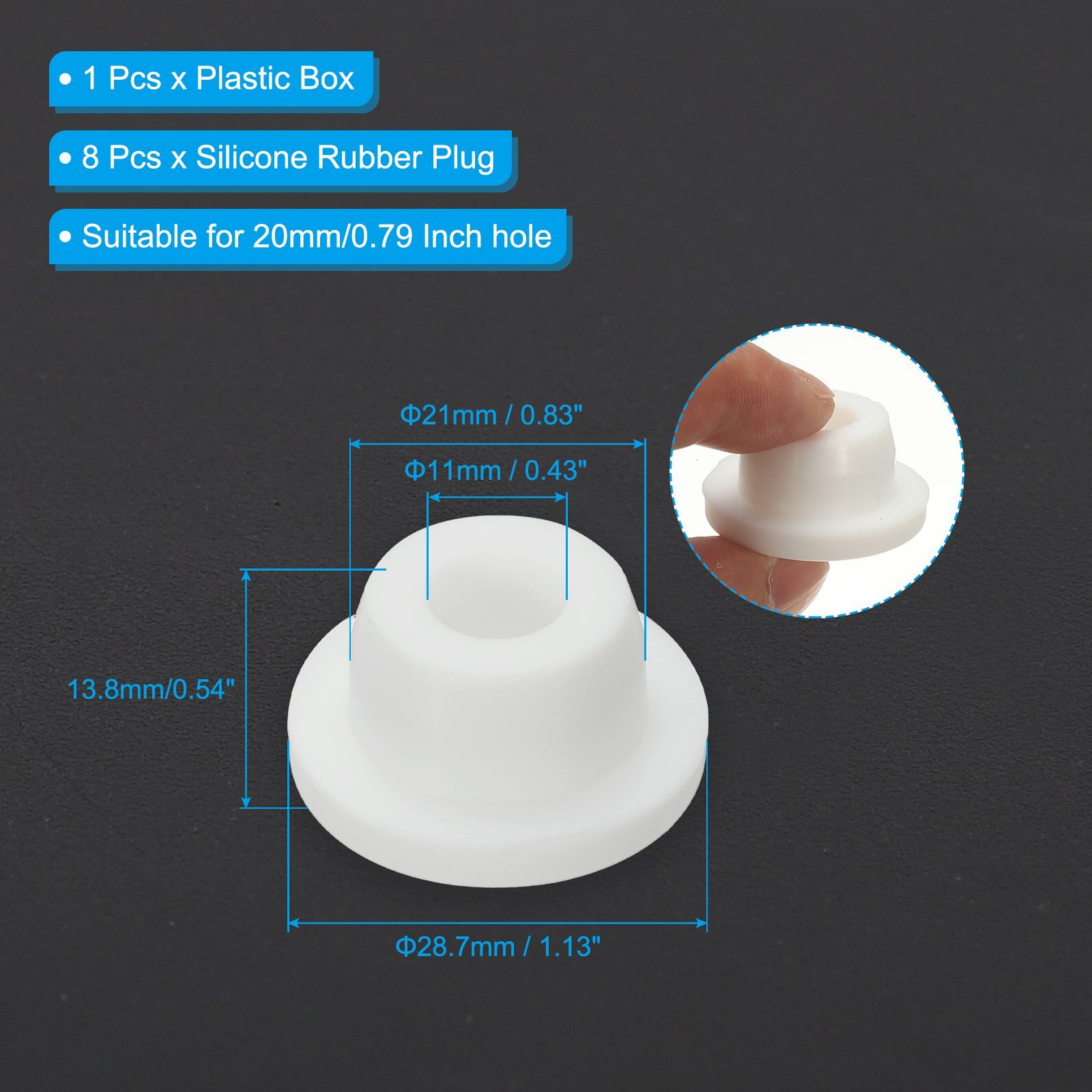 何が手に入りますか?シリコーンラバープラグのサイズは次のとおりです:総高さ:13.8mm / 0.54";トップ直径:28.7mm / 1.13";取り付け穴直径(底直径):21mm / 0.83";穴内径:11mm / 0.43";20mm / 0.79"の穴に適しています;ボックスサイズ:146 x 80 x 17mm / 5.75 x 3.15 x 0.67"(縦×横×高さ);8 x シリコーンラバープラグ、1 x プラスチックボックスがパッケージに含まれています。