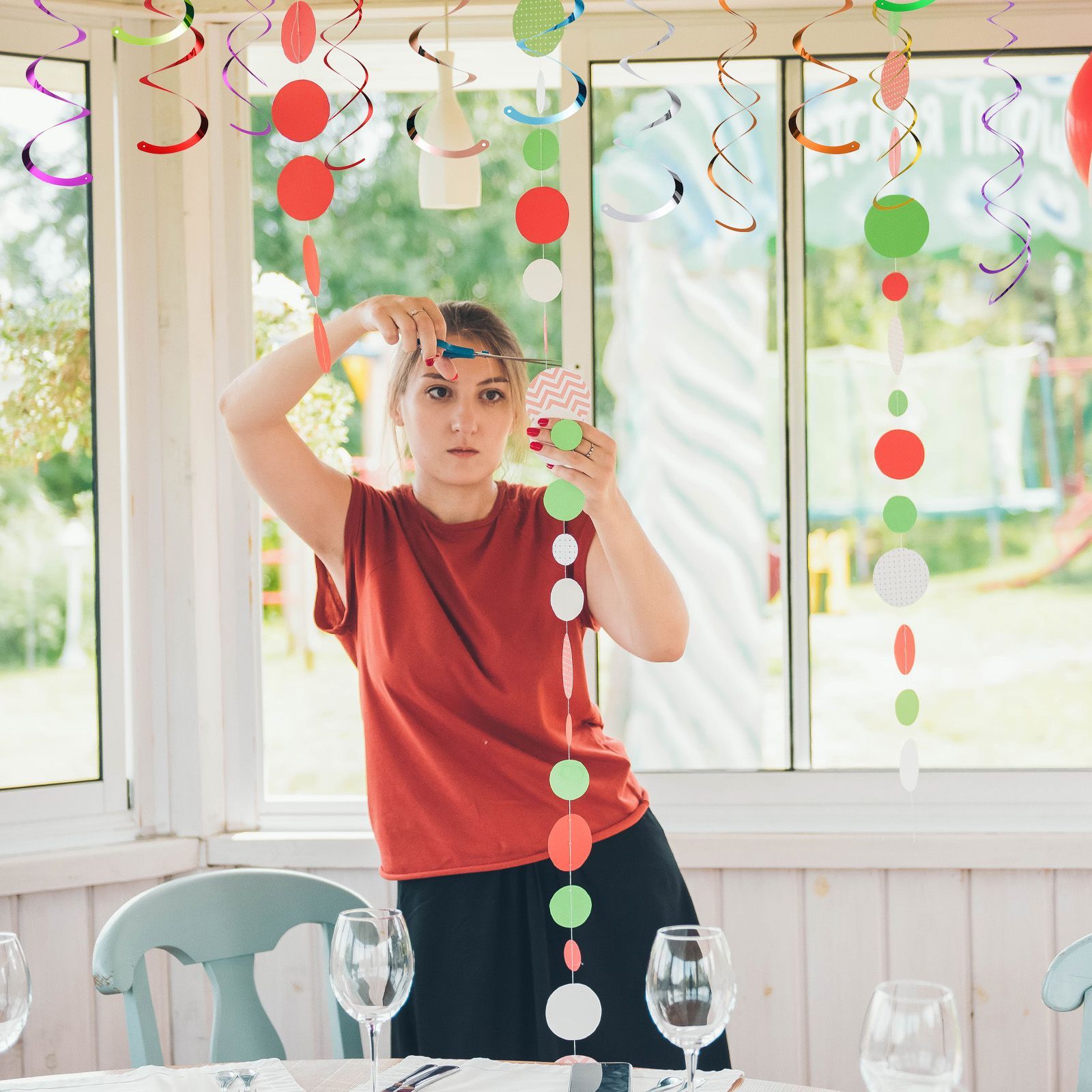 このてんじょうストリーマーは主にパーティーの装飾に使用され、壁、窓、ドア、または棚にこれらの装飾リボンを吊るすか貼り付けて、パーティーに異なる雰囲気を加えることができます。主に誕生日、結婚式、クリスマス、イースター、仮面舞踏会、卒業パーティーなどに使用されます