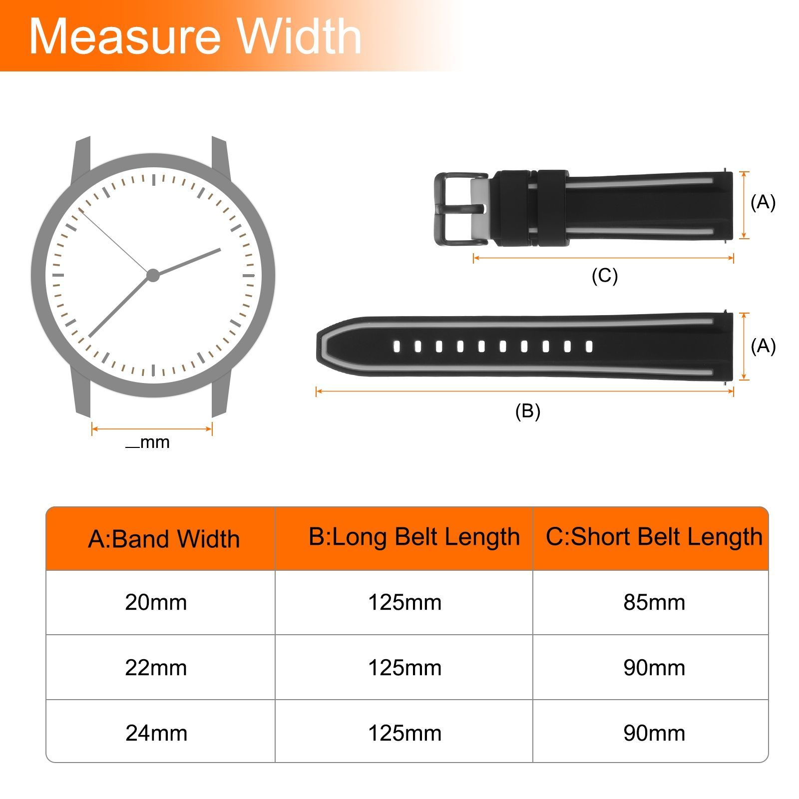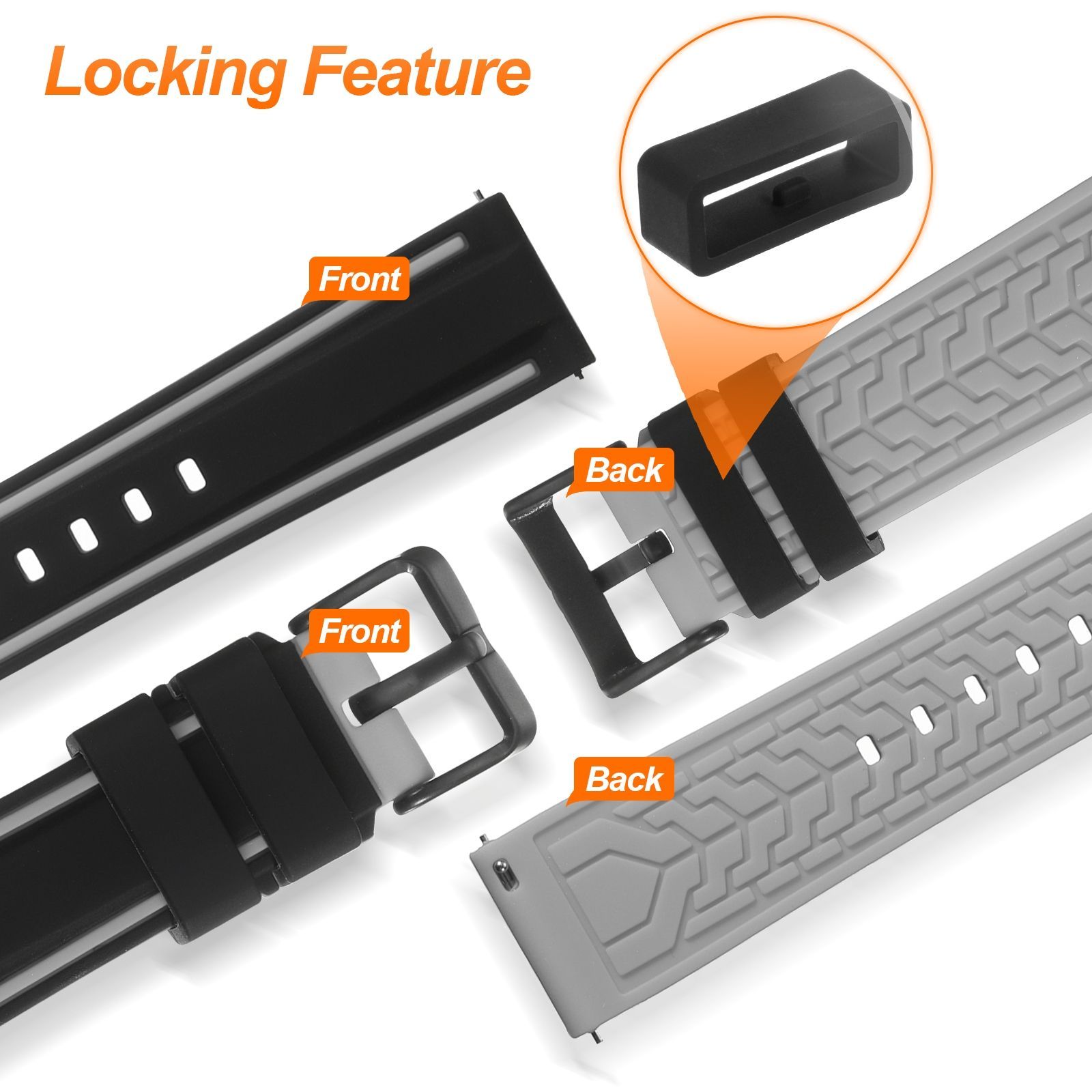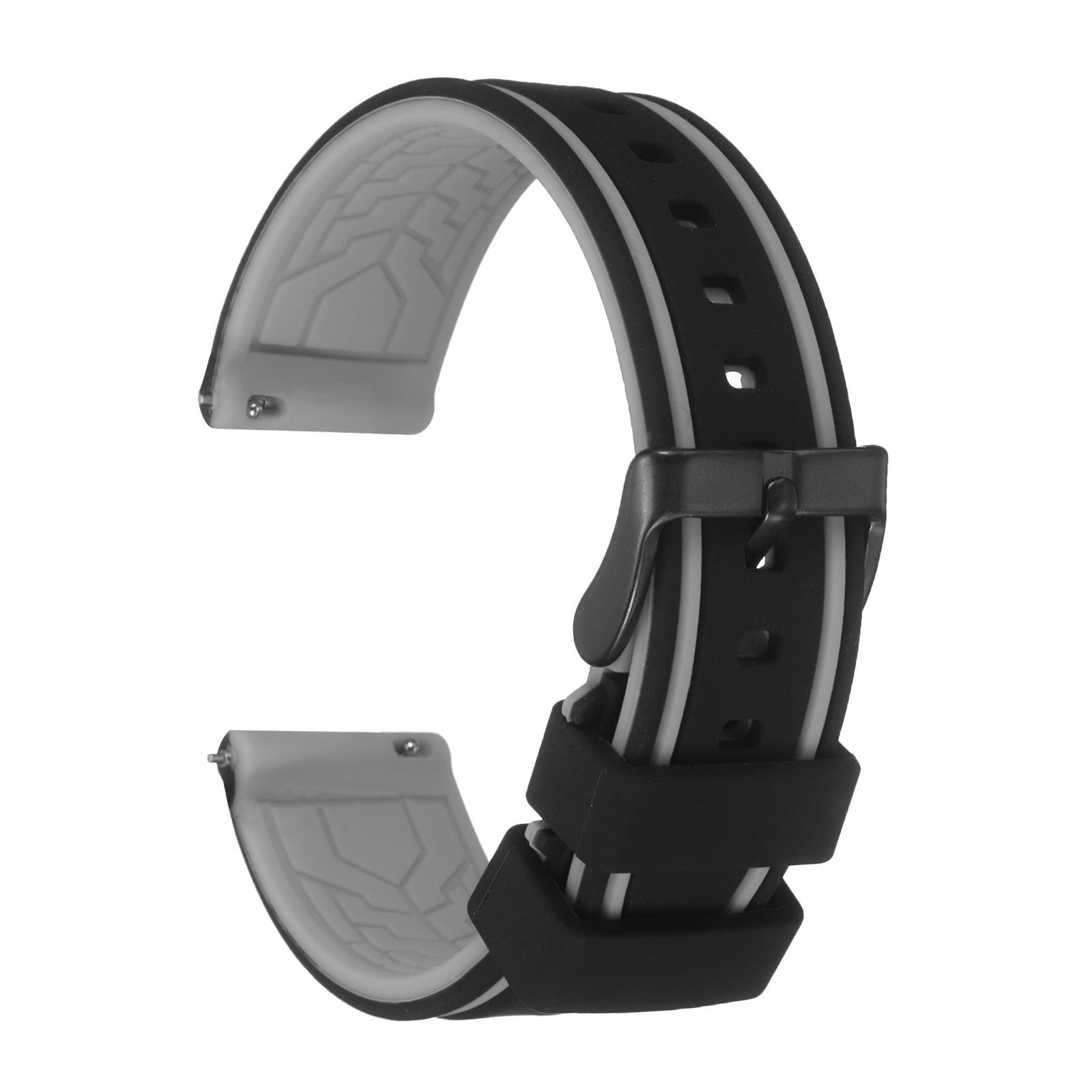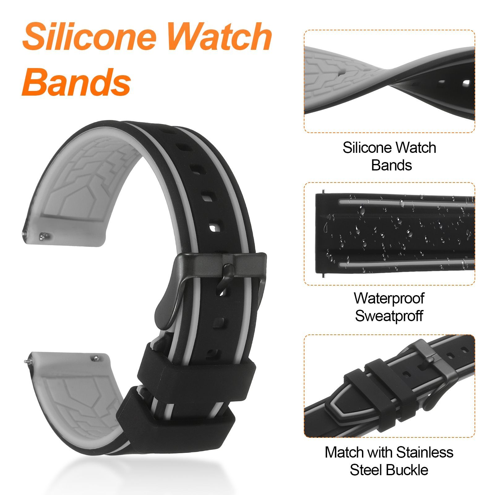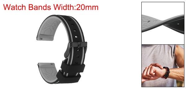 サイズ - ウォッチバンド幅:20mm / 0.8"、ロングベルト長さ:125mm / 5"、ショートベルト長さ:85mm / 3.3";素材:シリコン+ステンレス鋼;カラー:黒グレー;パッケージに含まれるもの:1本 x シリコンウォッチバンド