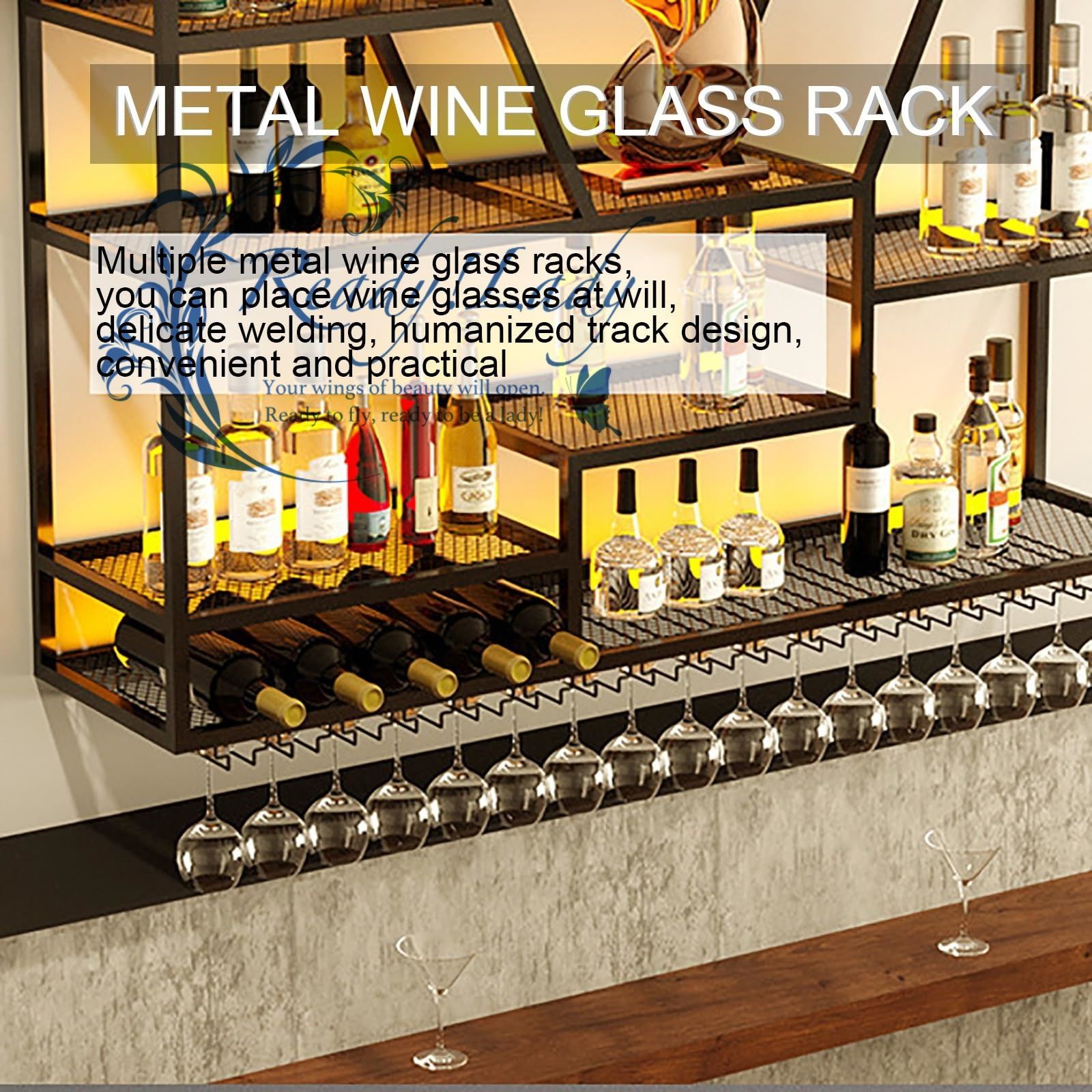 十分な収納力——この壁掛けワイングラスラックには、ワインやボトルを収納するのに十分な高さと深さがあり、いつでもお気に入りのものに簡単にアクセスできます。周囲のガードレールのデザインにより、さまざまなワイン器具や装飾品を置くことができるため、アイテムが落ちたり当たることを心配する必要はありません