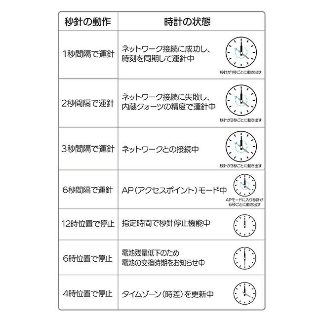 【機能】無線LAN、NTPサーバ指定可能、タイムゾーン設定(UTC地域名選択)、ステップ秒針、指定時間秒針停止機能、電池交換お知らせ機能(秒針の動きでお知らせ)