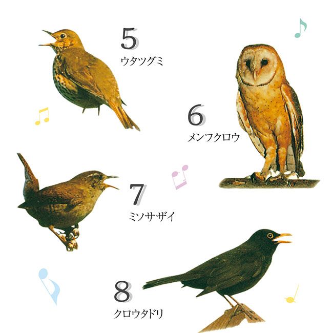 鳥の鳴き声の種類:ズアオアトリ、カッコウ、シジュウカラ、アカゲラ、ウタツグミ、メンフクロウ、ミソサザイ、クロウタドリ、アオガラ、サヨナキドリ、ヨーロッパコマドリ、モリフクロウ