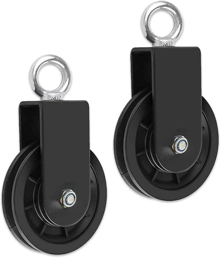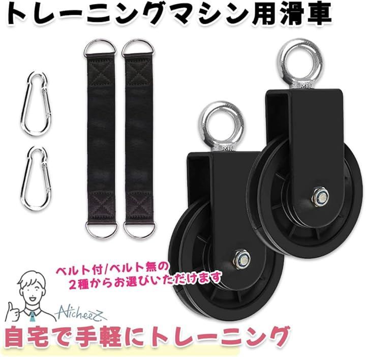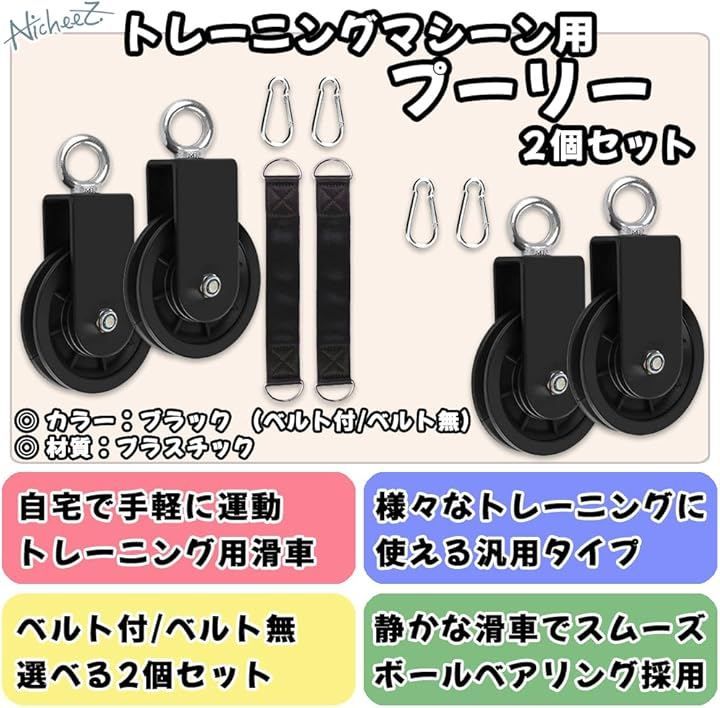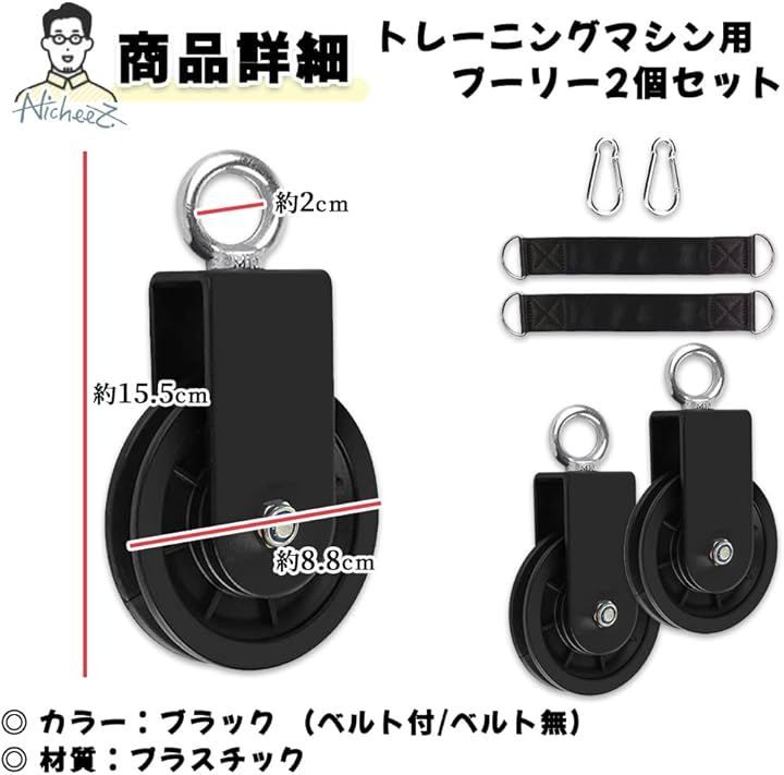 「商品内容」 トレーニングマシン用プーリー2個セット(ベルト付/ベルト無) 材質:プラスチック カラー:ブラック サイズ:横/約8.8cm 高さ/約15.5cm リング内径/約2cm