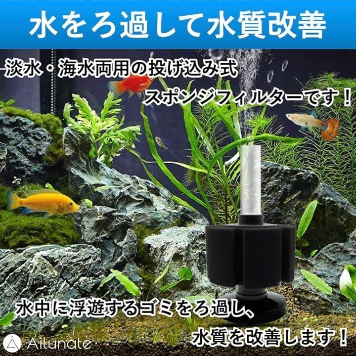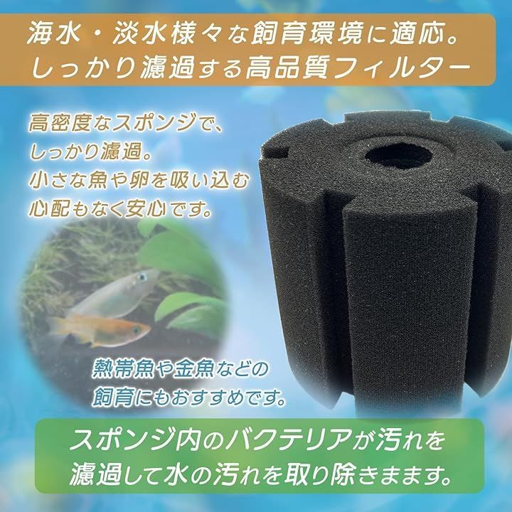 この投げ込み式フィルターは簡単に設置できバクテリアの繁殖を促進するスポンジ素材が使用されており魚や水草にとって理想的な環境を整えます。