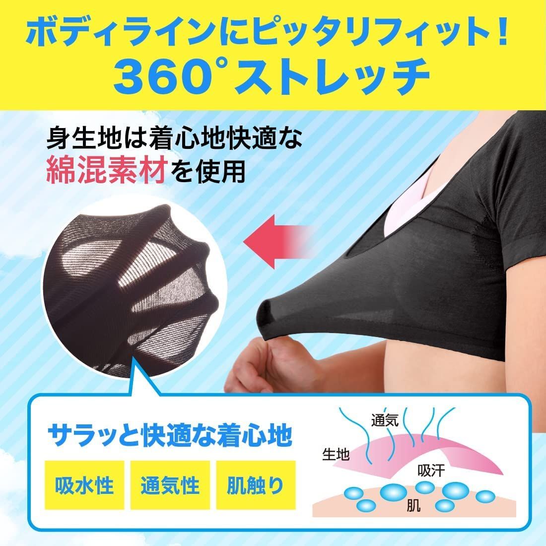 【 ボディラインにピッタリフィット! 】身生地は着心地快適な 綿混素材 を使用。ボディラインにフィットしやすい360°ストレッチ。サラッと快適な着心地で 肌触り が良く、 通気性 吸水性 に優れています。