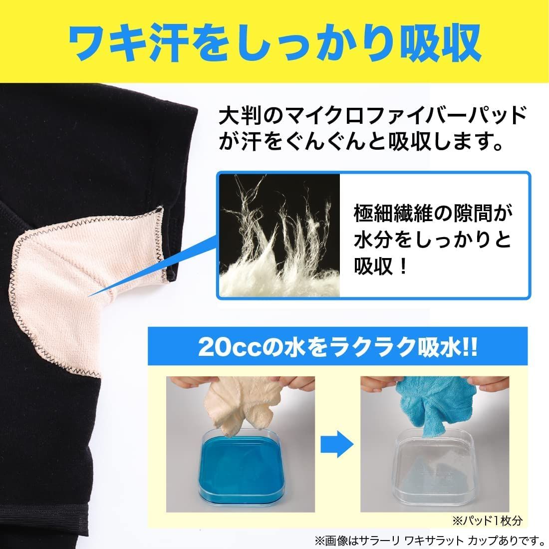 【 ワキ汗をしっかり吸収 】大判のマイクロファイバーパッドが汗をぐんぐんと吸収します。極細繊維の隙間が水分をしっかりと吸収!パッド一枚で20ccの水をラクラク吸水します。