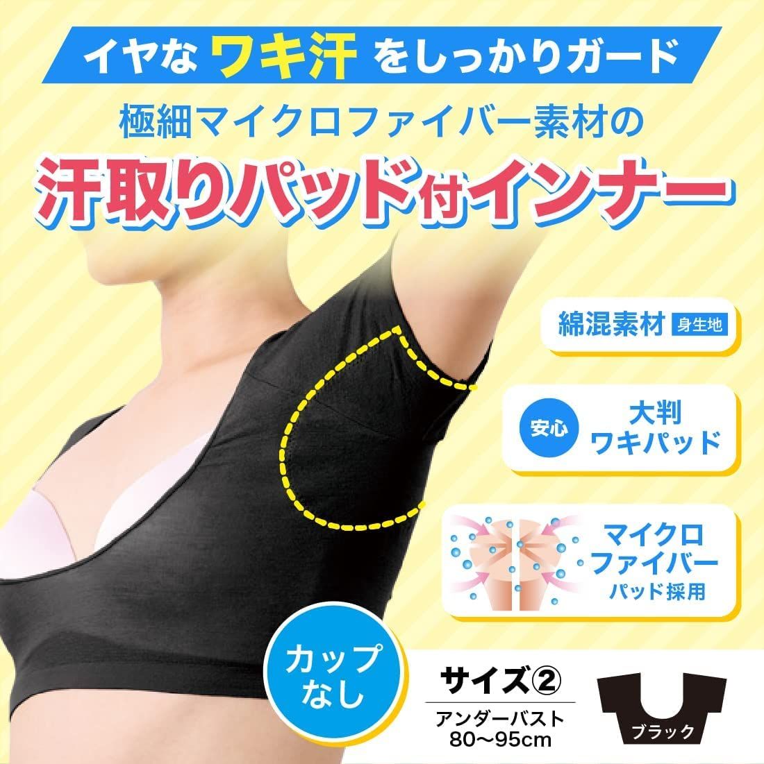 【 汗取りパッド付インナー カップなし 】イヤなワキ汗をしっかりガードする極細マイクロファイバー素材の汗取りパッド付インナー 。汗とりパッドとインナーが一体型なのでパッドがズレず使いやすい。