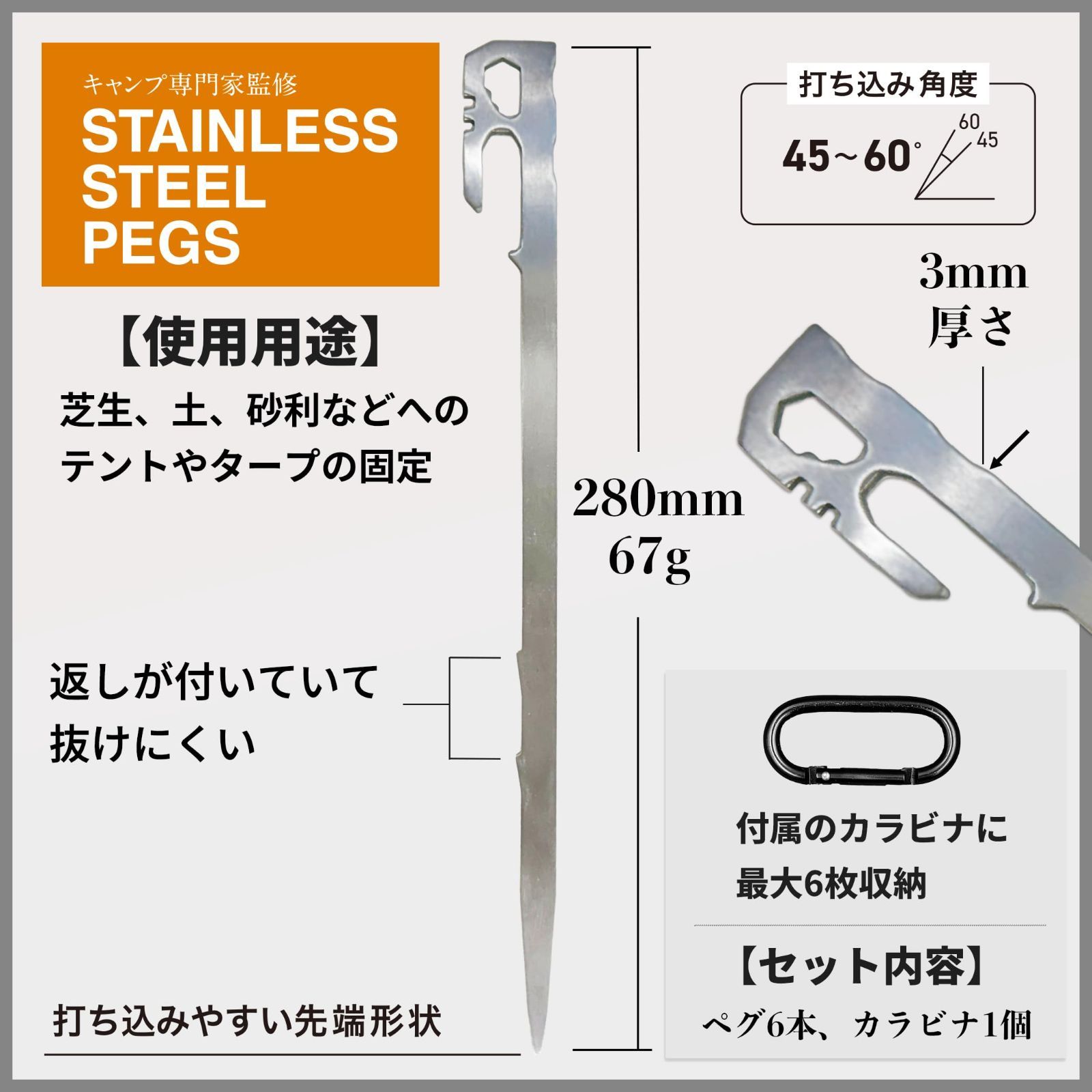 【サイズ】約21x3x280mm/本 【重量】約66g/本 【材質】ステンレス鋼 SUS420 【付属品】カラビナ2個 【使用用途】芝生、土、砂利などのテント固定やタープの固定 【カラー】シルバー