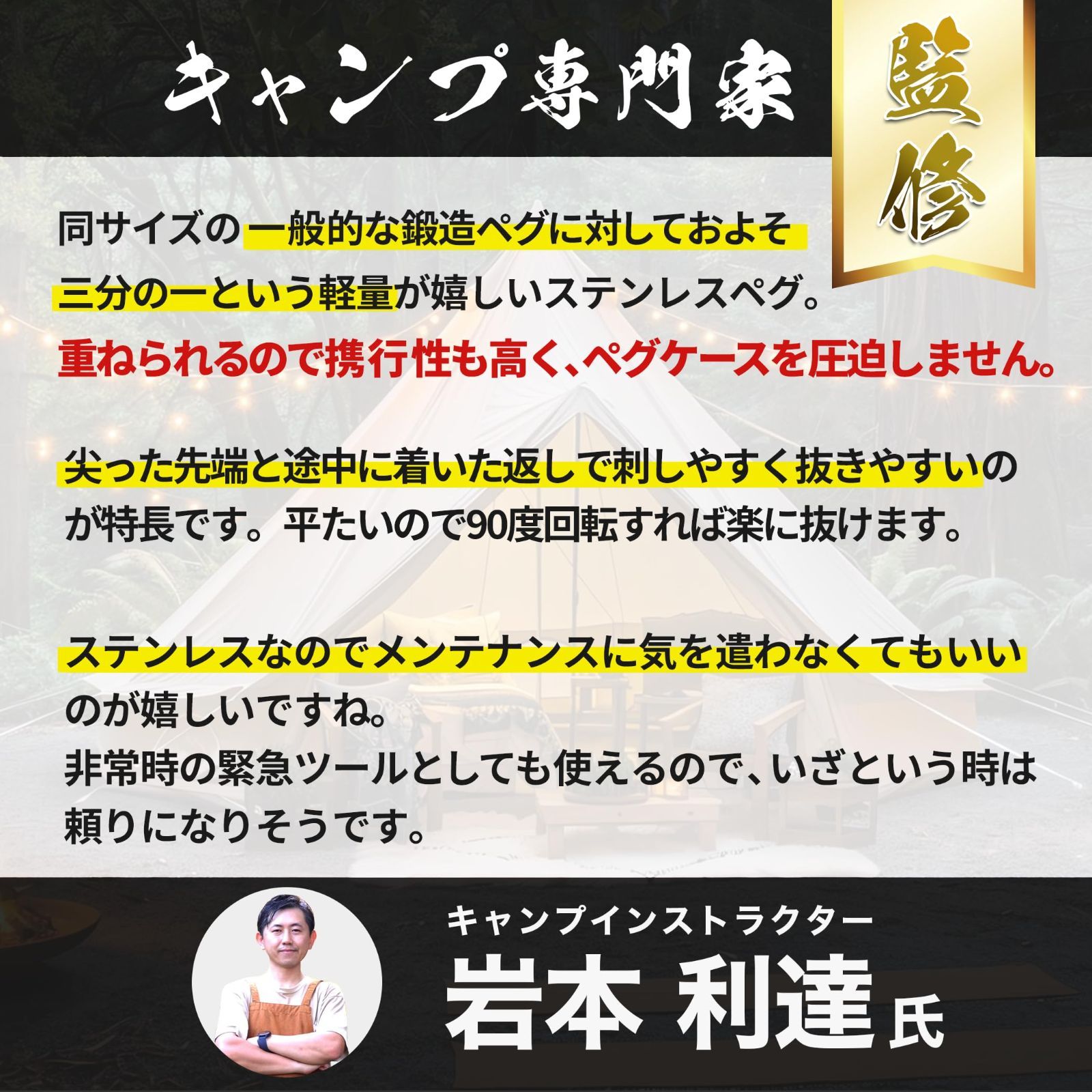 【高硬度ステンレス鋼を採用】薄型のペグはどうしても折れが気になります。高硬度のステンレス鋼 SUS420を採用することで、折れにくく堅牢なペグになっています。また、適度に「しなり」をもたせることにより、テンションがかかった場合にも適度に力を逃がすことで耐える構造です。