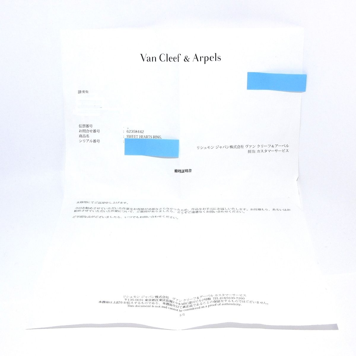 付属品:修理証明書