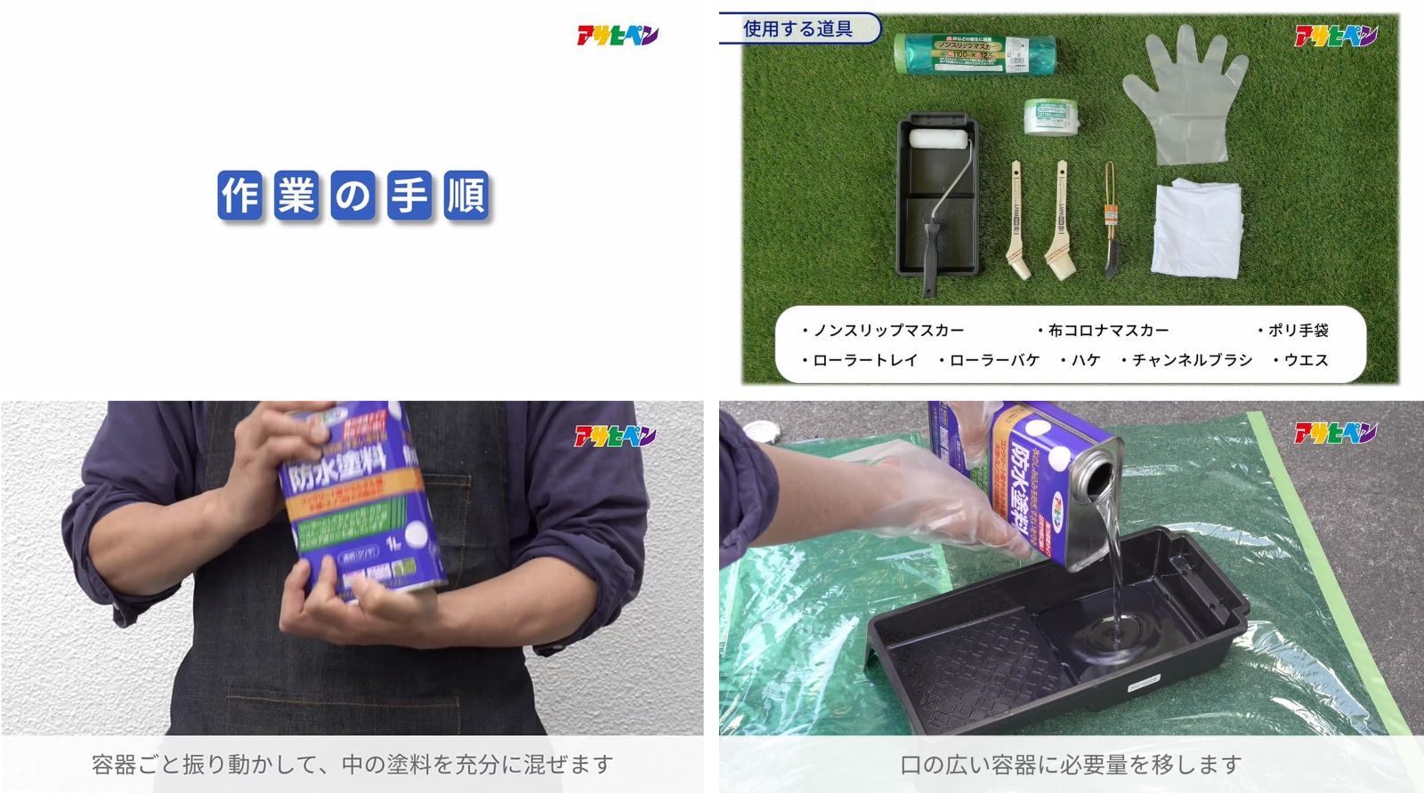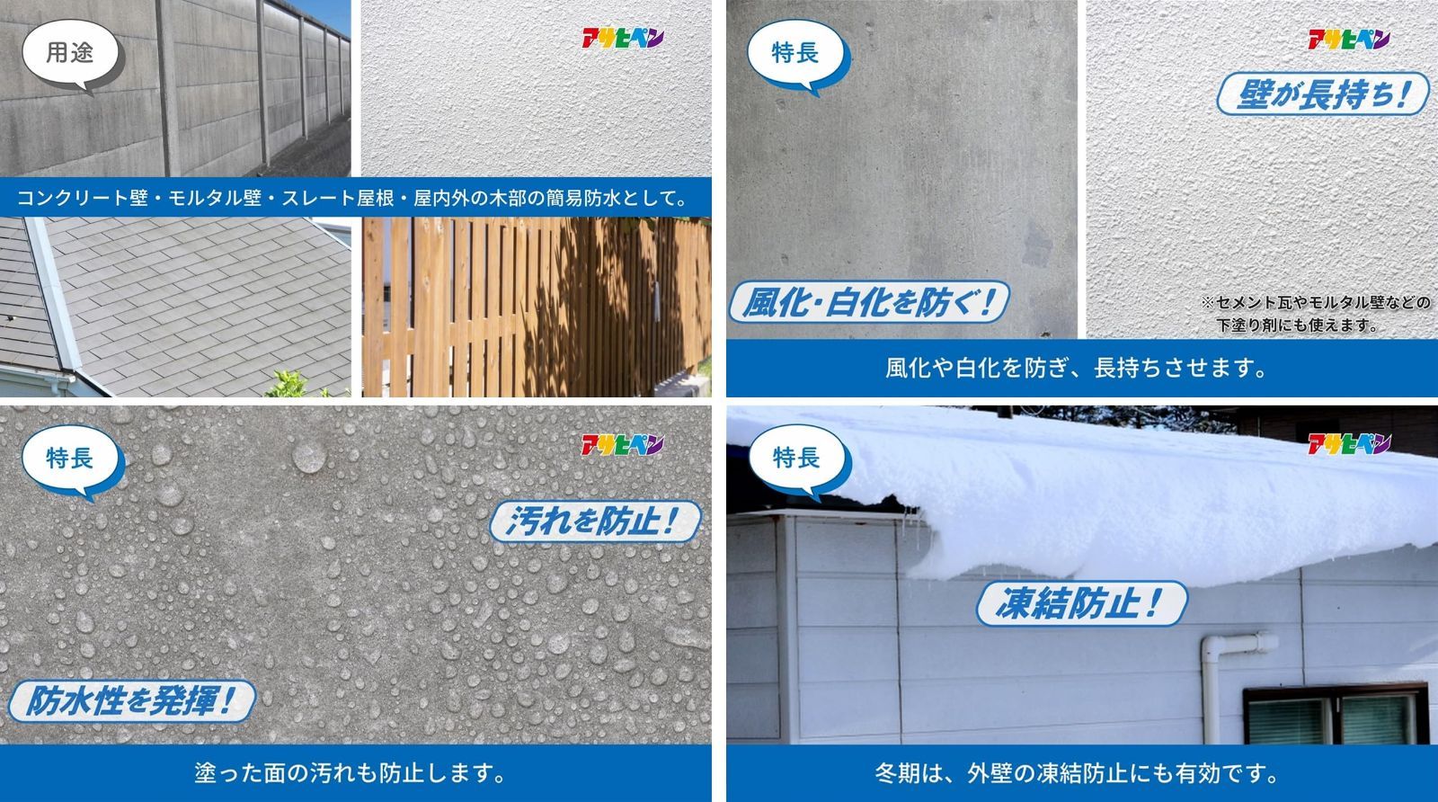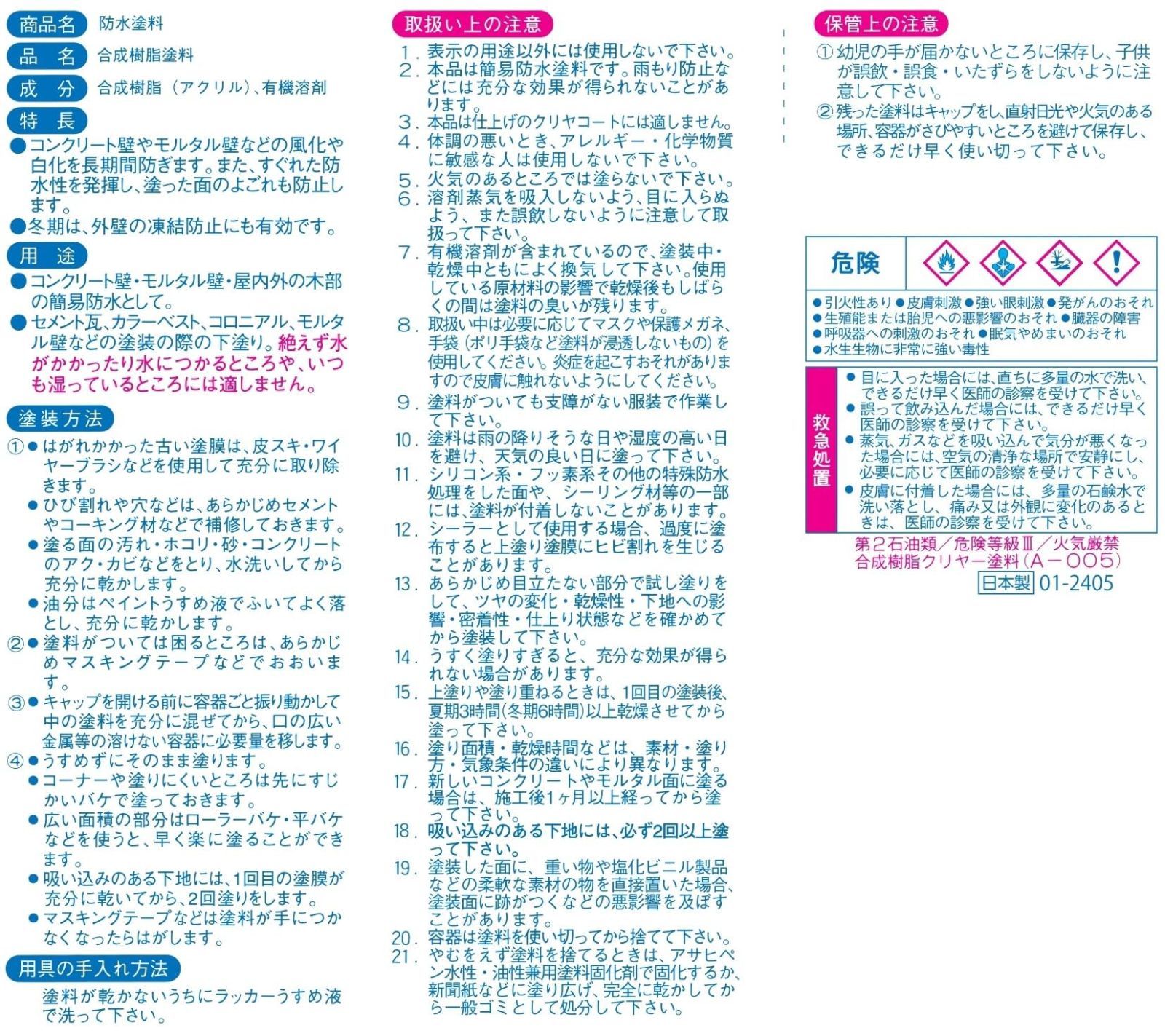用途:(屋内外区分:屋外用)コンクリート壁やモルタル壁、木部、スノコなどの防水に。シーラーとしてセメント瓦・カラーベスト、コロニアルなどの下塗りに。モルタル壁などの下塗りに。