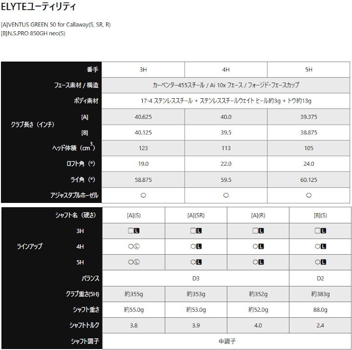 「ELYTEユーティリティ」の番手ラインアップは、3H、4H、5Hの3種類で、ロフト角はそれぞれ、19度、22度、24度となっています。