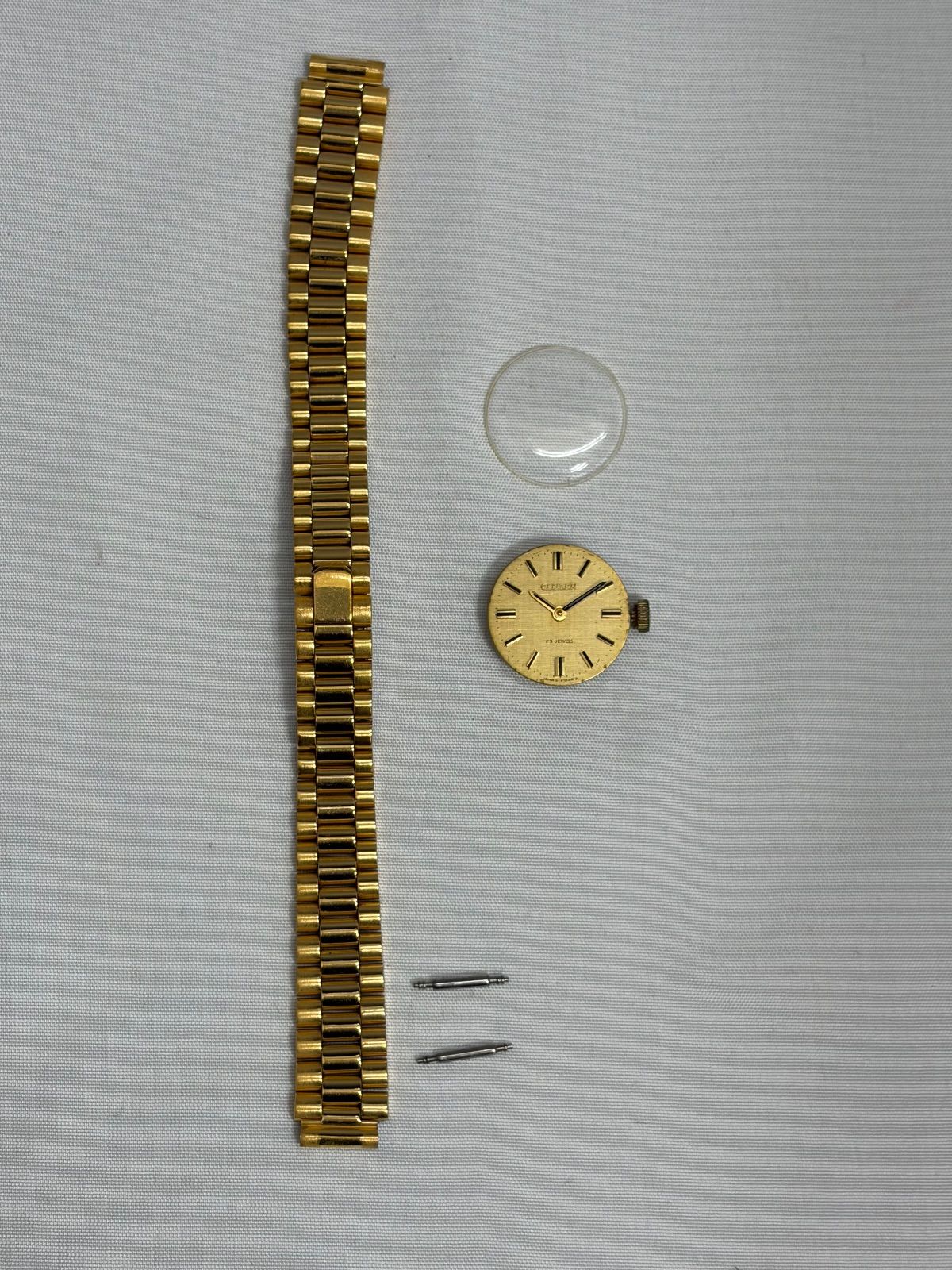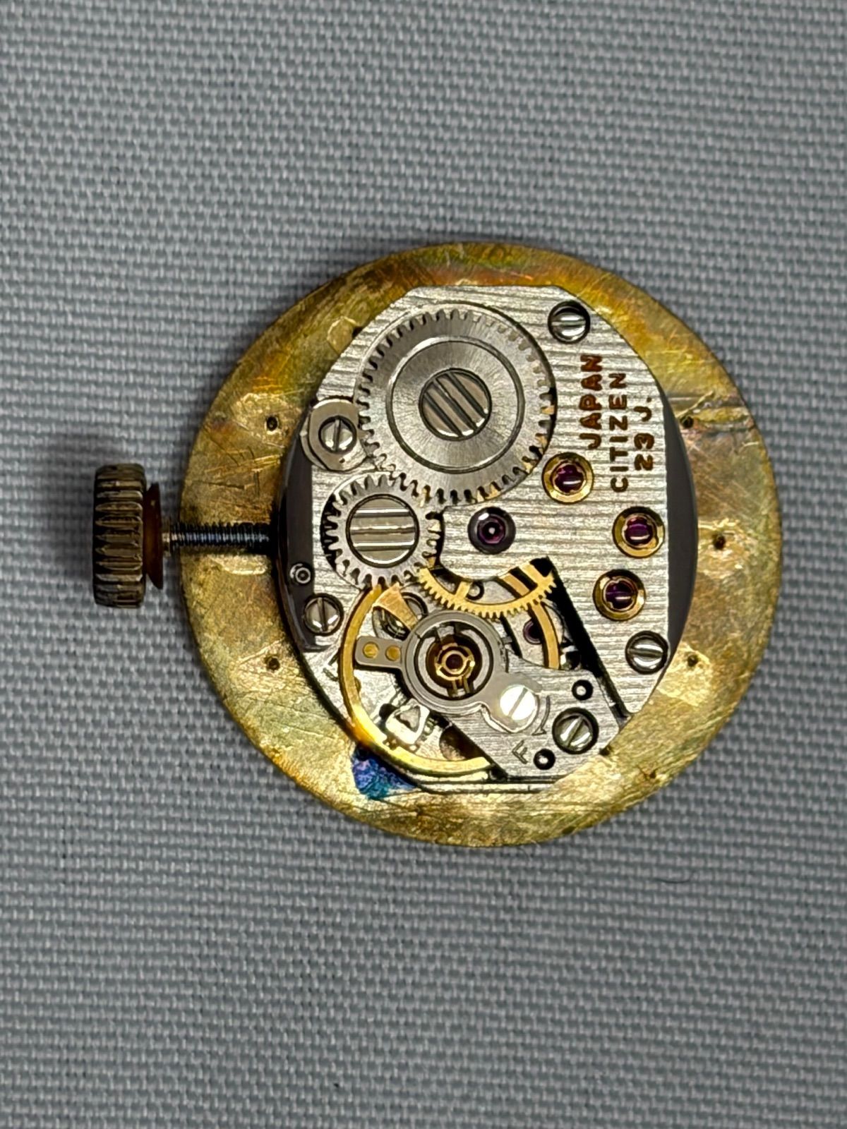 裏蓋、ケースが有りません。風防に細かいキズが有ります。文字盤に若干の小傷が有ります。ベルトは社外品です。動作確認済み。