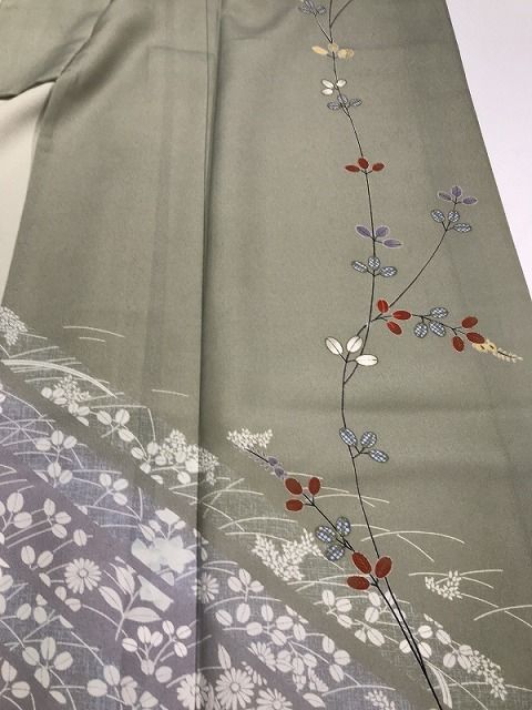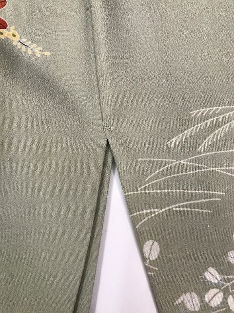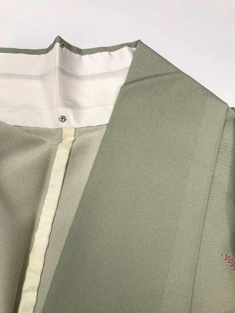 【中古】 Sサイズ 単衣着物 化繊 付け下げ 付下げ訪問着 青磁色地に枝花模様 袷着物 洗える着物