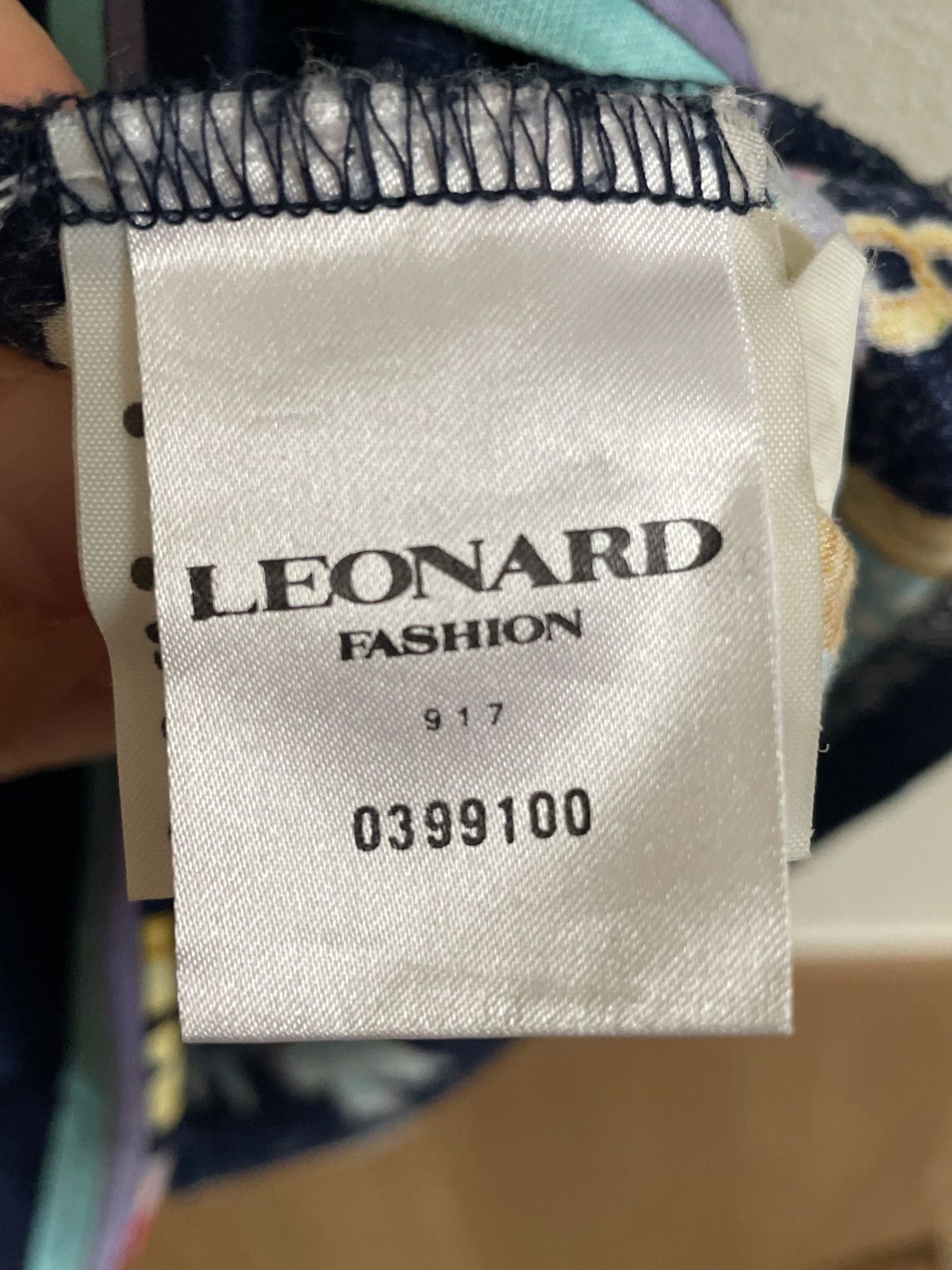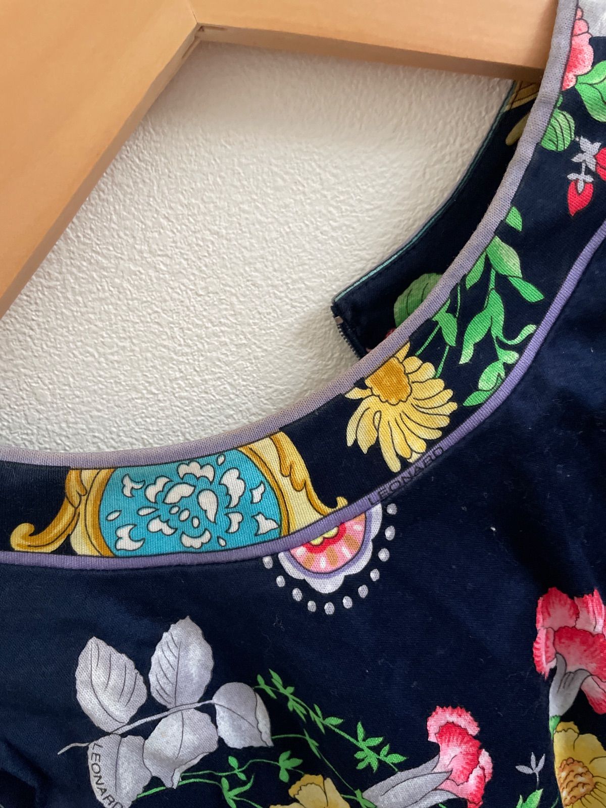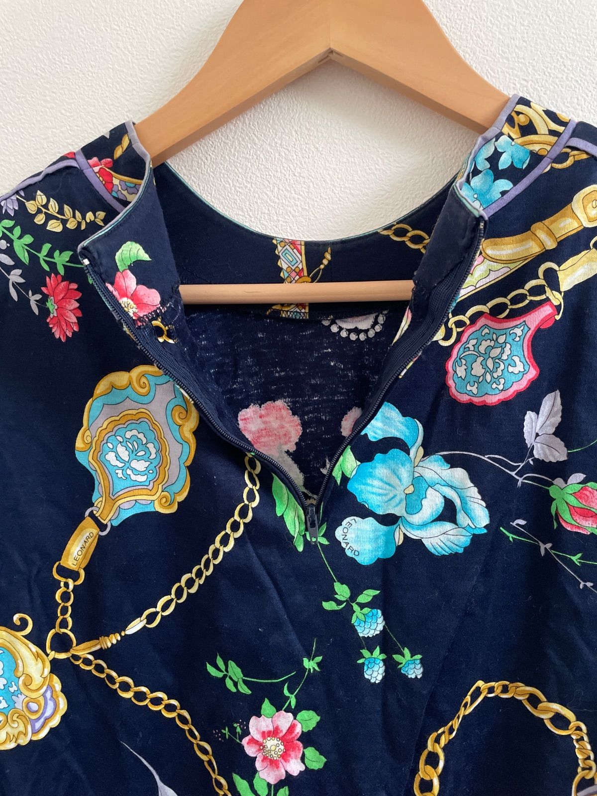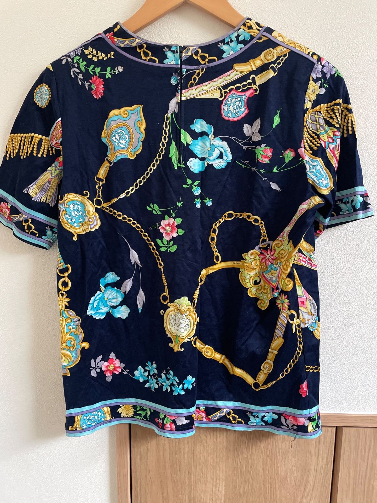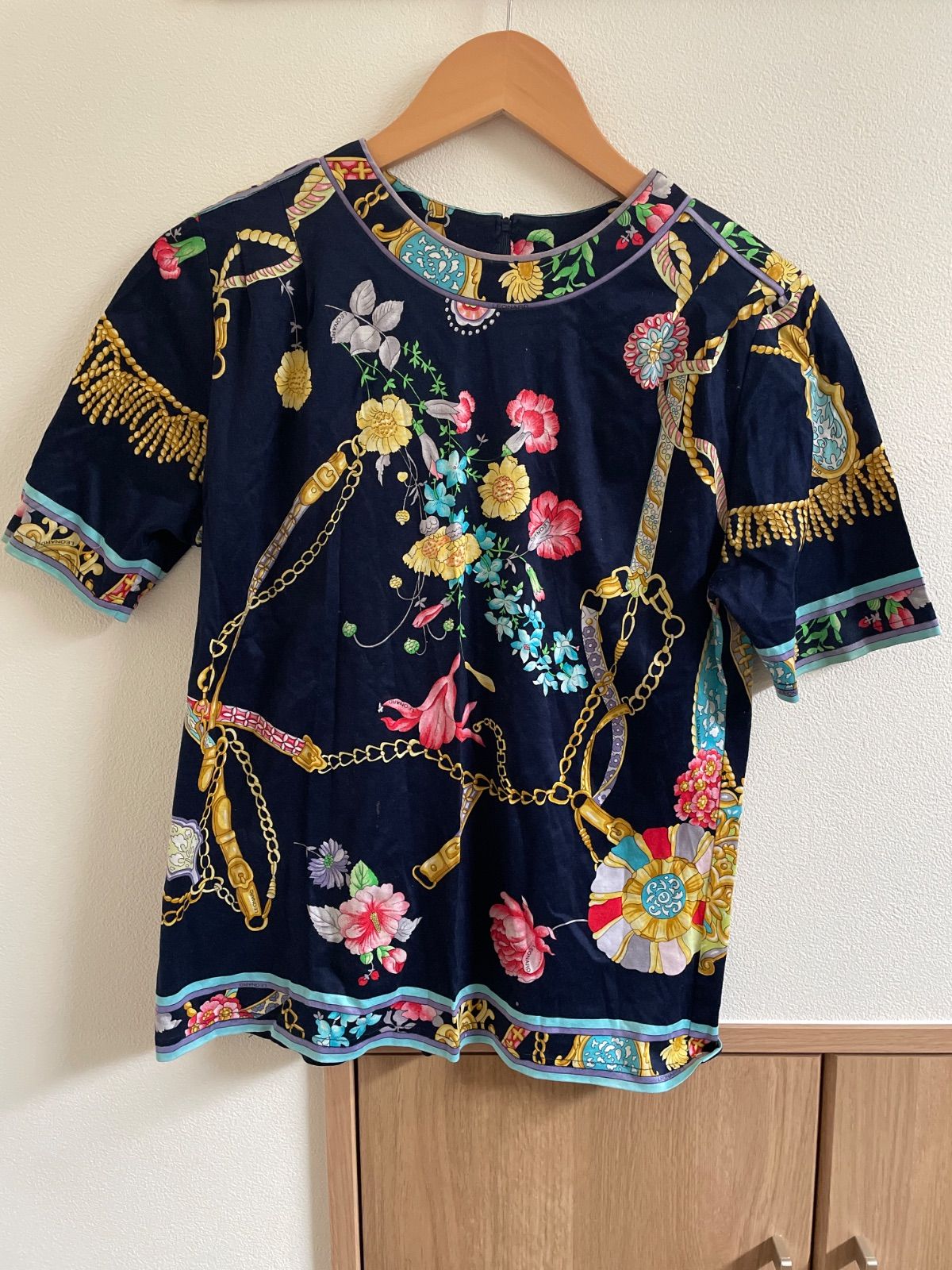 フランスのファッションブランド「レオナール(LEONARD)」による、花柄とチェーンのプリントが特徴的な半袖ブラウスです。