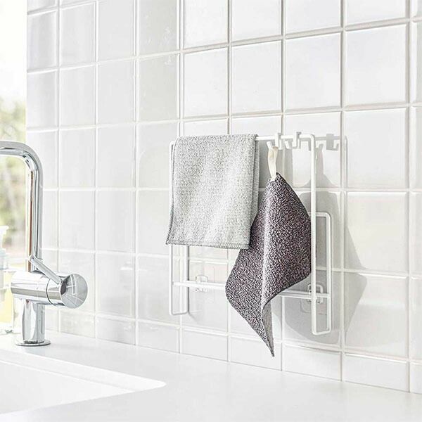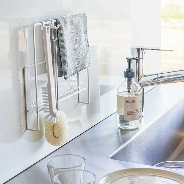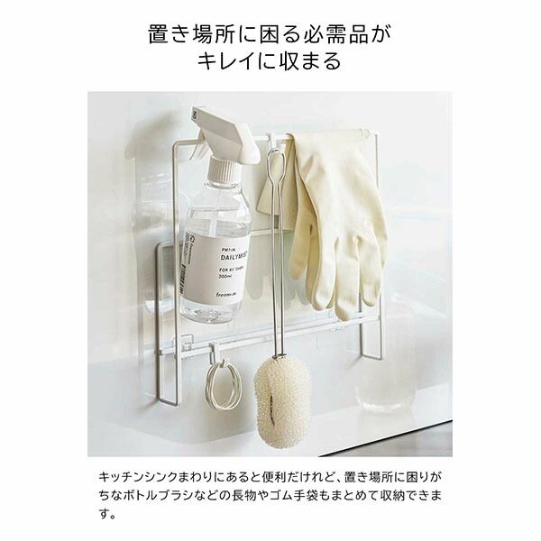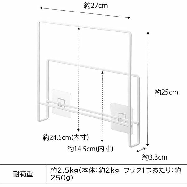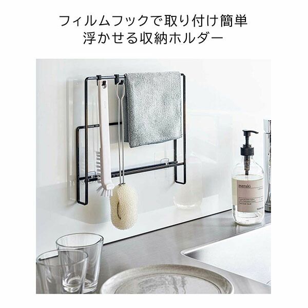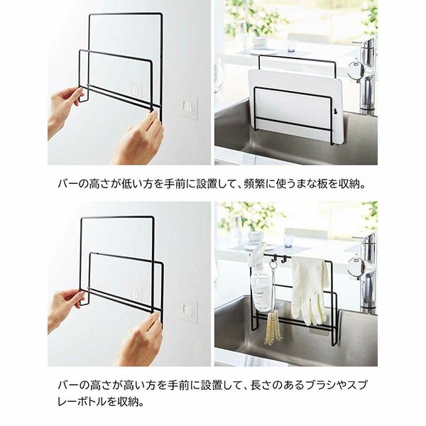 キッチンの水まわり収納に、フィルムフックで取り付け簡単な収納ラックです。置き場所に困る、布巾や大きめまな板、丸いまな板が収まり便利に使えます。また、高さのある方を手前に設置すればボトルブラシなどの長いお手入れグッズを掛けて収納できる両面設置が可能なデザインです。付属のフックはお好みの位置に取り付けられるので輪ゴムや小物類など、必要なものがまとめられます。※画像や説明に記載のカラーやサイズが選択欄にない場合、そちらの商品は現在取り扱っておりません。