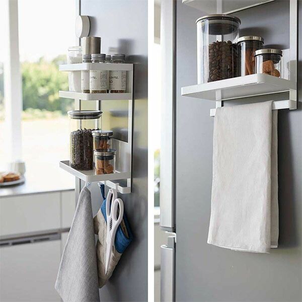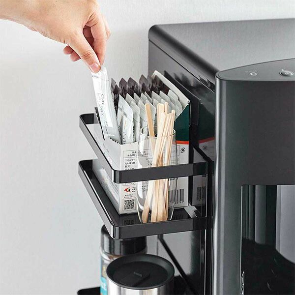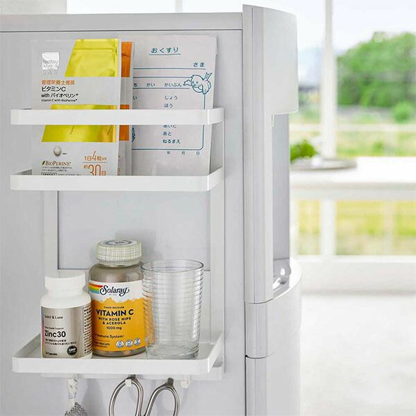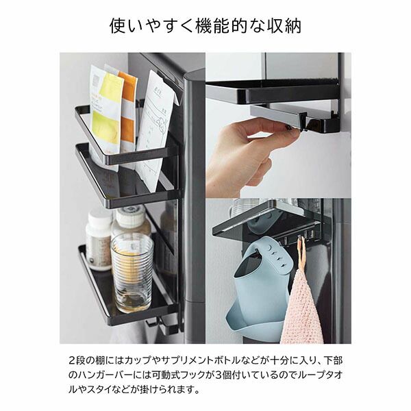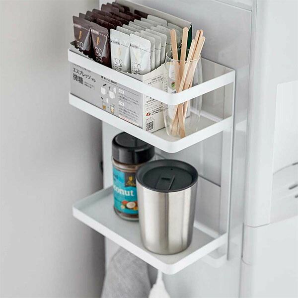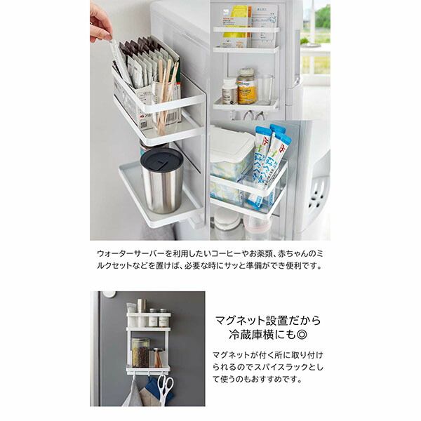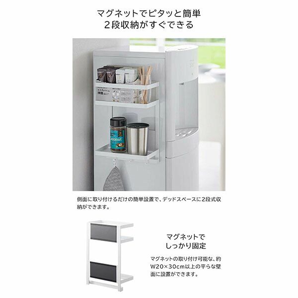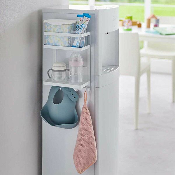 ウォーターサーバー横にマグネットで取り付ける収納ラックです。お薬やサプリメント、コーヒー、赤ちゃん用のミルクセットなど、サーバー横にあると便利なアイテムがサッと取り出せて快適に使えます。日々使うものの置き場所として様々な用途に合わせた収納が可能です。一番下にはバーがあり、タオルを掛けたり付属の可動式フックを使ってスタイや小物を掛けることができます。マグネット式だから、ウォーターサーバーの横だけでなく冷蔵庫に設置してスパイスラックとして使うのもおすすめです。