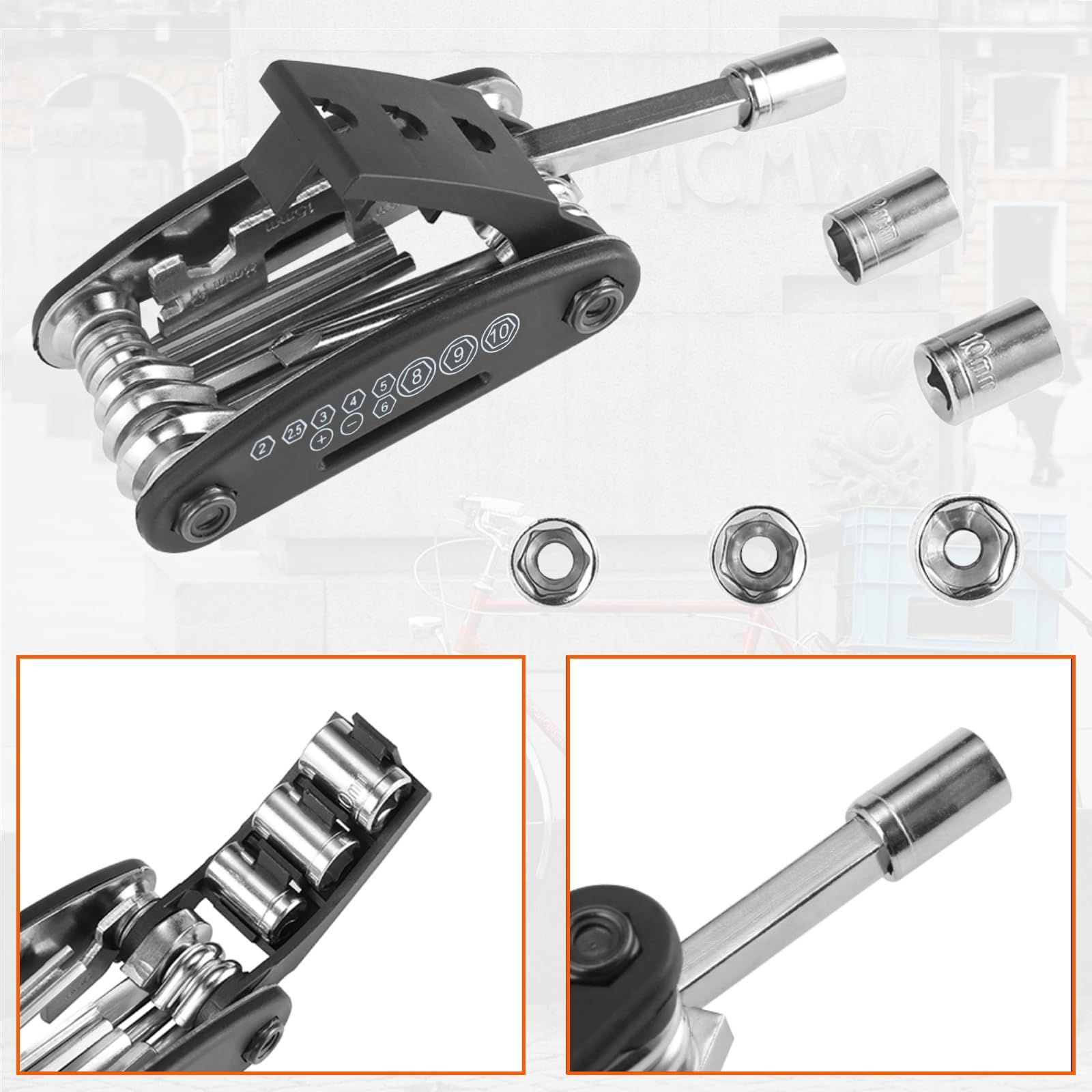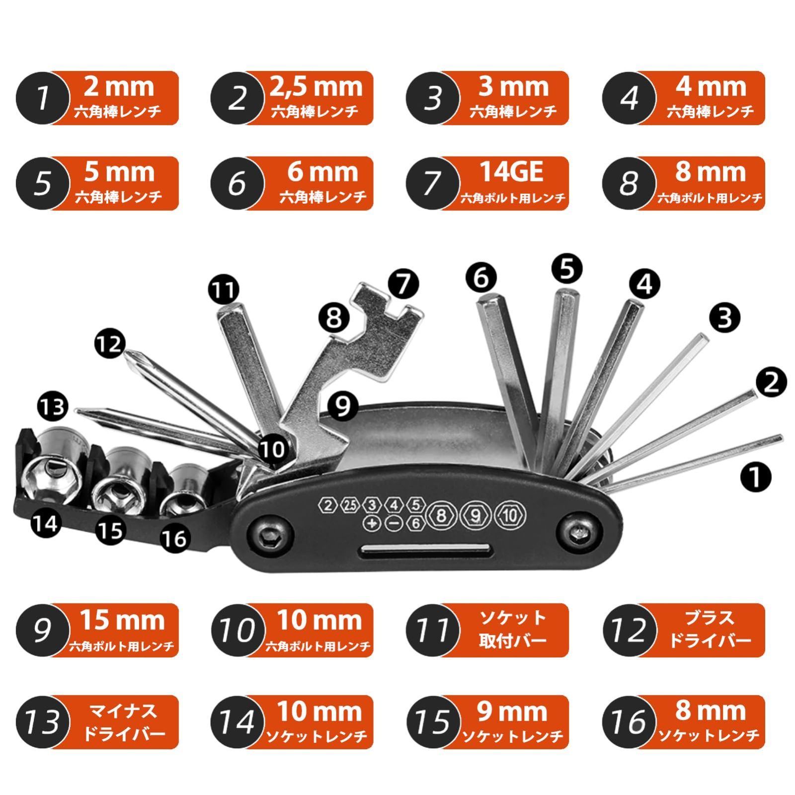 【16in1多機能】2/2.5/3/4/5/6mm六角棒レンチ、14GE/8/10/15mm六角ボルトレンチ、プラス(+)ドライバー、マイナス(-)ドライバー、ソケット取付バー、8/9/10mmソケットレンチ。自転車の修理、整備、点検、メンテナンスなどのとっさのトラブルに対処できる工具セット。
