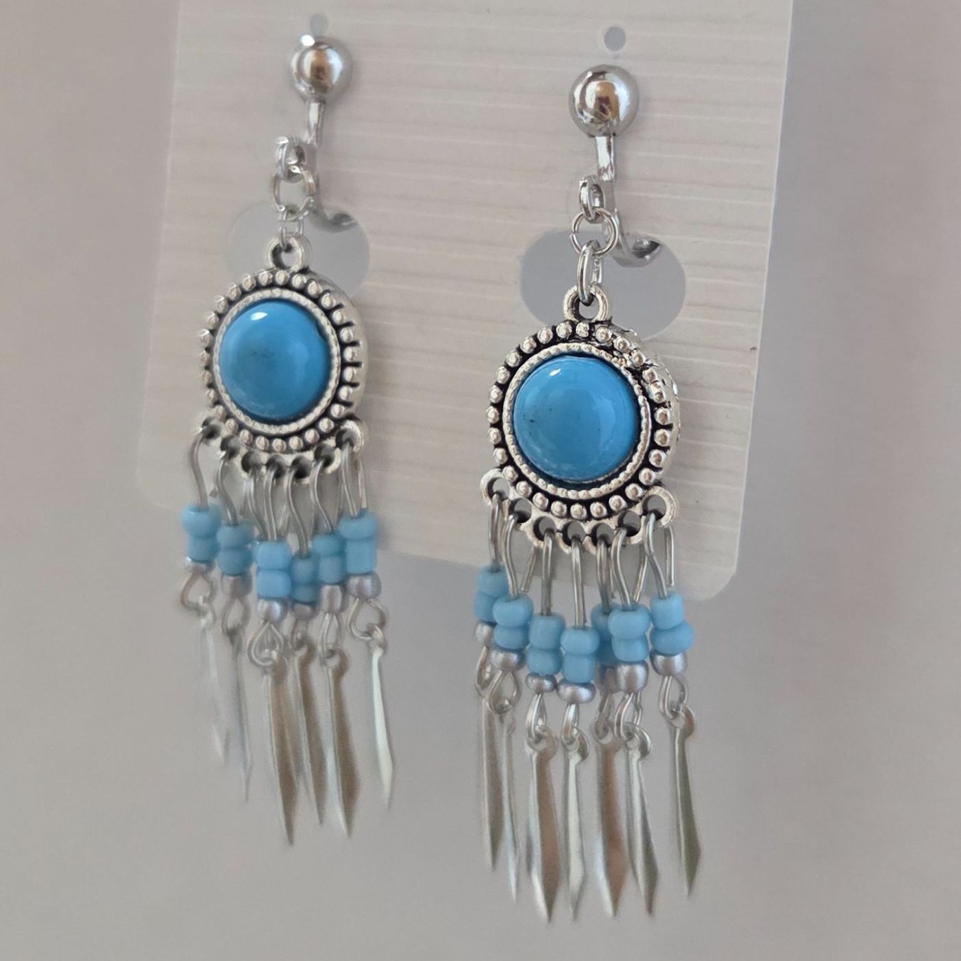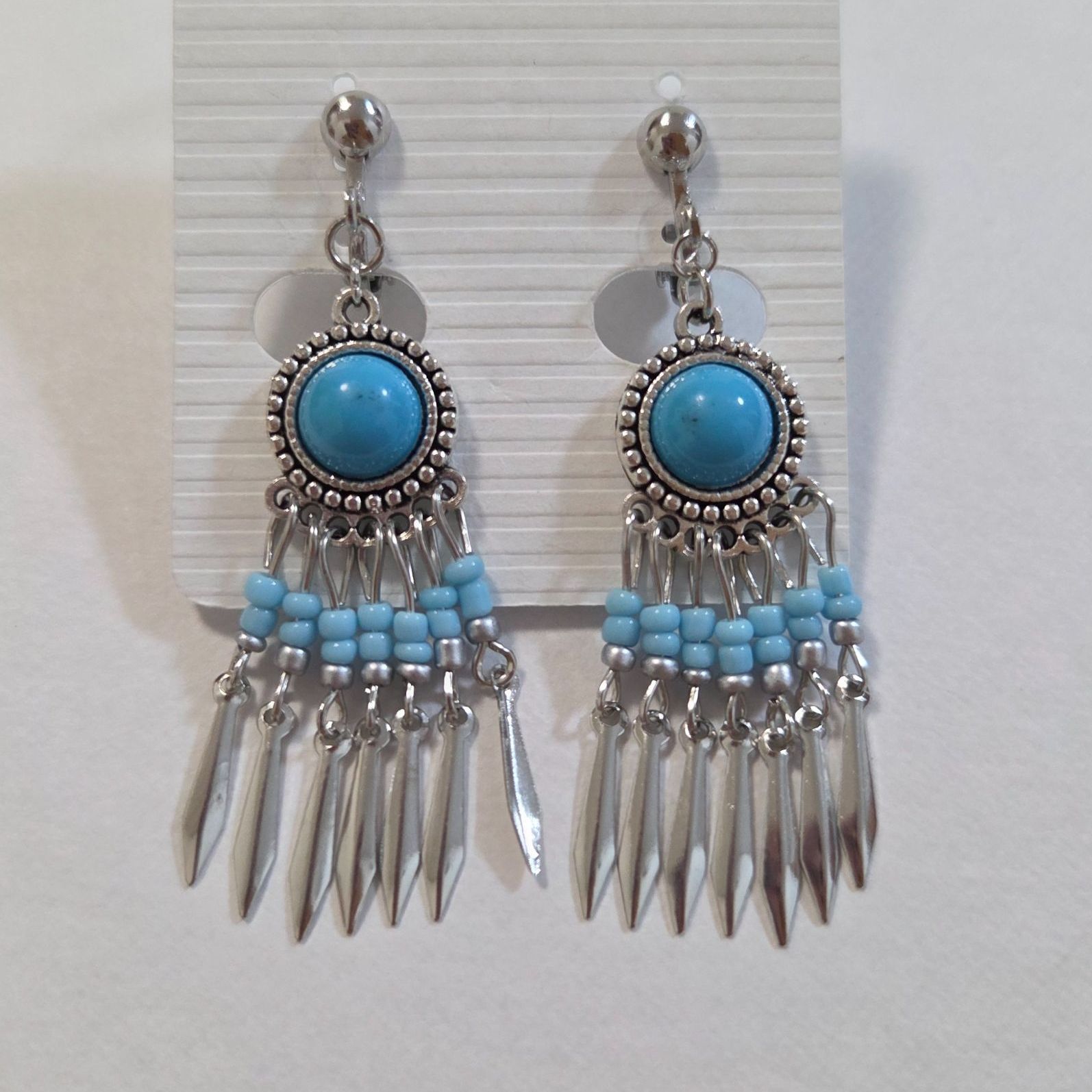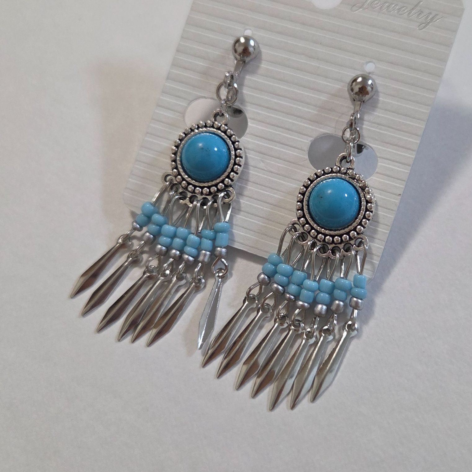 フリンジデザインのシルバーイヤリング、ビーズとターコイズ調装飾付き。