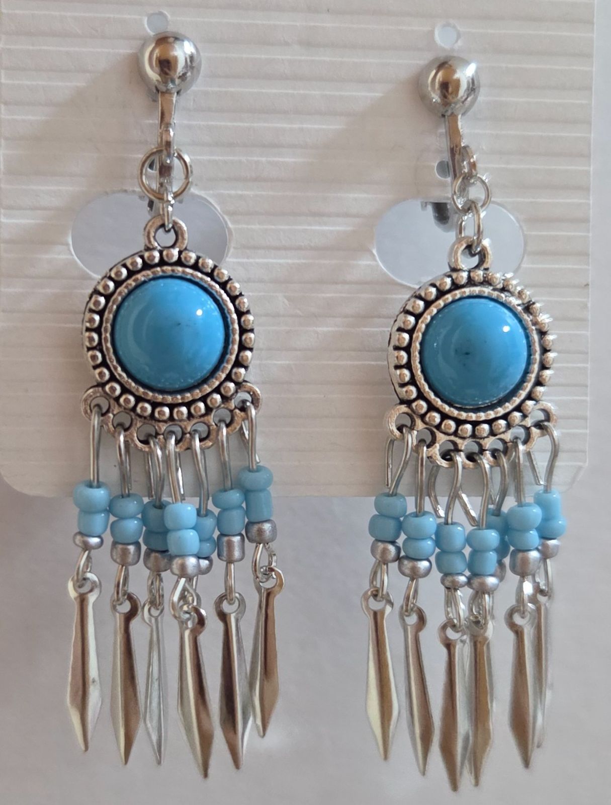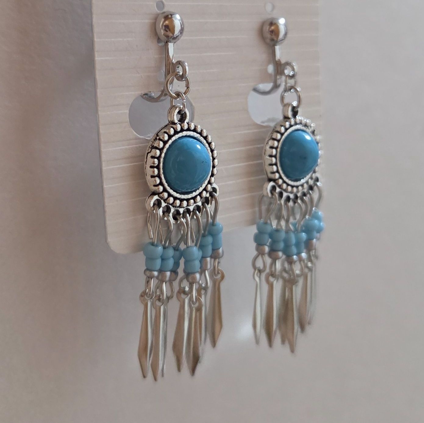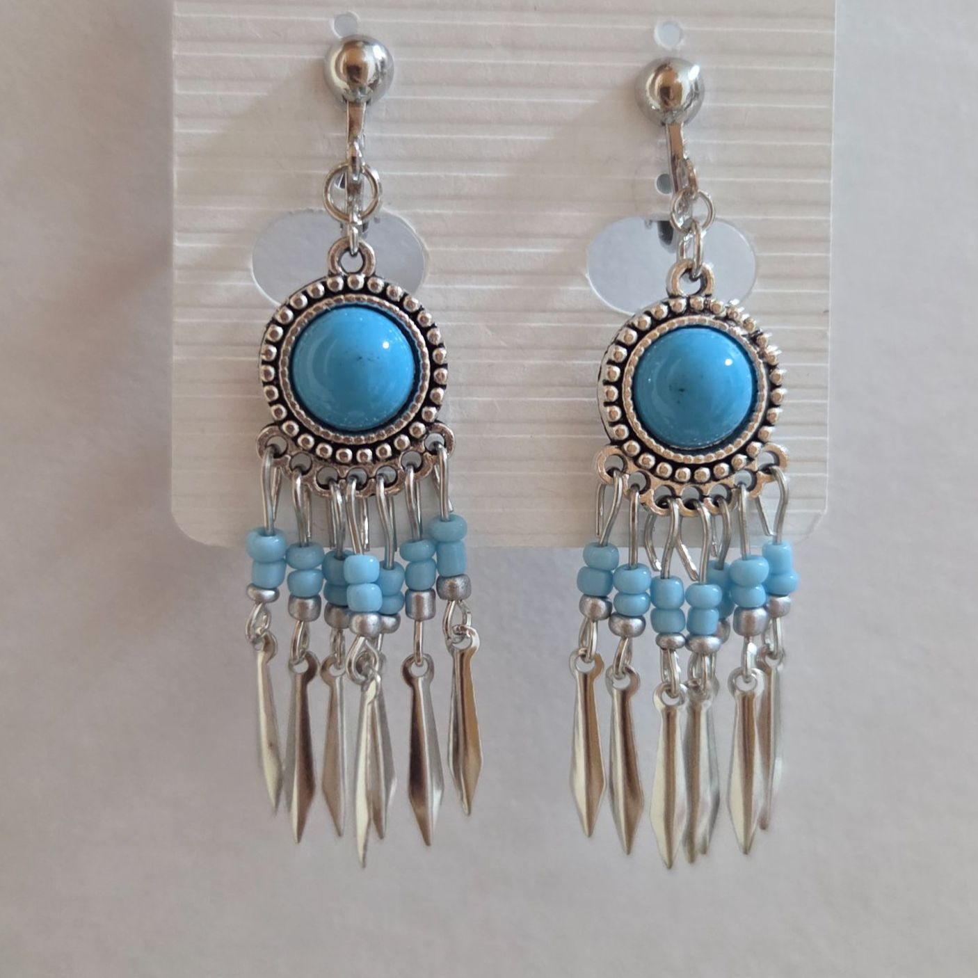 フリンジデザインのシルバーイヤリング、ビーズとターコイズ調装飾付き。