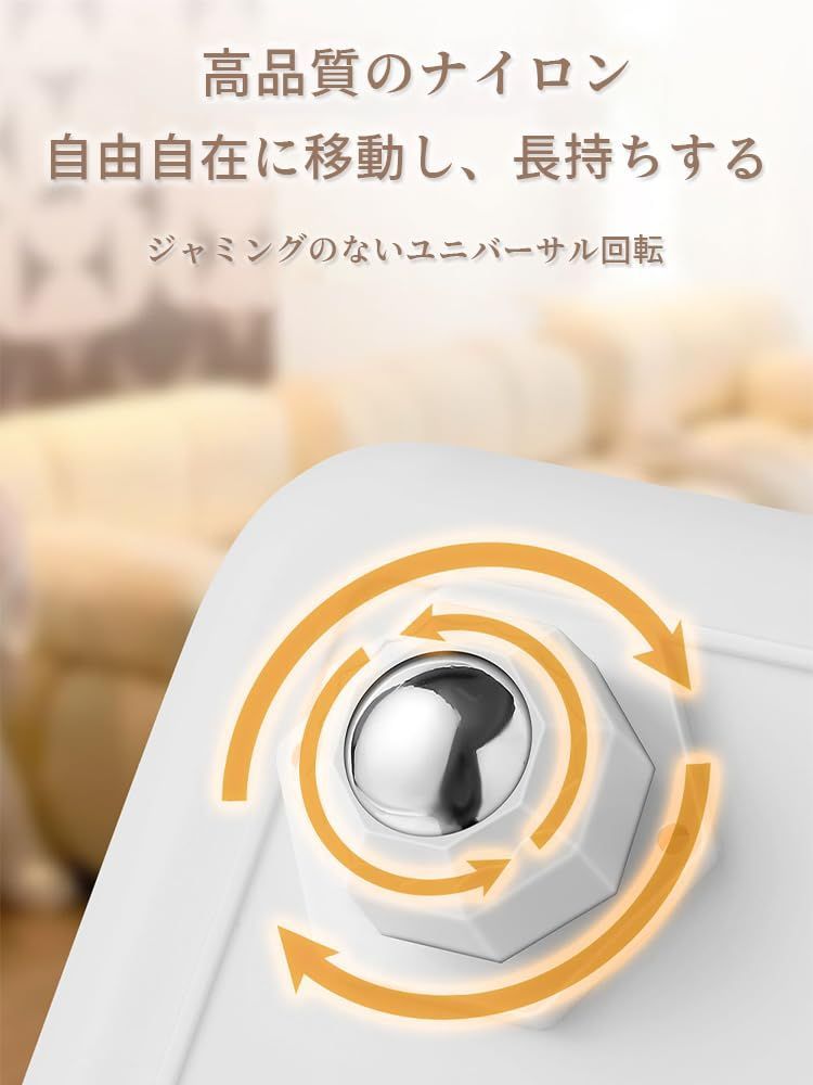 【製品特長】 ボールキャスター このキャスターは硬質ナイロン製車輪を使用しており、360度スムーズに動作します。そのため、木造の床に傷をつける心配はありません。本体はABS樹脂で作られており、耐久性に優れています。。高さに制限がある場所、奥行きがある場所、狭い場所で順調に移動し重宝するアイテムです。