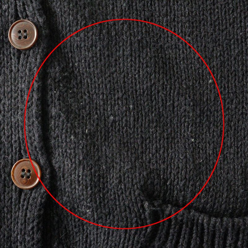 ブランドタグの糸が外れております。また毛羽立ち、品質表示タグに汚れが見受けられます。