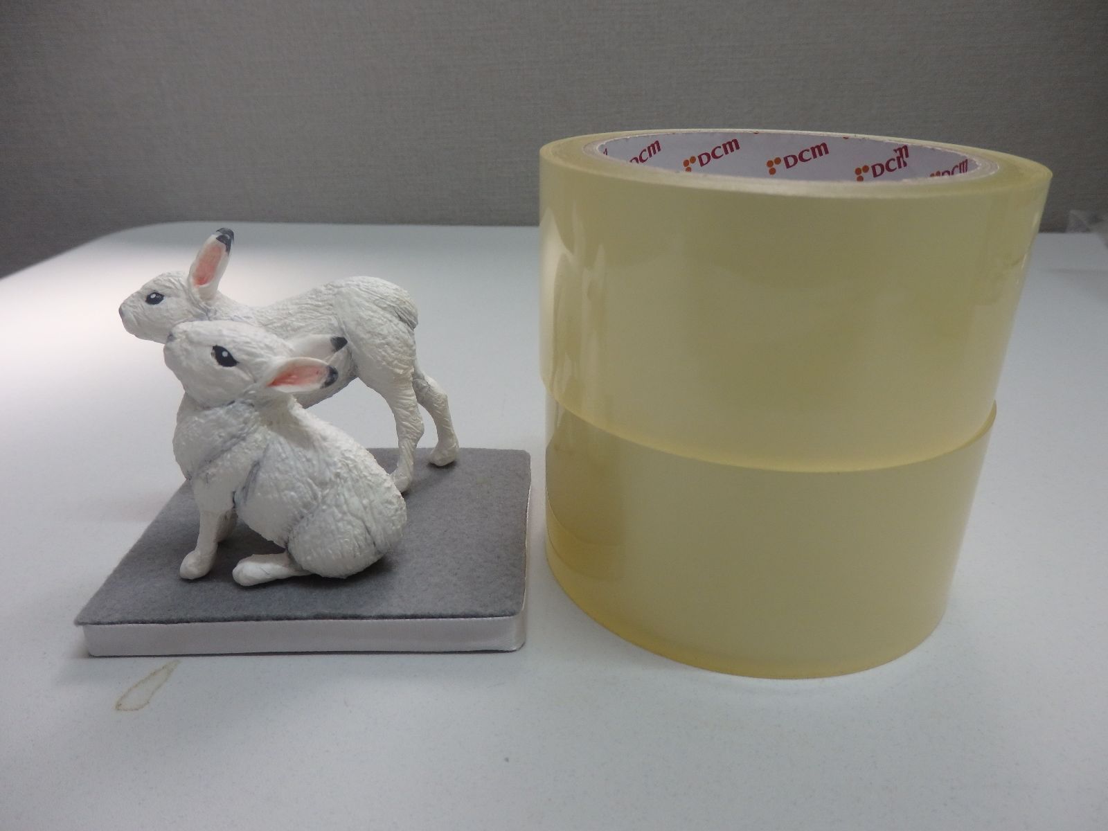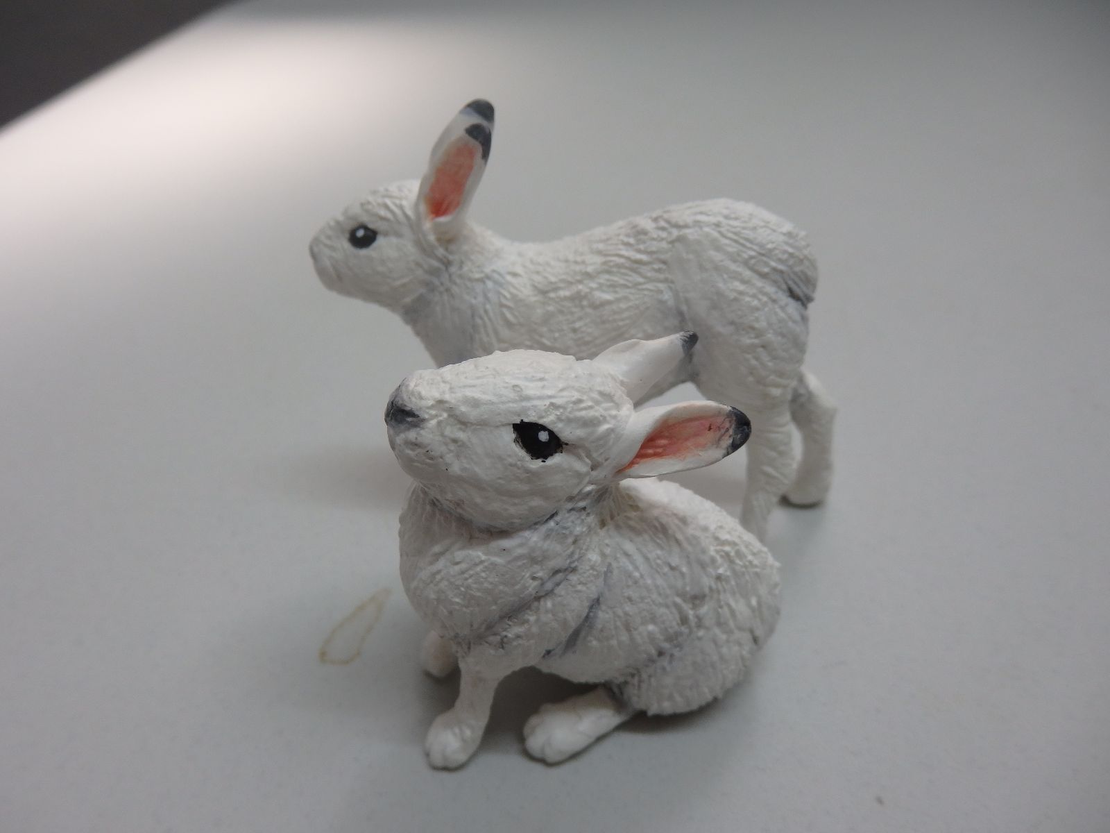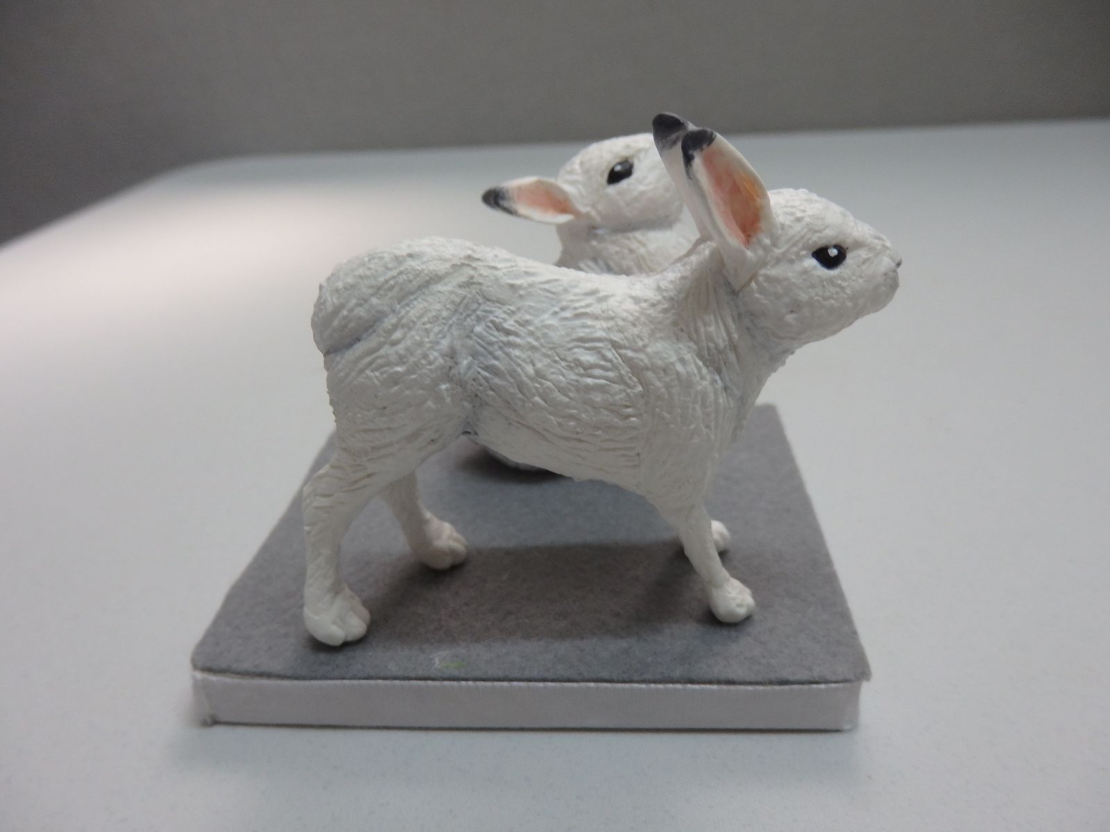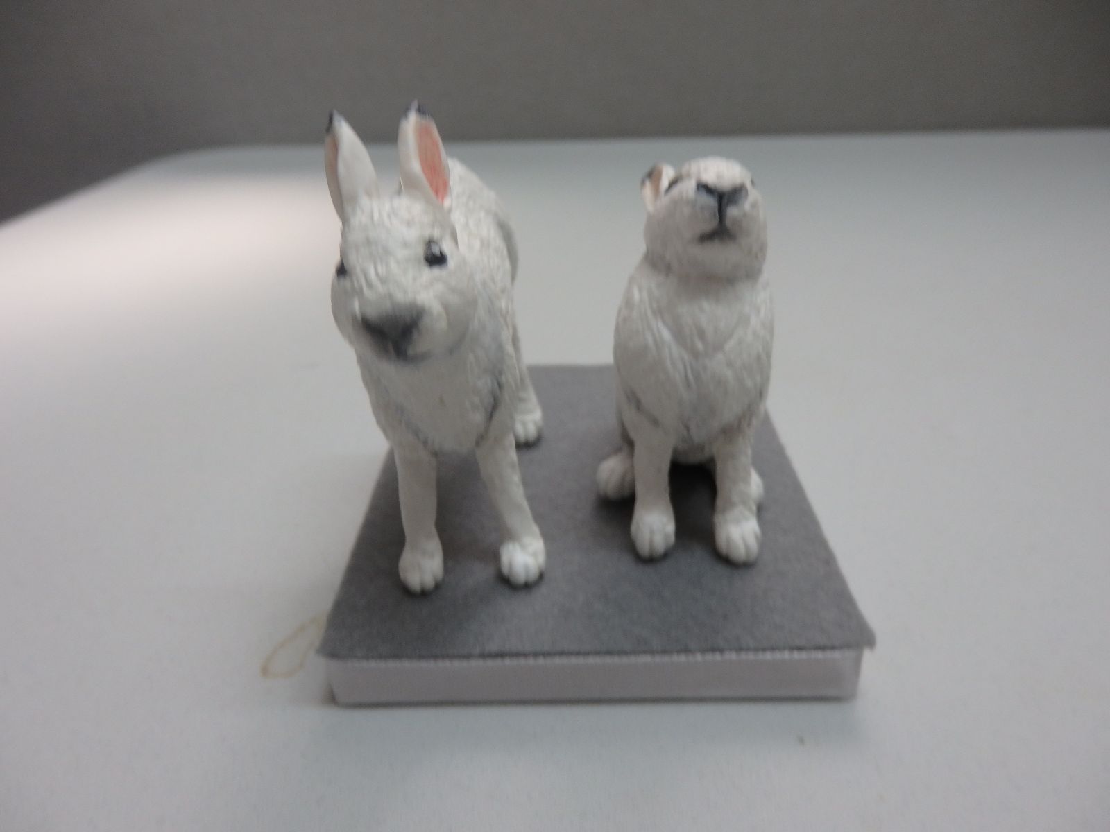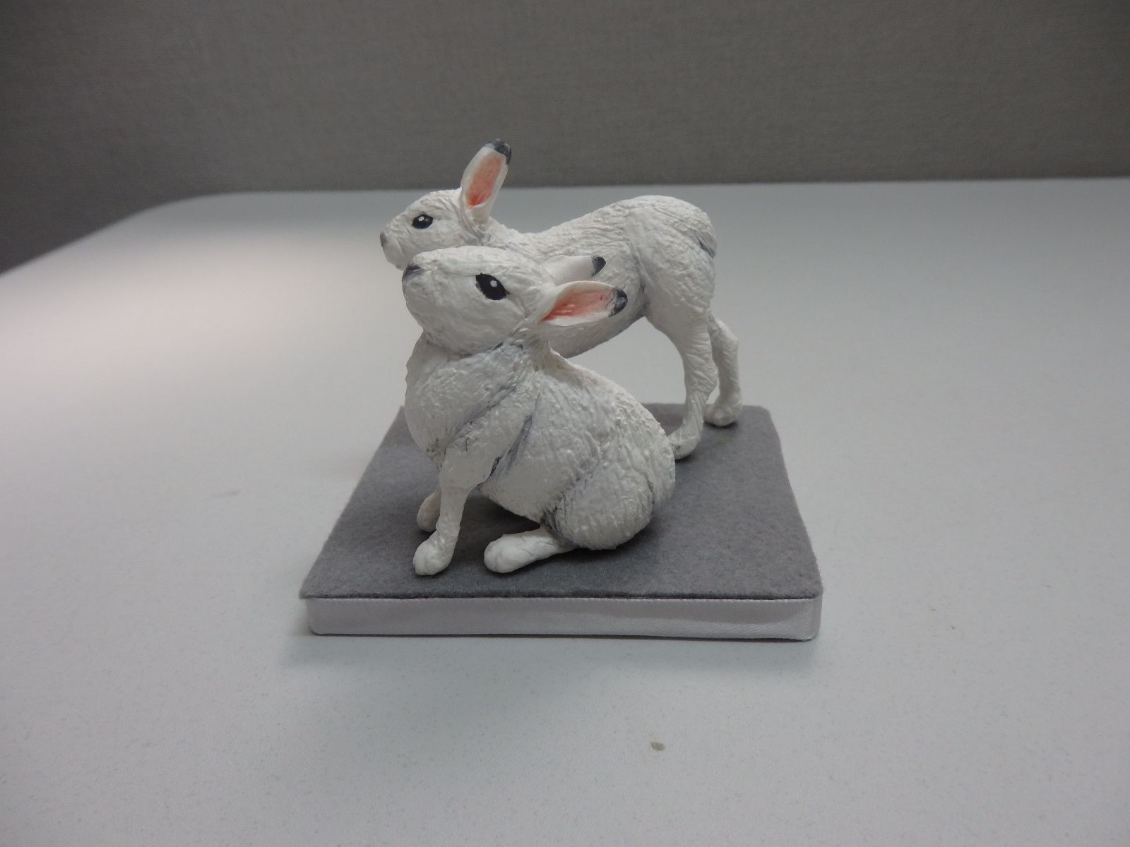 此方はエゾユキウサギの双子になります。北海道全域に生息しているウサギで、座り込んでいる時と立ち上がった時のギャップの激しい姿を立体化しました。