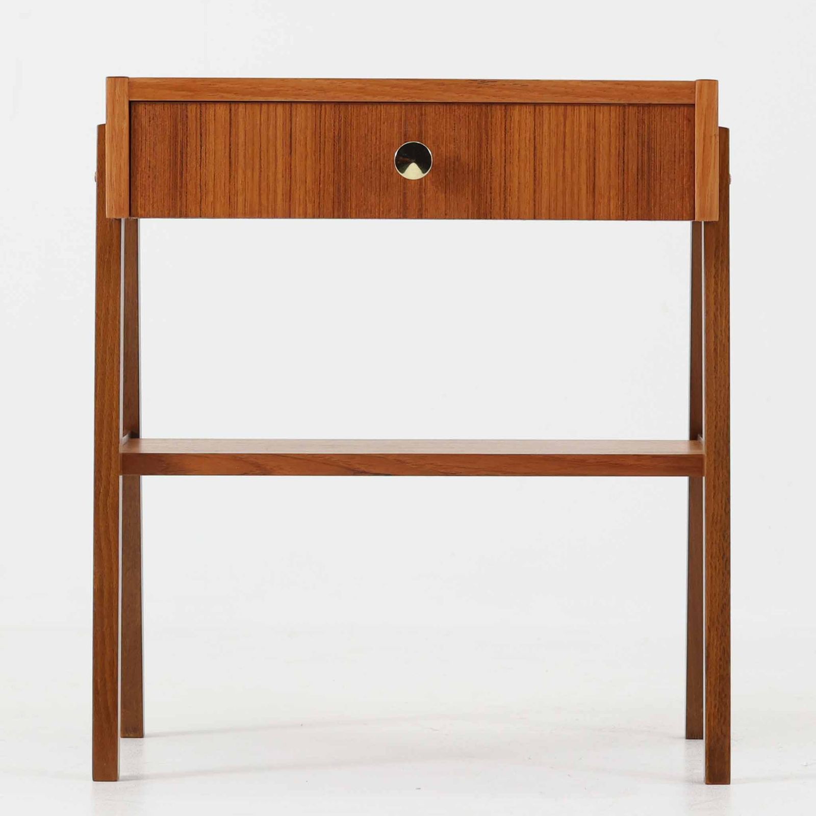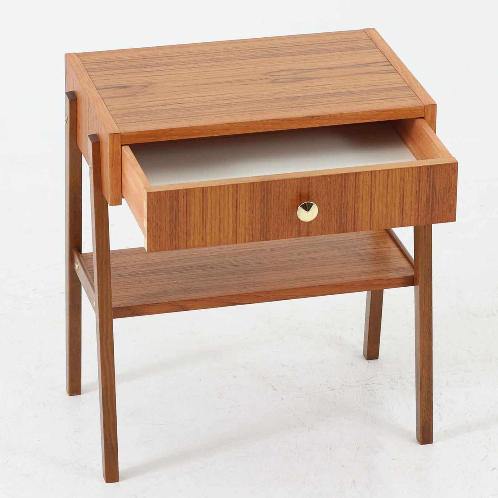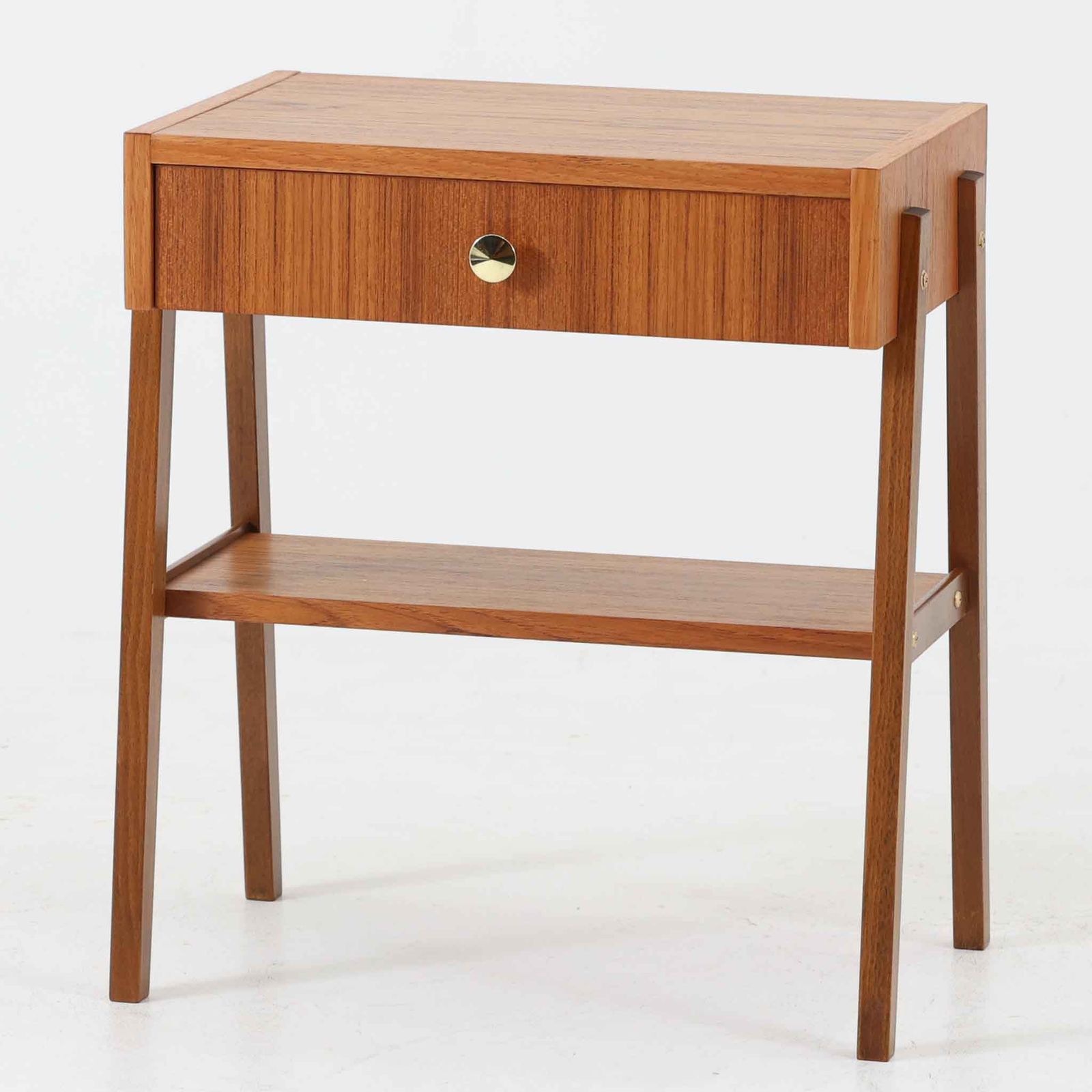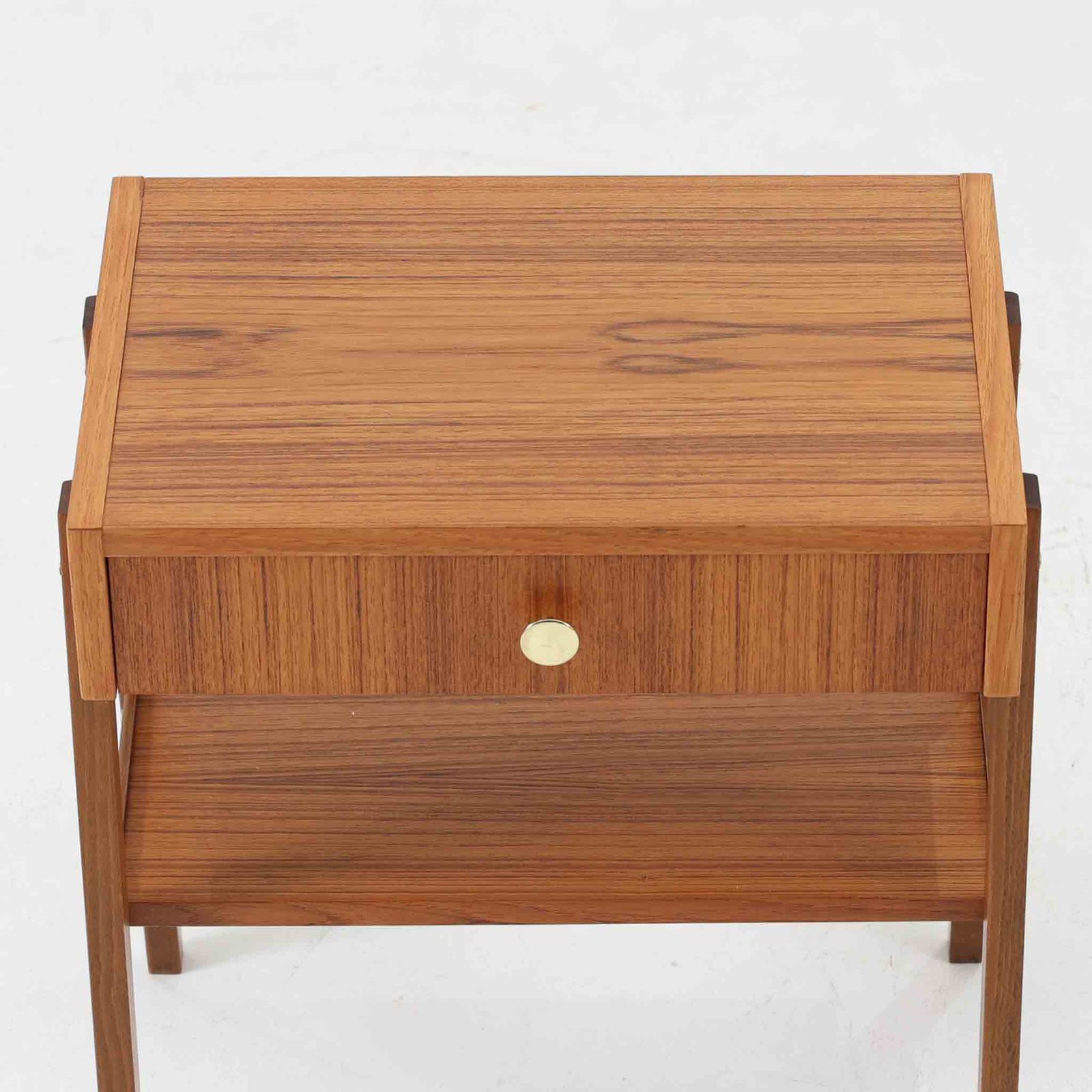 スウェーデン製のこちらのサイドチェストは、チーク材の美しい木目とビーチ材の脚部を組み合わせた軽やかな構成が魅力で、前板にあしらわれたゴールド色のメタルの取手が上品なアクセントを添える北欧ビンテージ品です。引き出しに加えて下段にはオープンシェルフが設けられ、ベッドサイドやリビングのサイドテーブルとして実用性高くお使いいただけます。細身のフレームでありながらしっかりとした造りで、経年により深まった木肌の風合いが空間に温かさと落ち着きをもたらす一台です。