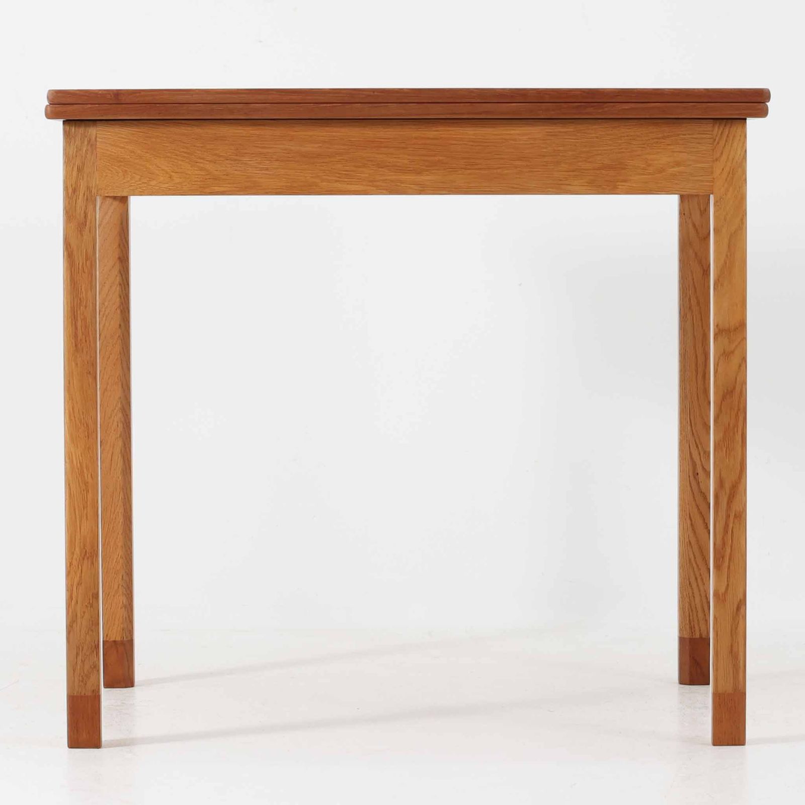 Borge Mogensen(ボーエ・モーエンセン)がSoborgのために手掛けた「Folding table」は、チーク材の天板とオーク材の脚部を組み合わせた温かみある佇まいが魅力のダイニングテーブルで、中央の蝶番を開閉して幅80~120cmへと柔軟に調整できる構造が特徴です。内部にはモーエンセン家具らしい実用性を備えた収納スペースが設けられ、ゲームテーブルとして親しまれてきた背景を感じさせます。経年により深まった木肌の風合いがビンテージならではの味わいをまとい、ダイニングやワークスペースのサブテーブルとしても多用途に活躍する一台です。また、裏面には「SKM」の刻印が確認でき、スウェーデン軍(Svenska KrigsMakten)の備品として使用されていたことを示しています。