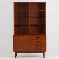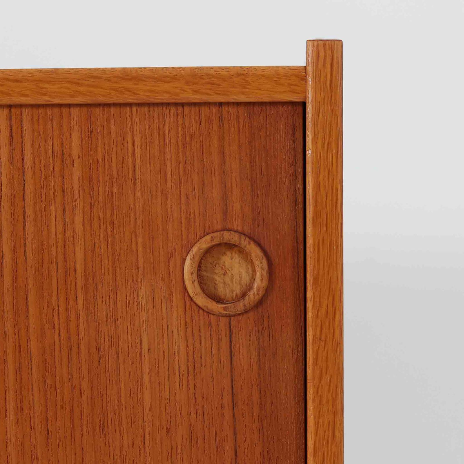 スウェーデン製のこちらのオープンシェルフは、チーク材の温かな木目とオーク材の脚部を組み合わせた軽やかな佇まいが魅力で、上段の棚板と下段のスライド扉収納を備えた実用性の高い構成が特徴の北欧ビンテージ家具です。丸い掘り込み取手や細身のフレームなど繊細なディテールが空間を柔らかく彩り、本や雑貨、食器などを美しく見せながら整頓でき、経年で深まった木肌の風合いがインテリアに落ち着きと温もりを与える一台です。
