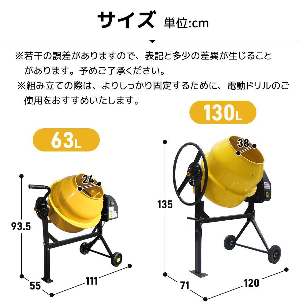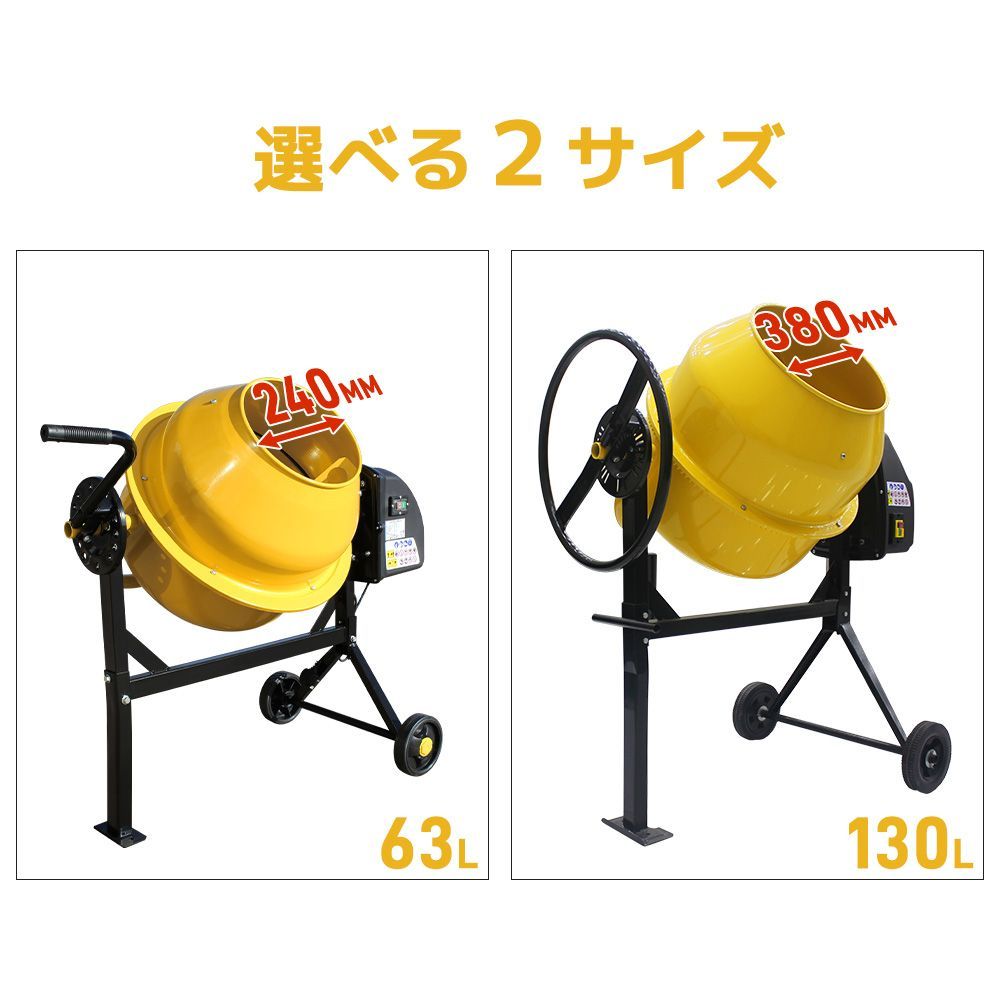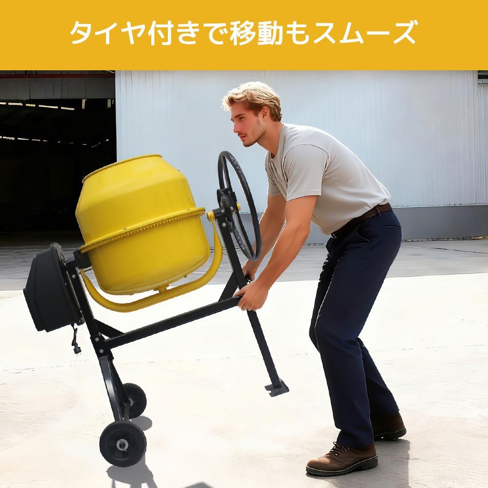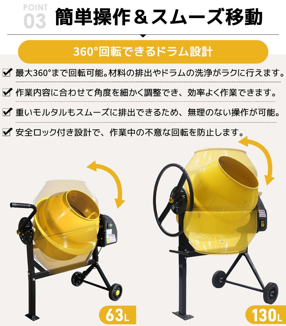 タイヤ付きで、現場内での移動が楽々。最大360°まで回転するドラムは、材料の排出や清掃を効率化。安全ロック付きで不意の回転を防ぎます。