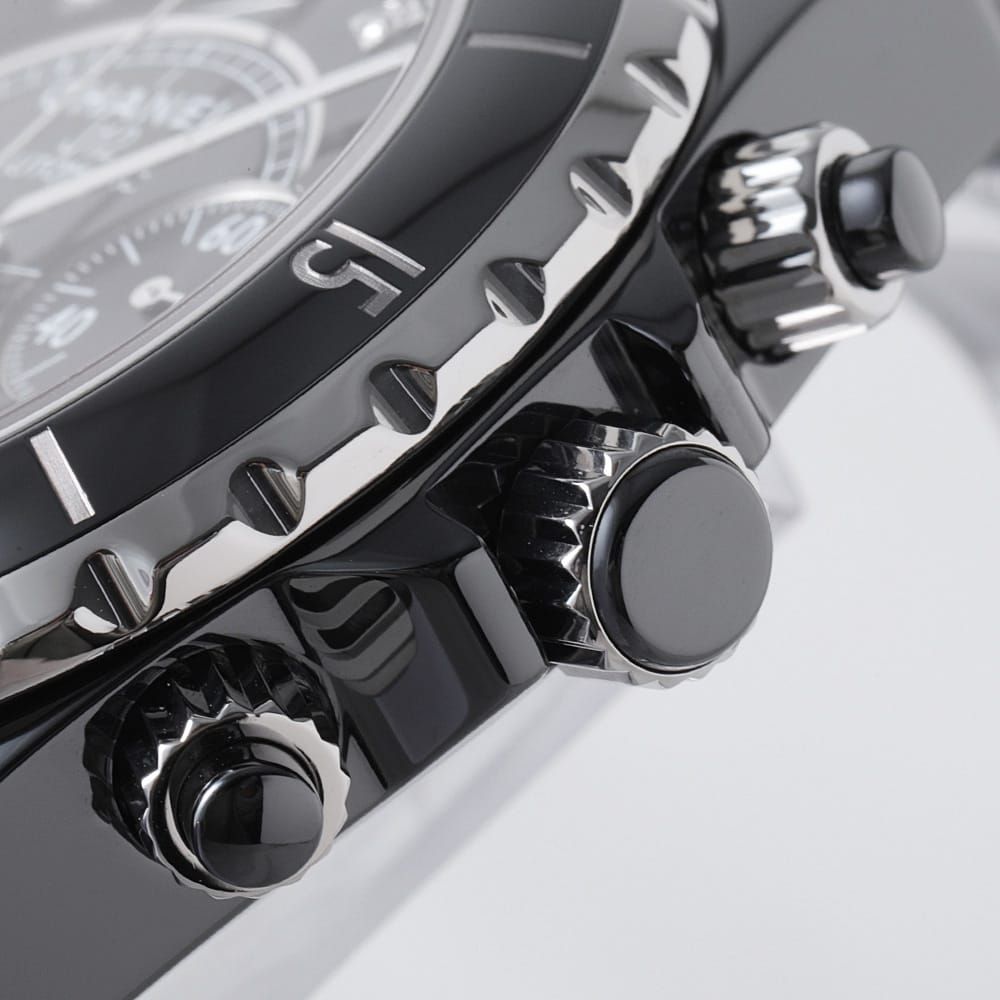 ■モデル情報:シャネル渾身の力作であり、2000年の発表から世界中で人気を博しているJ12コレクション。こちらはインデックスに9ポイントのダイヤをセットしたエレガントなモデルです。材質には高硬度という特性を持つセラミックを使用しているため、傷が付きにくく取り扱いが楽な時計でもあります。200mの防水設計がされており、マリンスポーツにも対応可能です。