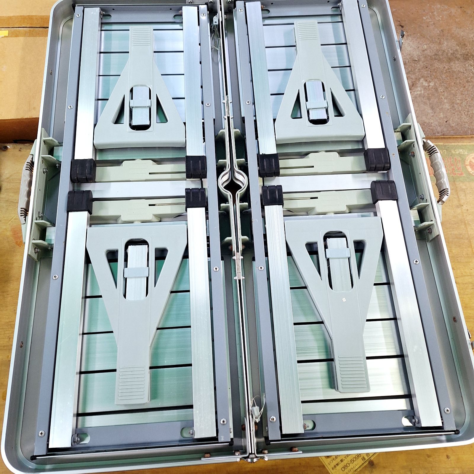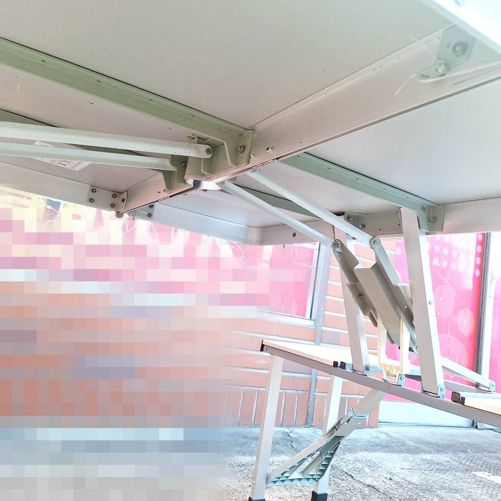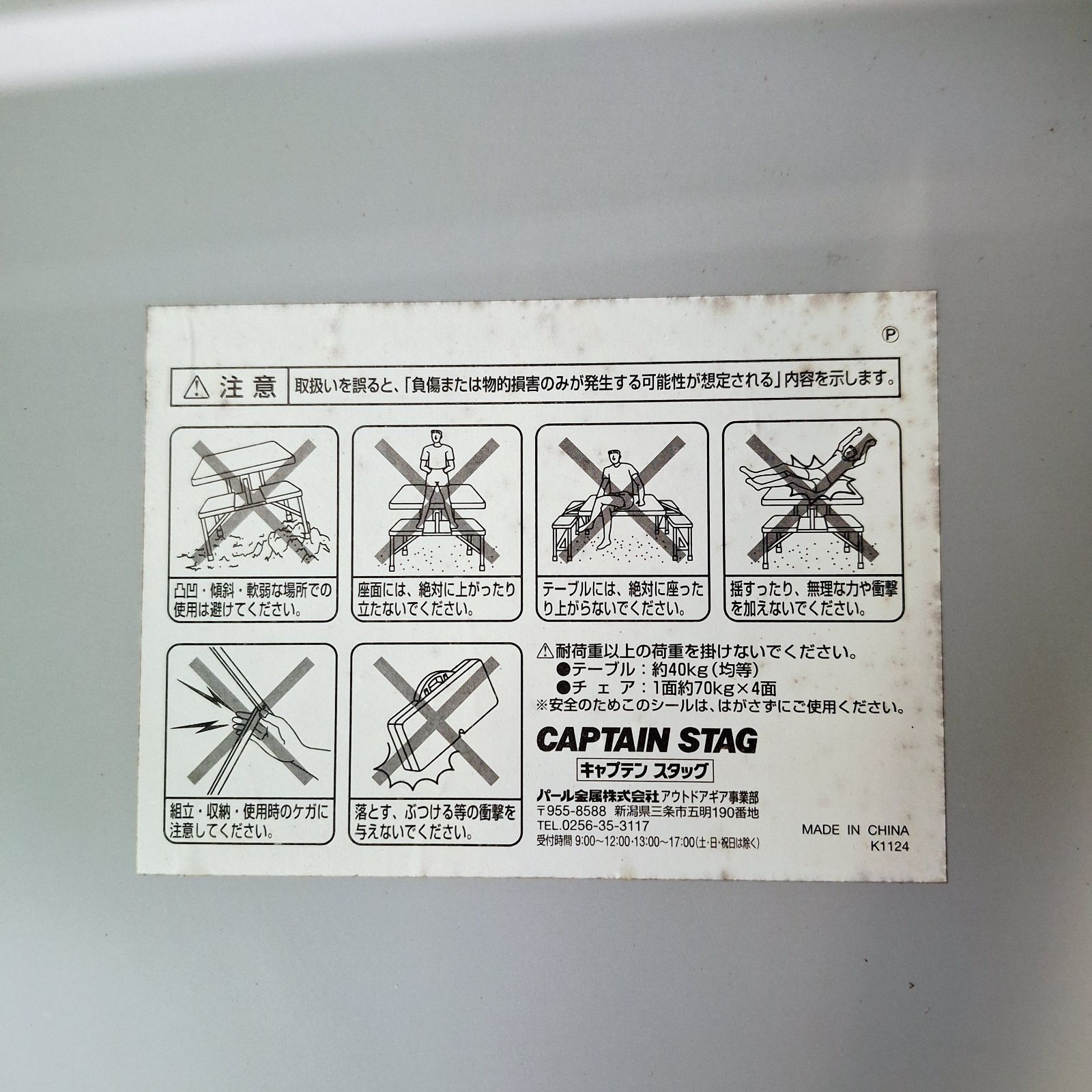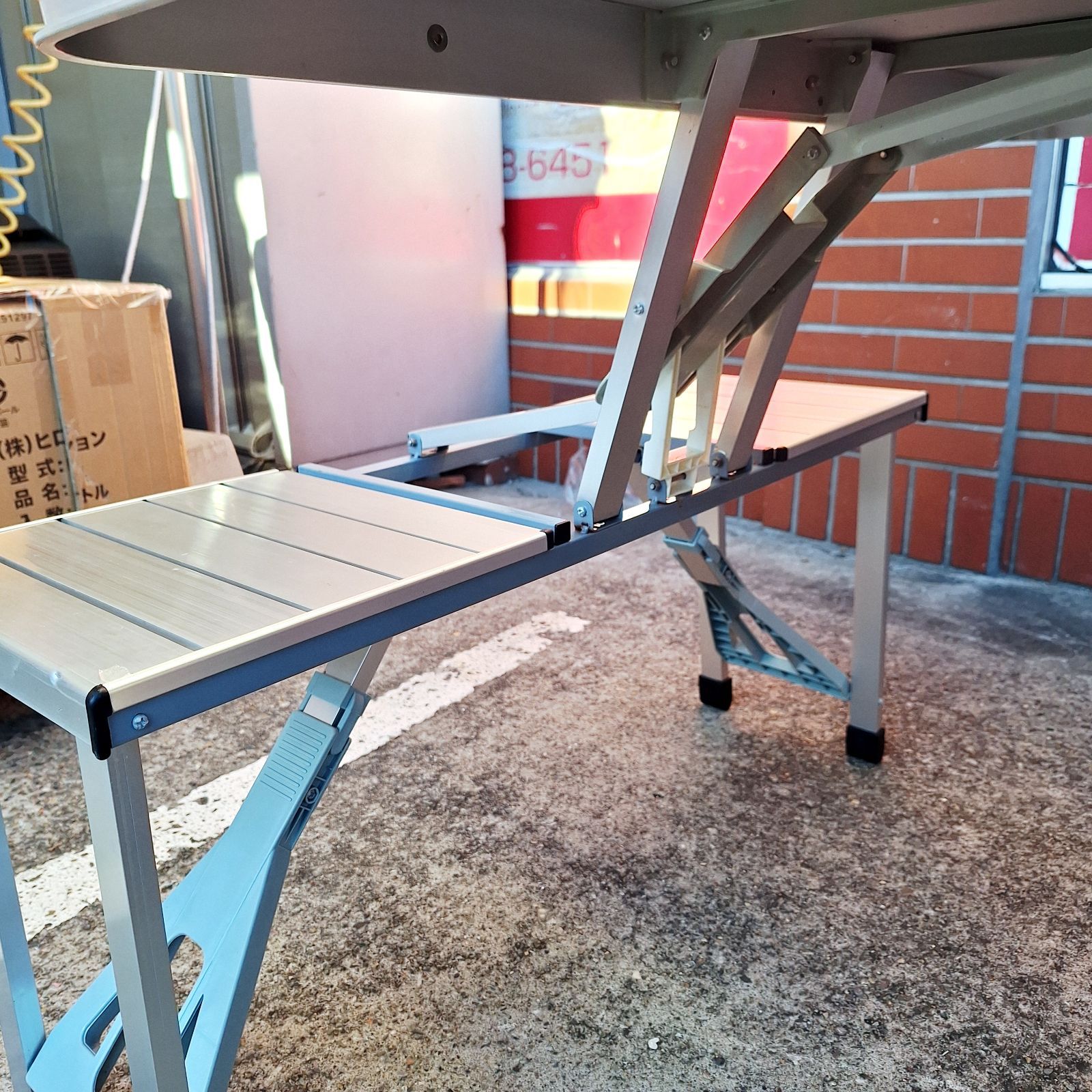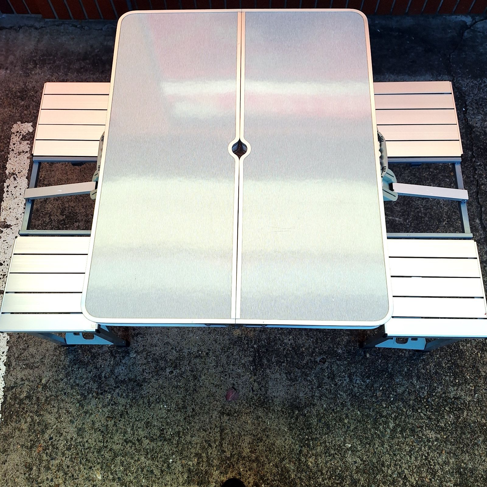 テーブルとイス4客がくっついてるタイプです。広げるだけなので簡単にお使いいただけます。もちろん片付ける際も同様、折りたたむだけ!!ネジの部分や所々にサビが見受けられましたが広げて試しに座ってみたところ問題なかったです。中古品にご理解のある方、ご検討ください。