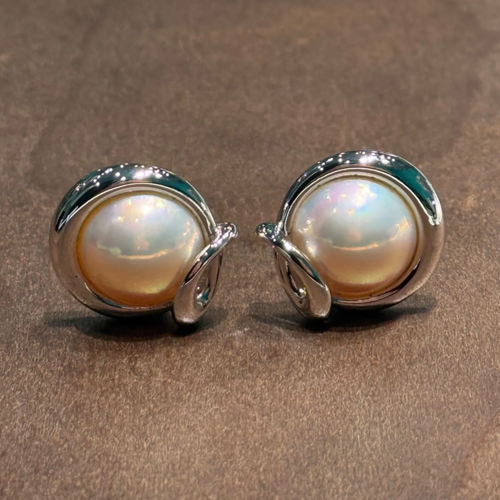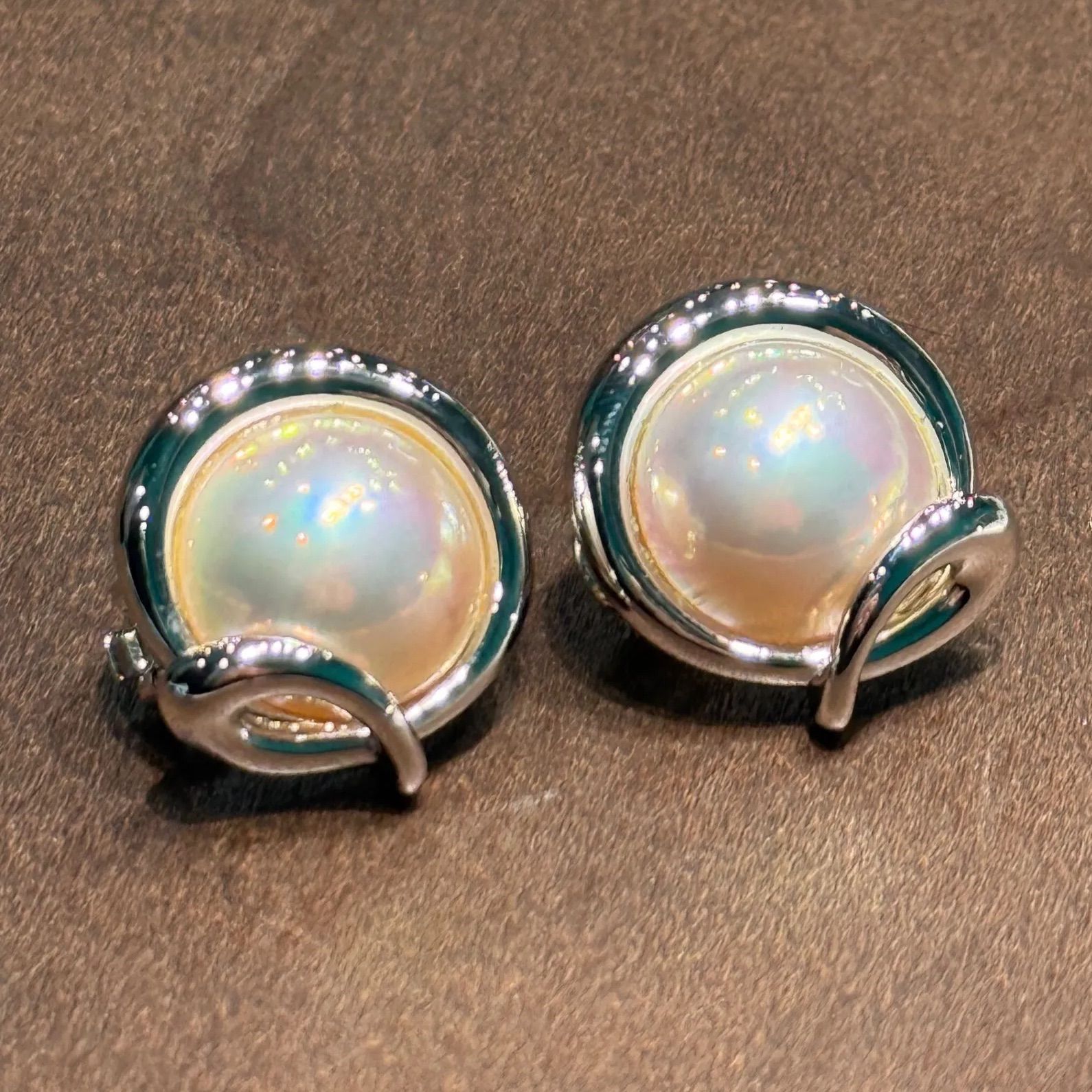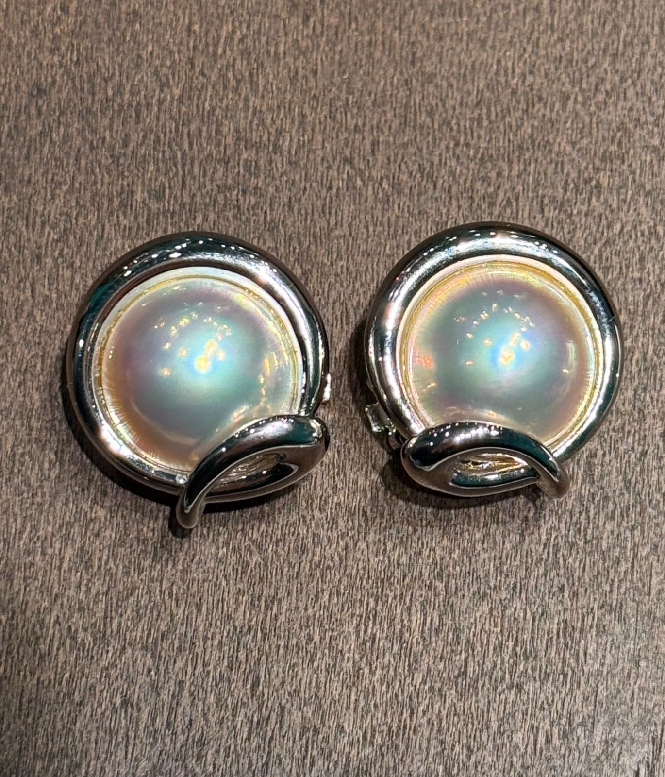 タサキの綺麗な色をしたマベパールのイヤリングです。落とし切れない細かい汚れございますが、肉眼で目立つようなものではないと思います。