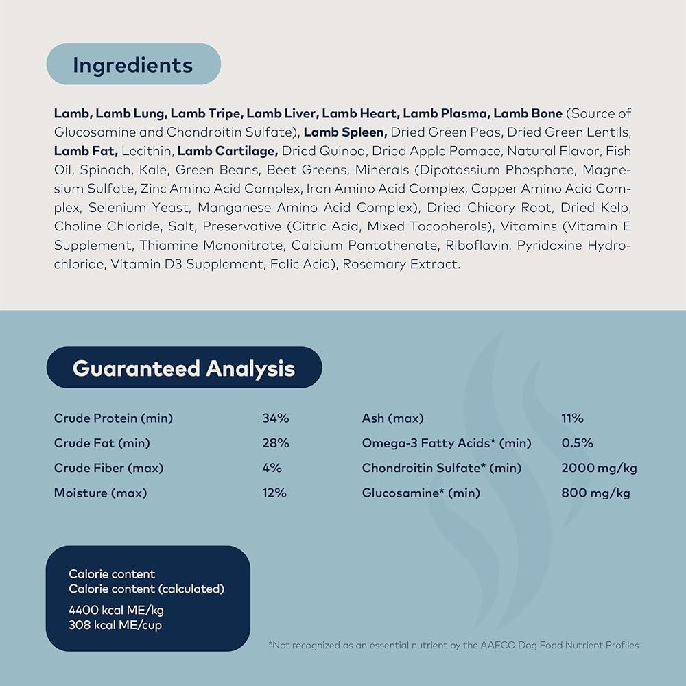 ラム生肉、ラムラング生肉、ラムトライプ生肉、ラムレバー生肉、ラムハート生肉、ラムプラズマ(血漿)、ラムボーン(グルコサミンとコンドロイチン硫酸の供給源)、ラムスプリーン生肉(脾臓)、乾燥グリーンピース、乾燥緑レンズ豆、ラム脂肪、レシチン、ラムカーティリッジ(軟骨)、乾燥キヌア、乾燥アップルポマース、天然香料、フィッシュオイル、ホウレン草、ケール、サヤインゲン、ビートの葉、ミネラル類(リン酸二カリウム、硫酸マグネシウム、亜鉛アミノ酸複合体、鉄アミノ酸複合体、銅アミノ酸複合体、セレン酵母、マンガンアミノ酸複合体)、乾燥チコリルート、乾燥ケルプ、塩化コリン、海塩、酸化防止剤(クエン酸、天然ミックストコフェロール)、ビタミン類(ビタミンEサプリメント、チアミン硝酸塩、パントテン酸カルシウム、リボフラビン、塩酸ピリドキシン、ビタミンD3サプリメント、葉酸)、ローズマリーエキス