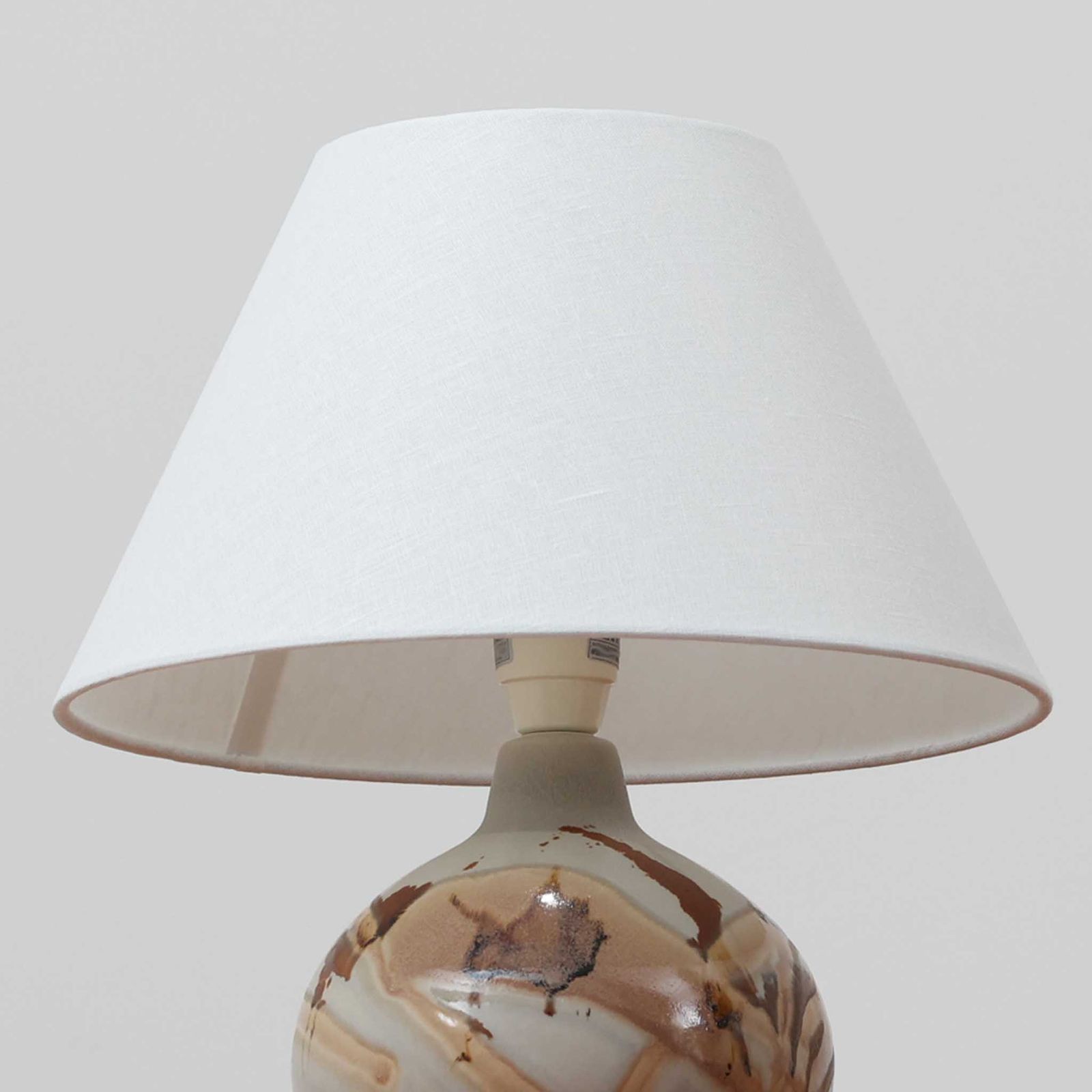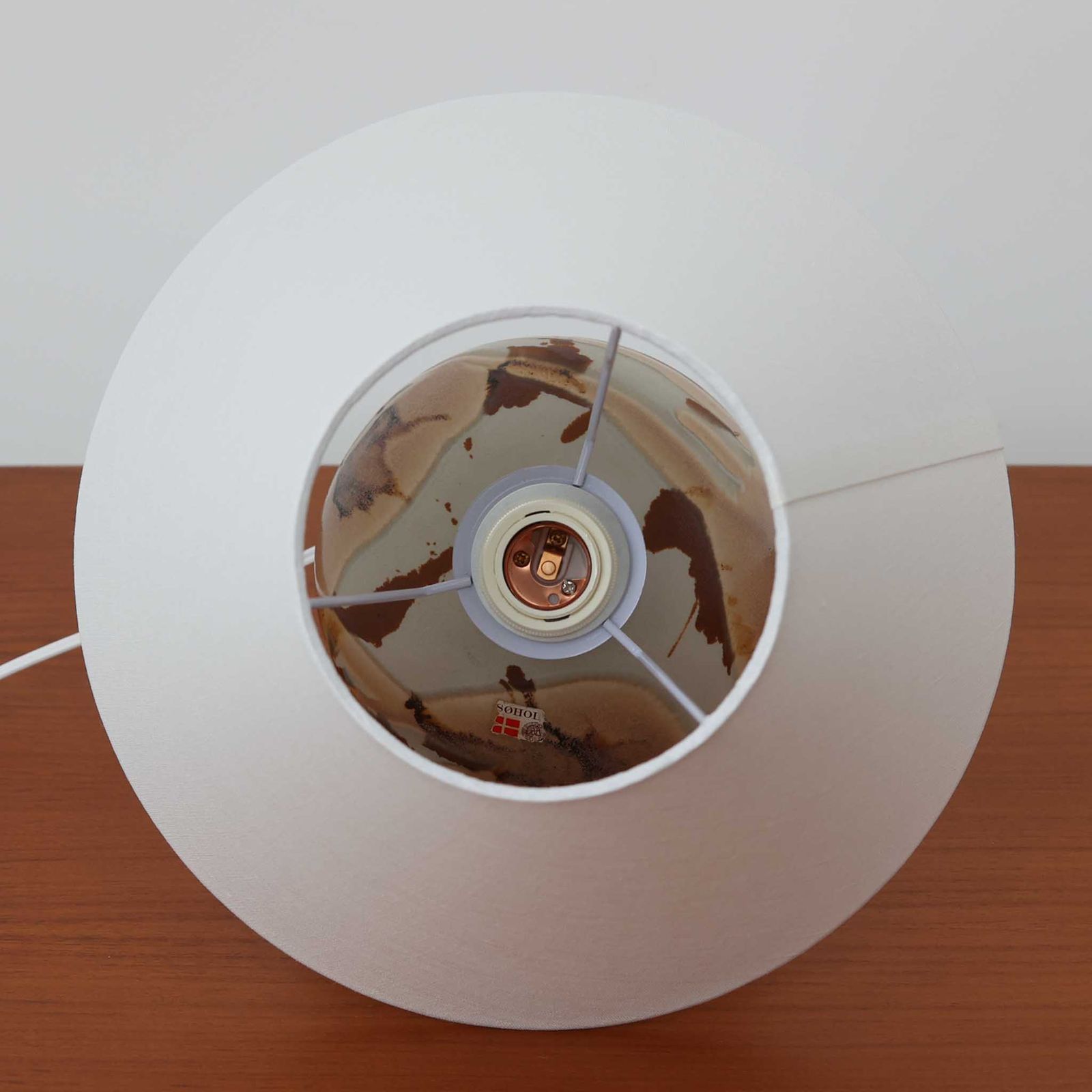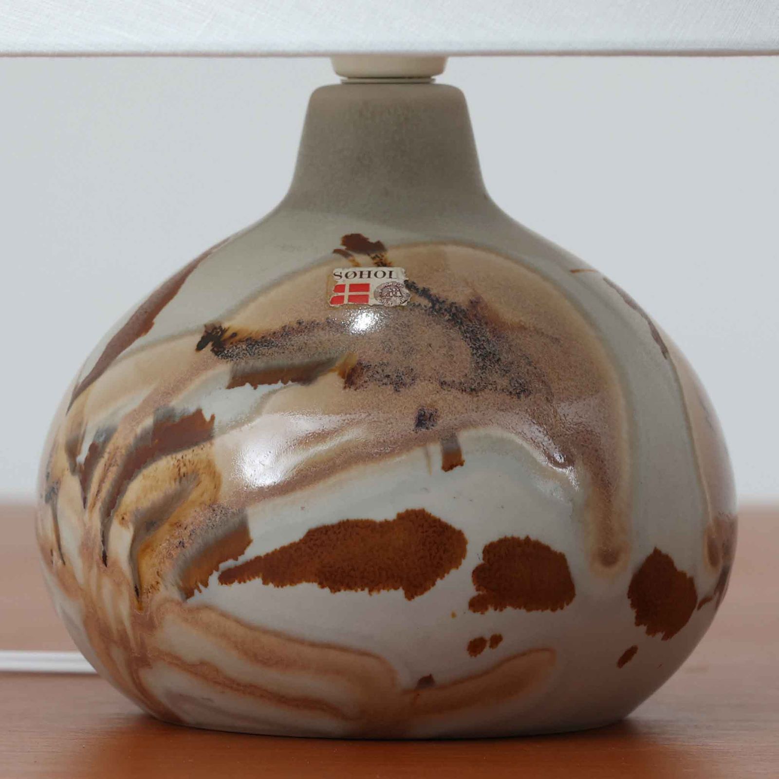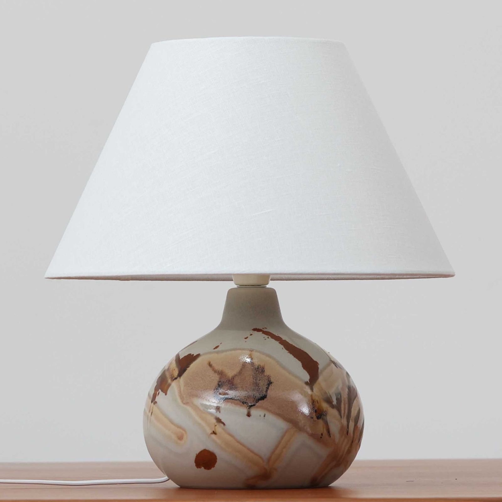 Soholm Keramik(スーホルム・セラミック)が手掛けたこちらのテーブルランプは、淡いグレーを基調にブラウンの流れるような釉薬模様が美しく広がる有機的な表情が魅力で、丸みを帯びた陶磁器のベースが空間にやさしい存在感をもたらす北欧ビンテージ品です。リネンシェードを透ける柔らかな灯りが落ち着いた雰囲気をつくり、ベッドサイドやリビングの間接照明として取り入れやすく、経年によって深まった色合いと一点物ならではの味わいを長く楽しめる一台です。