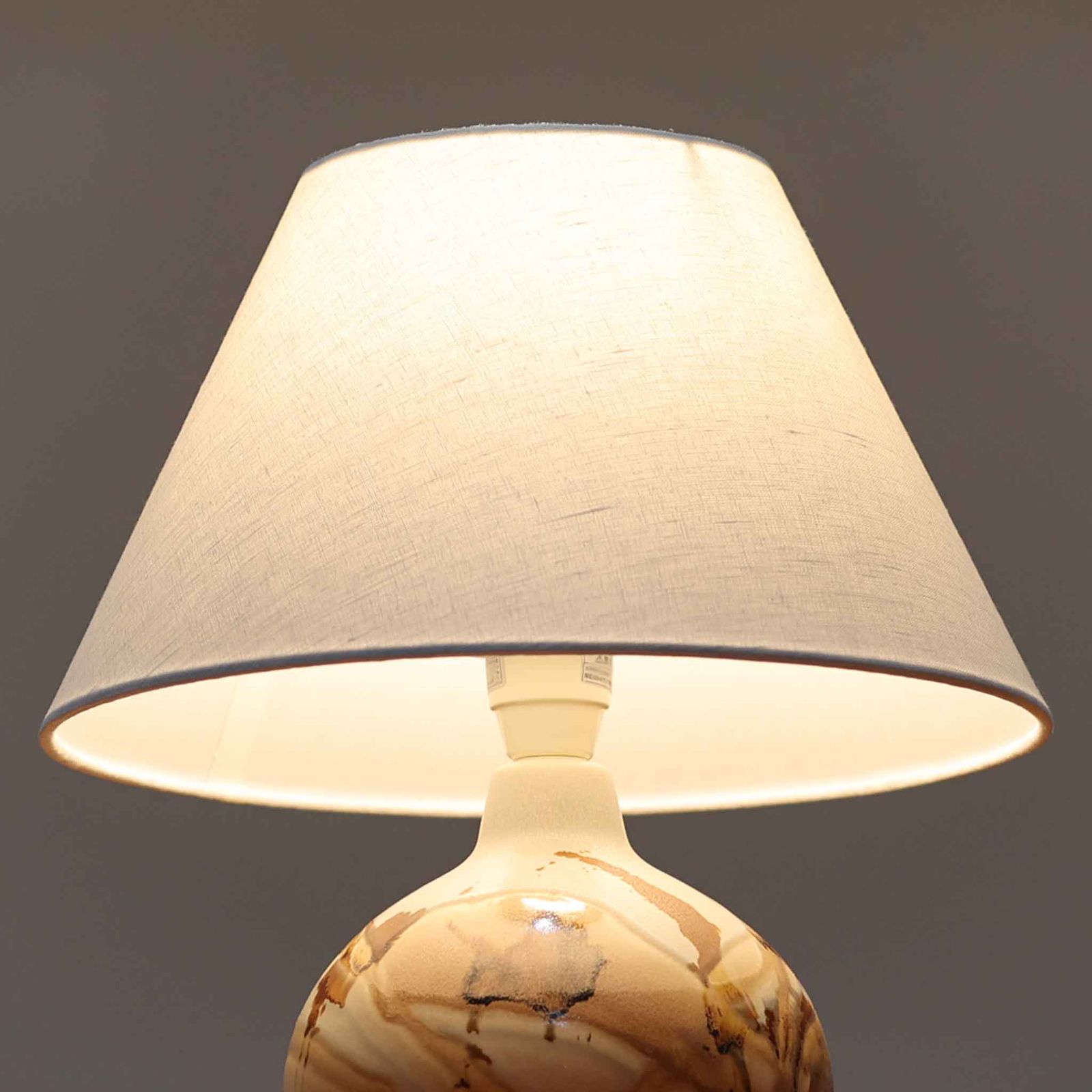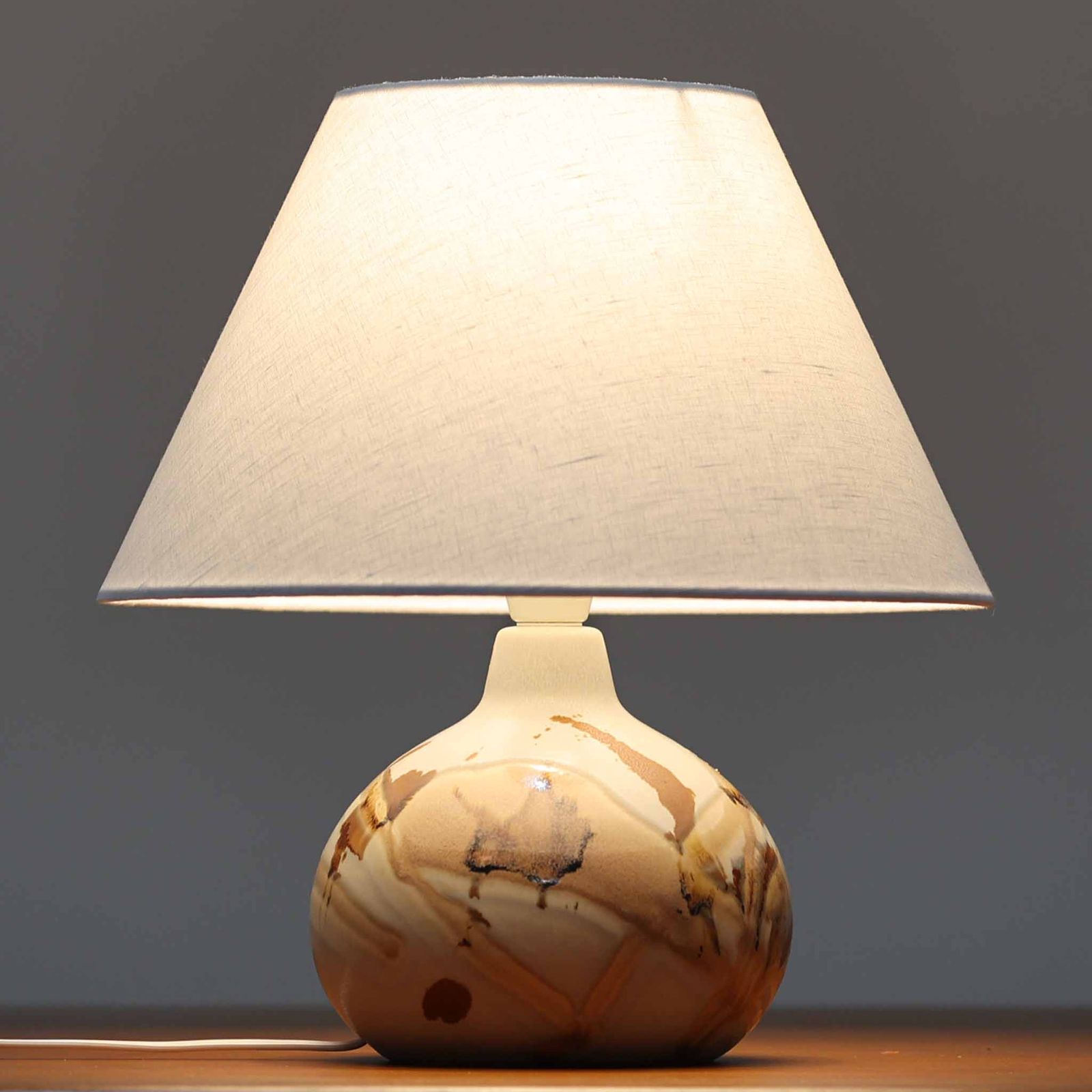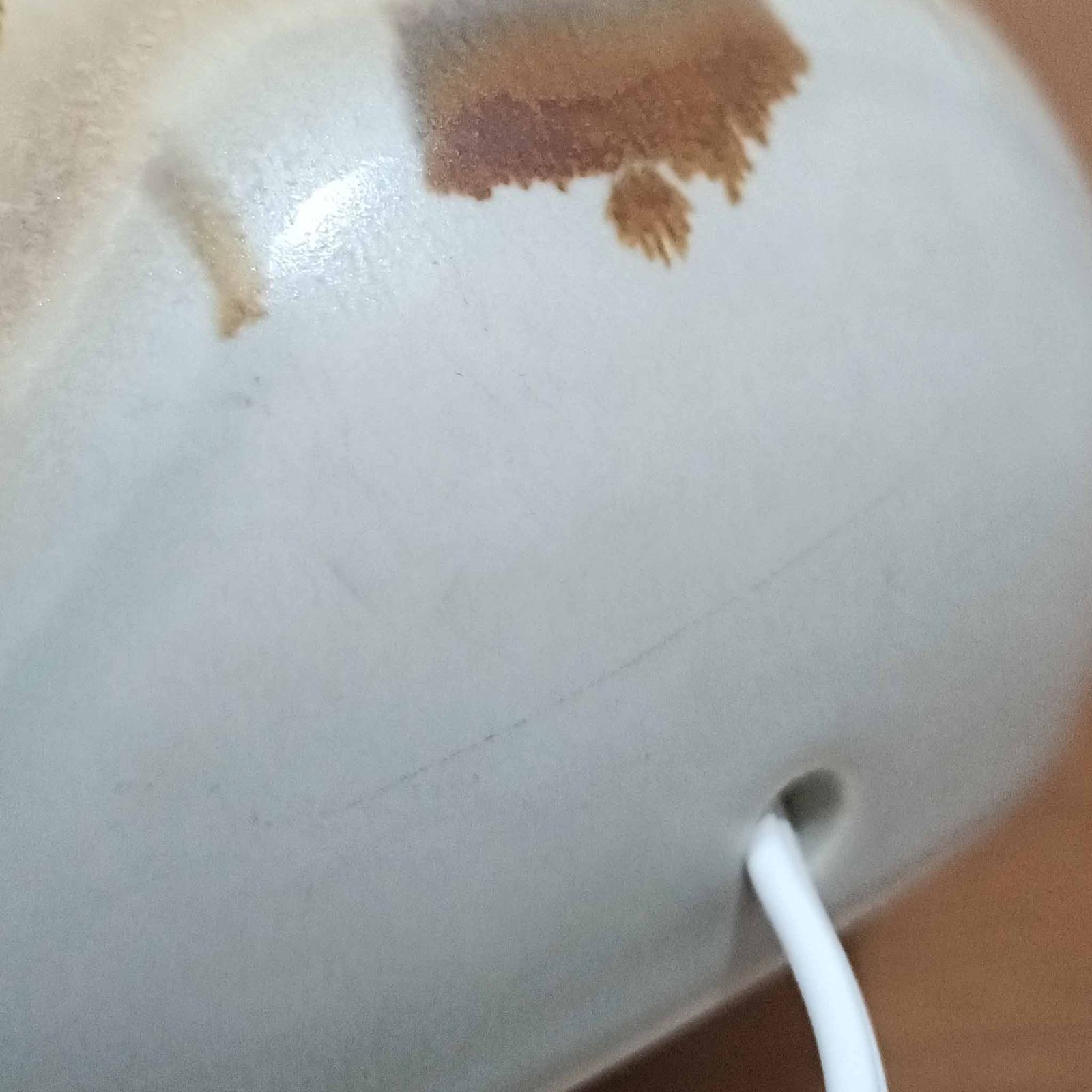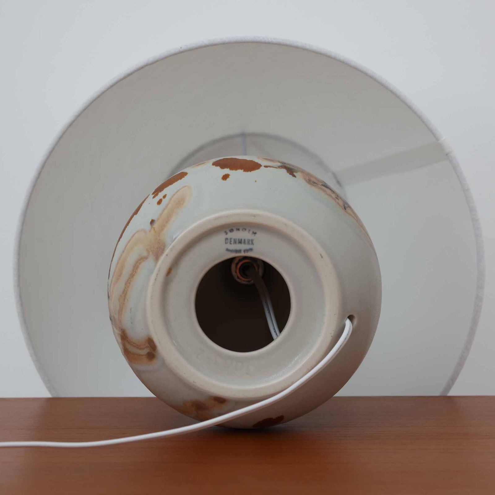 Soholm Keramik(スーホルム・セラミック)が手掛けたこちらのテーブルランプは、淡いグレーを基調にブラウンの流れるような釉薬模様が美しく広がる有機的な表情が魅力で、丸みを帯びた陶磁器のベースが空間にやさしい存在感をもたらす北欧ビンテージ品です。リネンシェードを透ける柔らかな灯りが落ち着いた雰囲気をつくり、ベッドサイドやリビングの間接照明として取り入れやすく、経年によって深まった色合いと一点物ならではの味わいを長く楽しめる一台です。