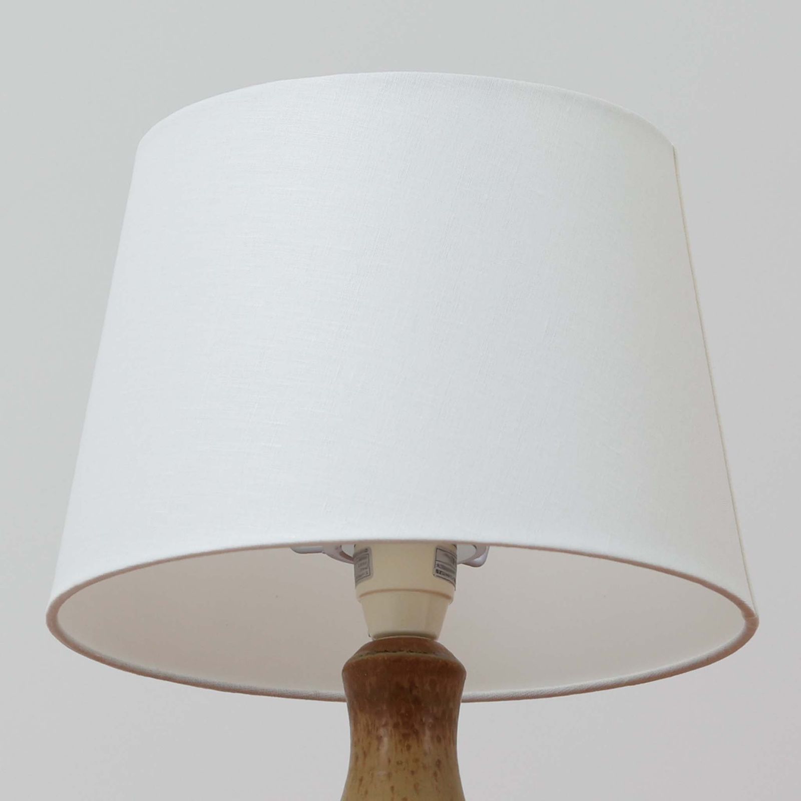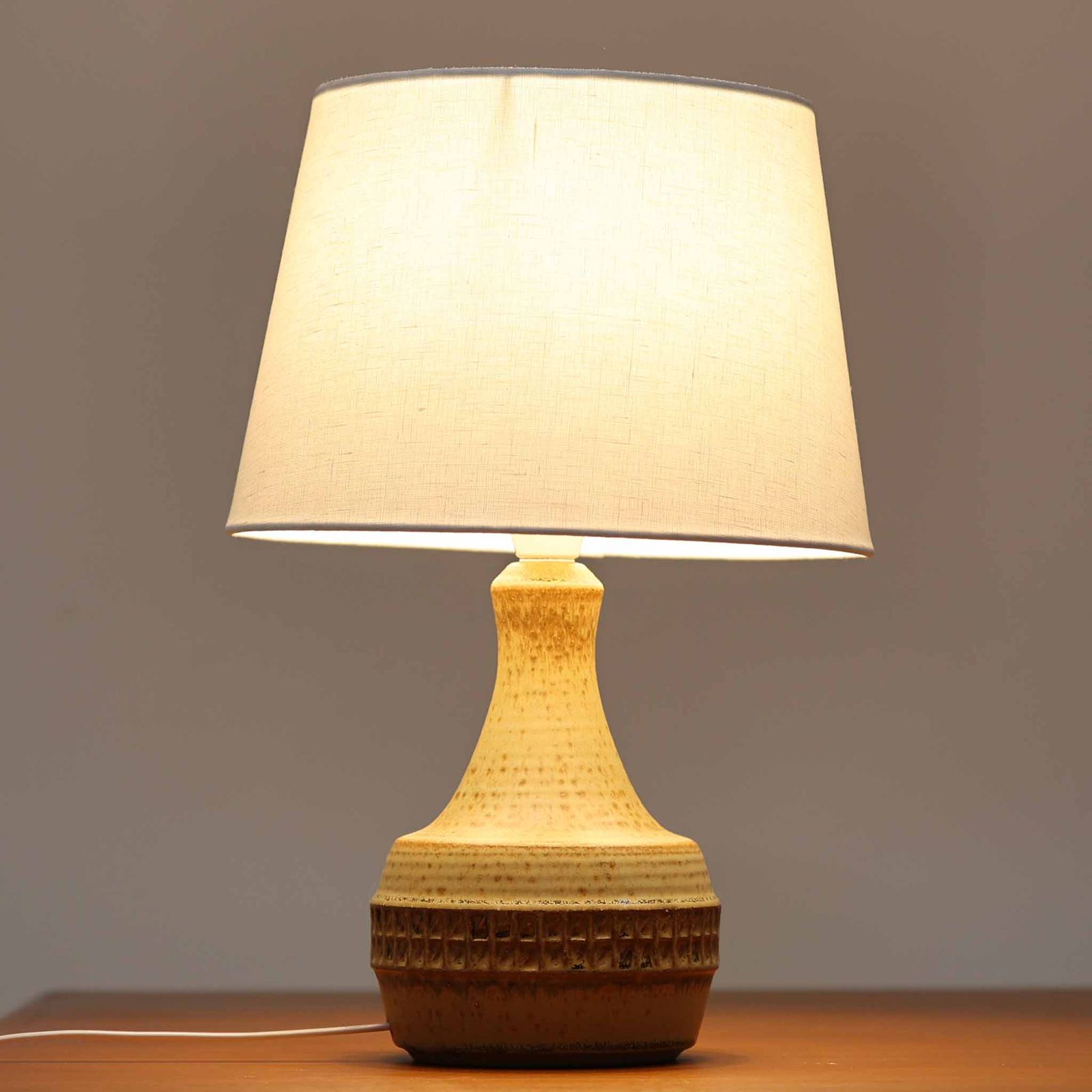 Soholm Keramik(スーホルム・セラミック)製のテーブルランプです。落ち着いたブラウンの陶磁器ボディに幾何学模様の装飾が施され、シンプルながらも存在感のあるデザインが魅力です。高さ38cmと扱いやすいサイズ感で、リビングや寝室のサイドテーブルに心地よい灯りを添えてくれます。北欧ビンテージならではの温かみある質感が、空間に柔らかな雰囲気をもたらします。