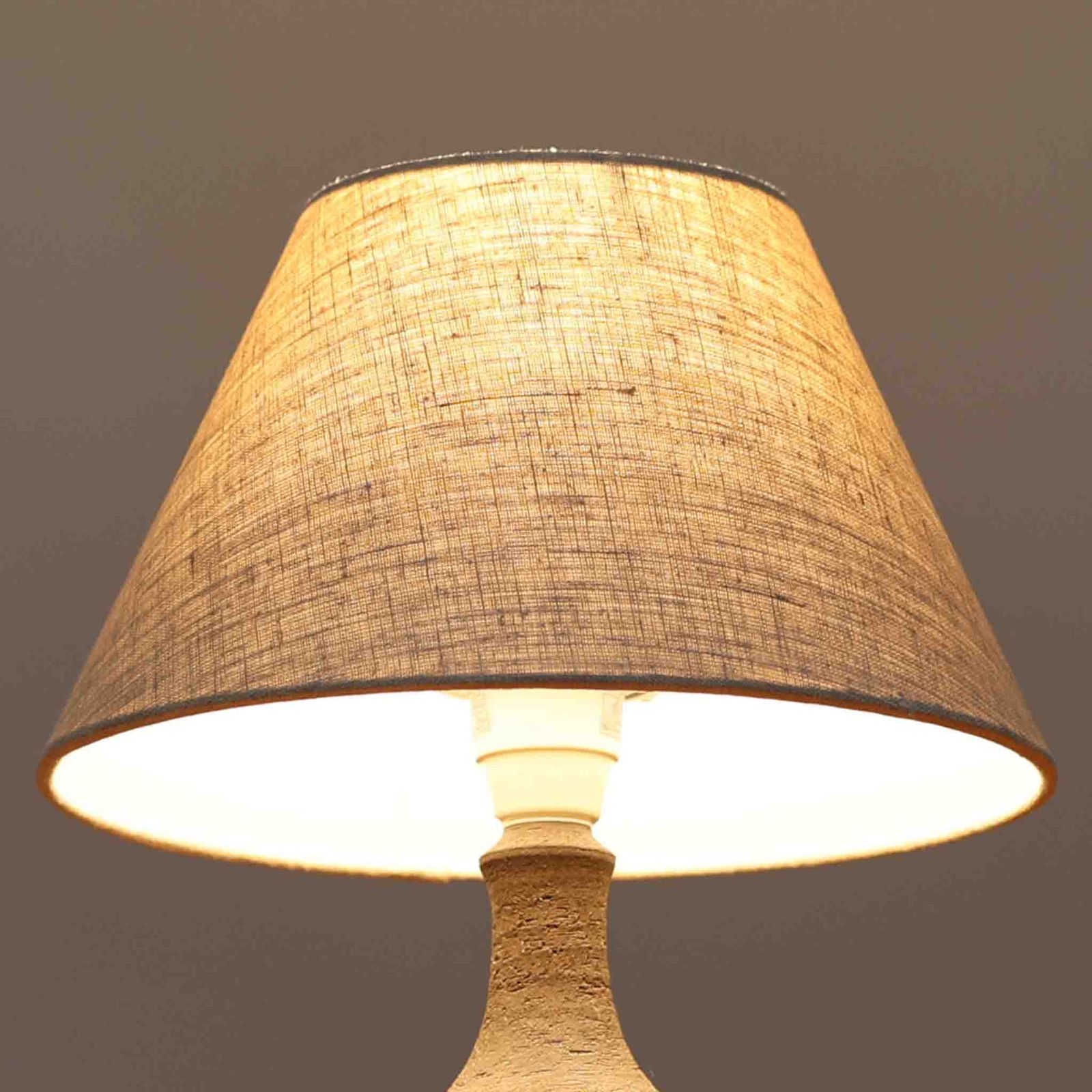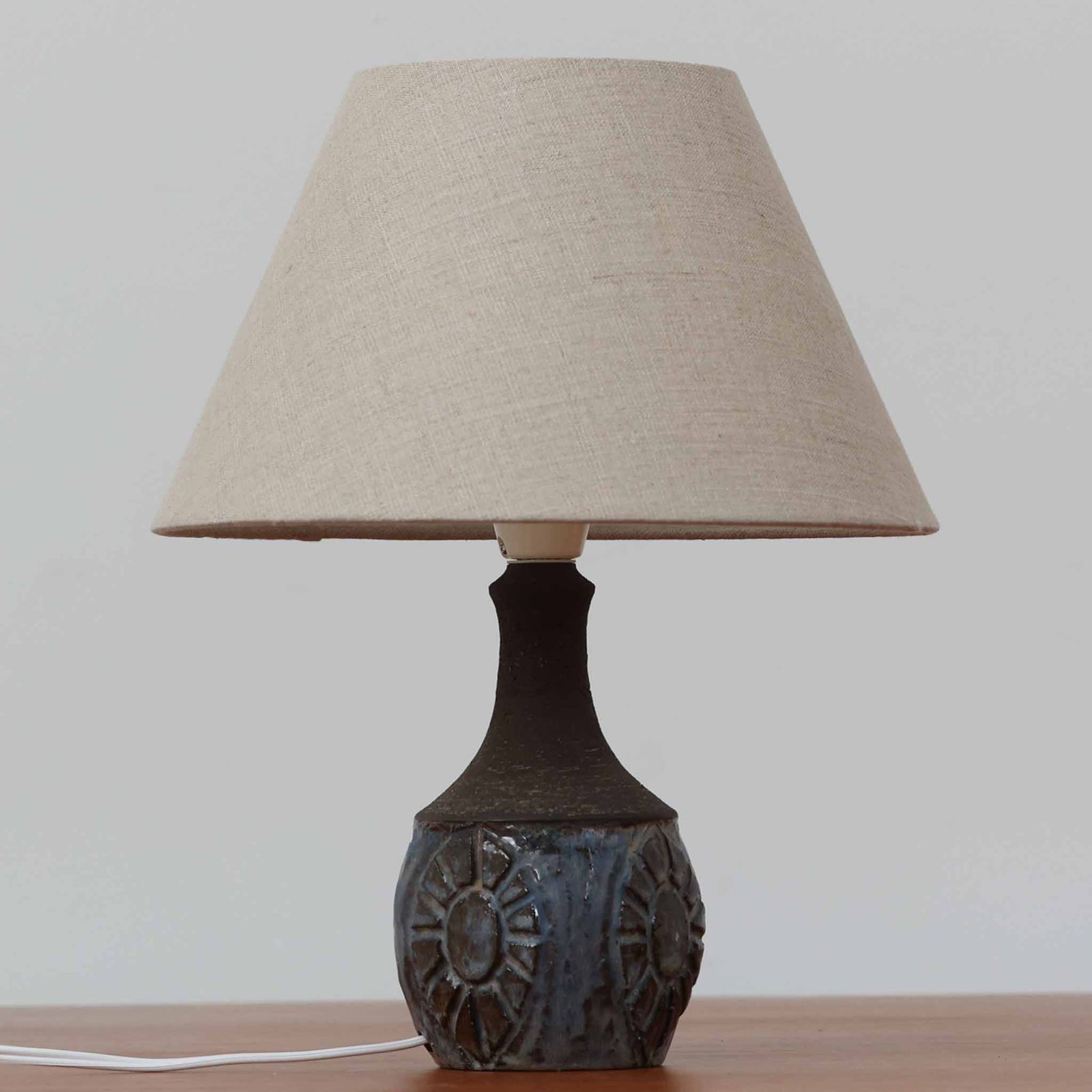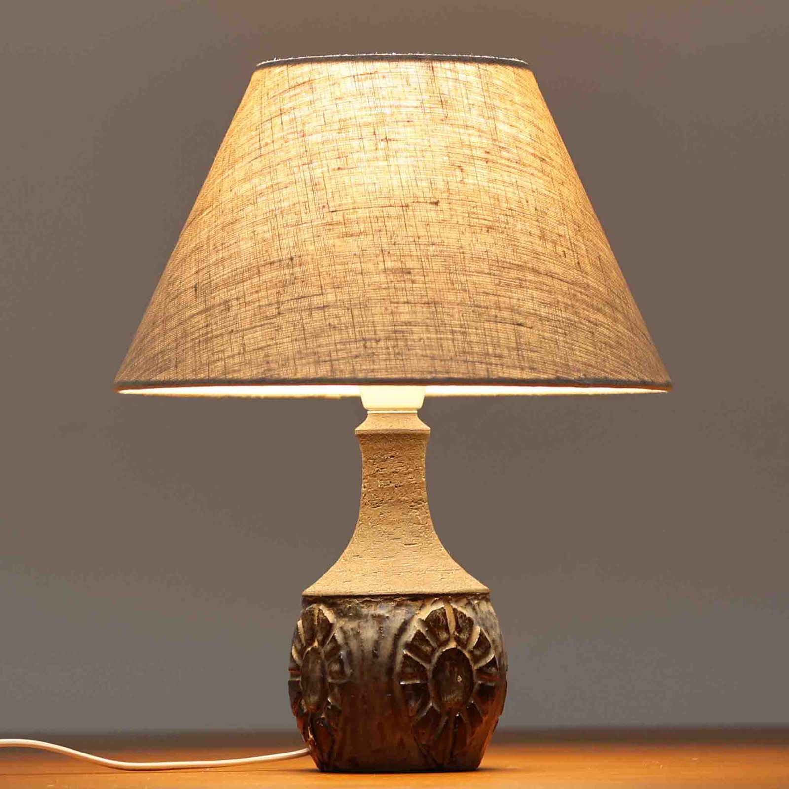 Chris HaslevがJetiのために手掛けたこちらのテーブルランプは、太陽を思わせるレリーフ模様をまとった陶器ベースと、素朴な土肌と釉薬の濃淡が織りなす豊かな表情が魅力で、コンパクトながら存在感を放つ北欧ビンテージ品です。上部のマットな質感が造形を引き締め、リネンシェード越しに広がるあたたかな灯りが空間をやさしく包み込み、リビングやベッドサイドのアクセントとして取り入れやすい一台に仕上がっています。