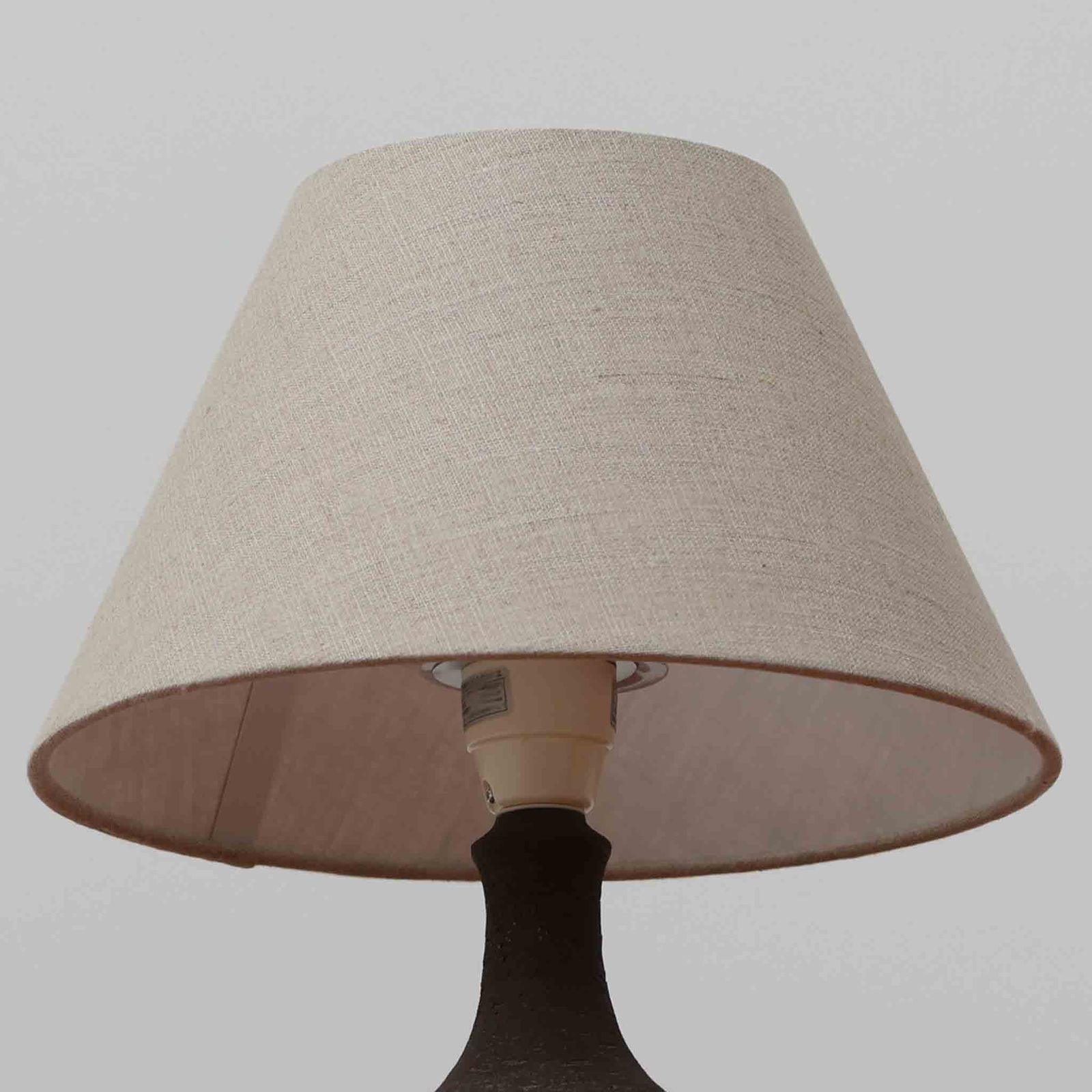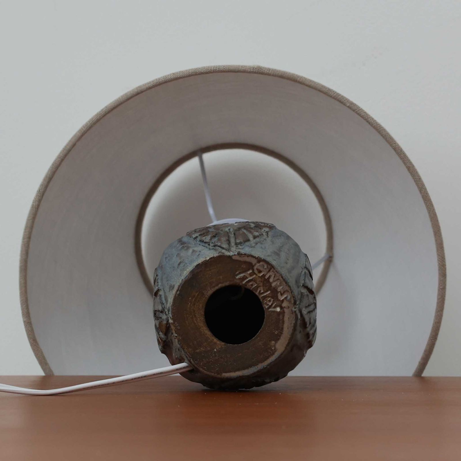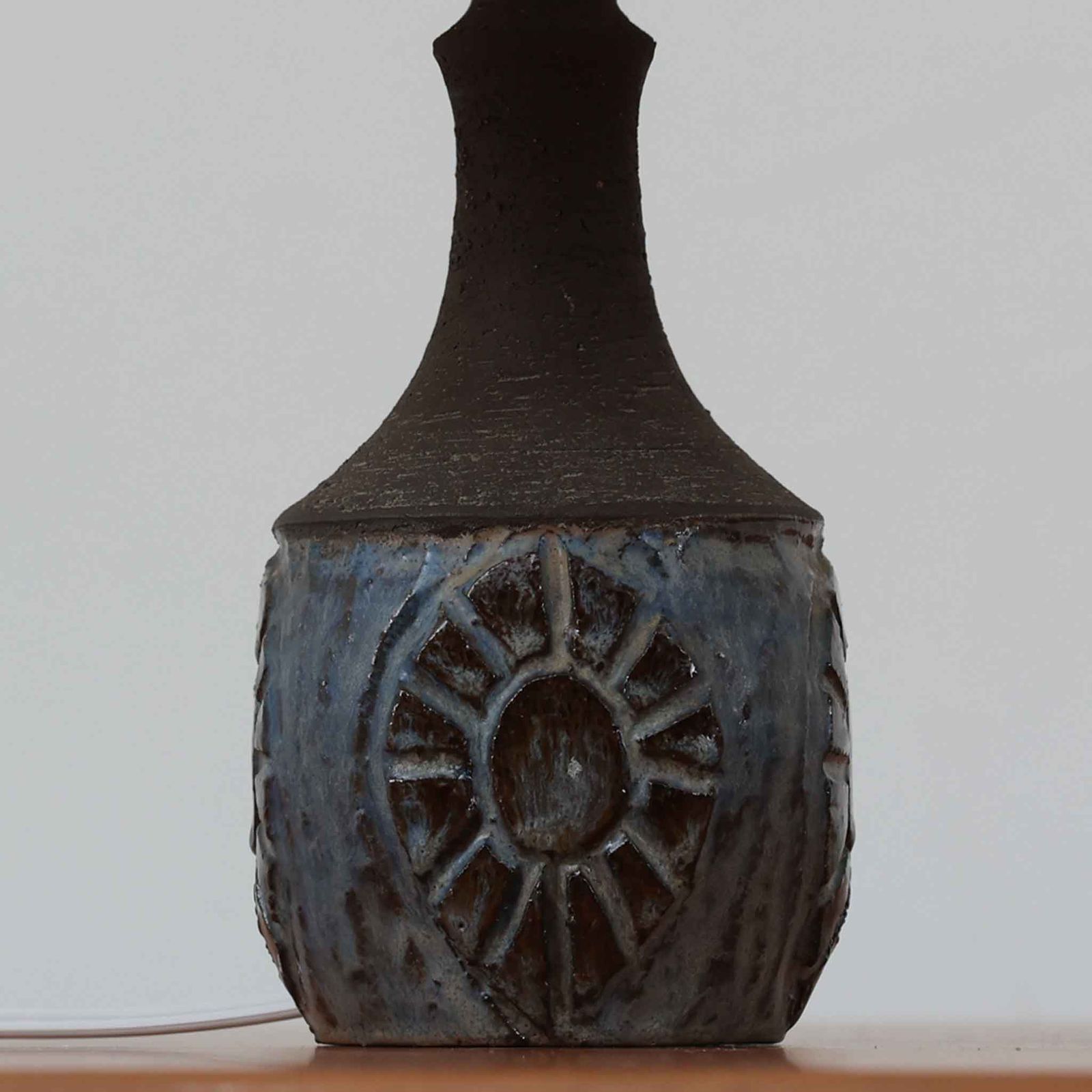 Chris HaslevがJetiのために手掛けたこちらのテーブルランプは、太陽を思わせるレリーフ模様をまとった陶器ベースと、素朴な土肌と釉薬の濃淡が織りなす豊かな表情が魅力で、コンパクトながら存在感を放つ北欧ビンテージ品です。上部のマットな質感が造形を引き締め、リネンシェード越しに広がるあたたかな灯りが空間をやさしく包み込み、リビングやベッドサイドのアクセントとして取り入れやすい一台に仕上がっています。