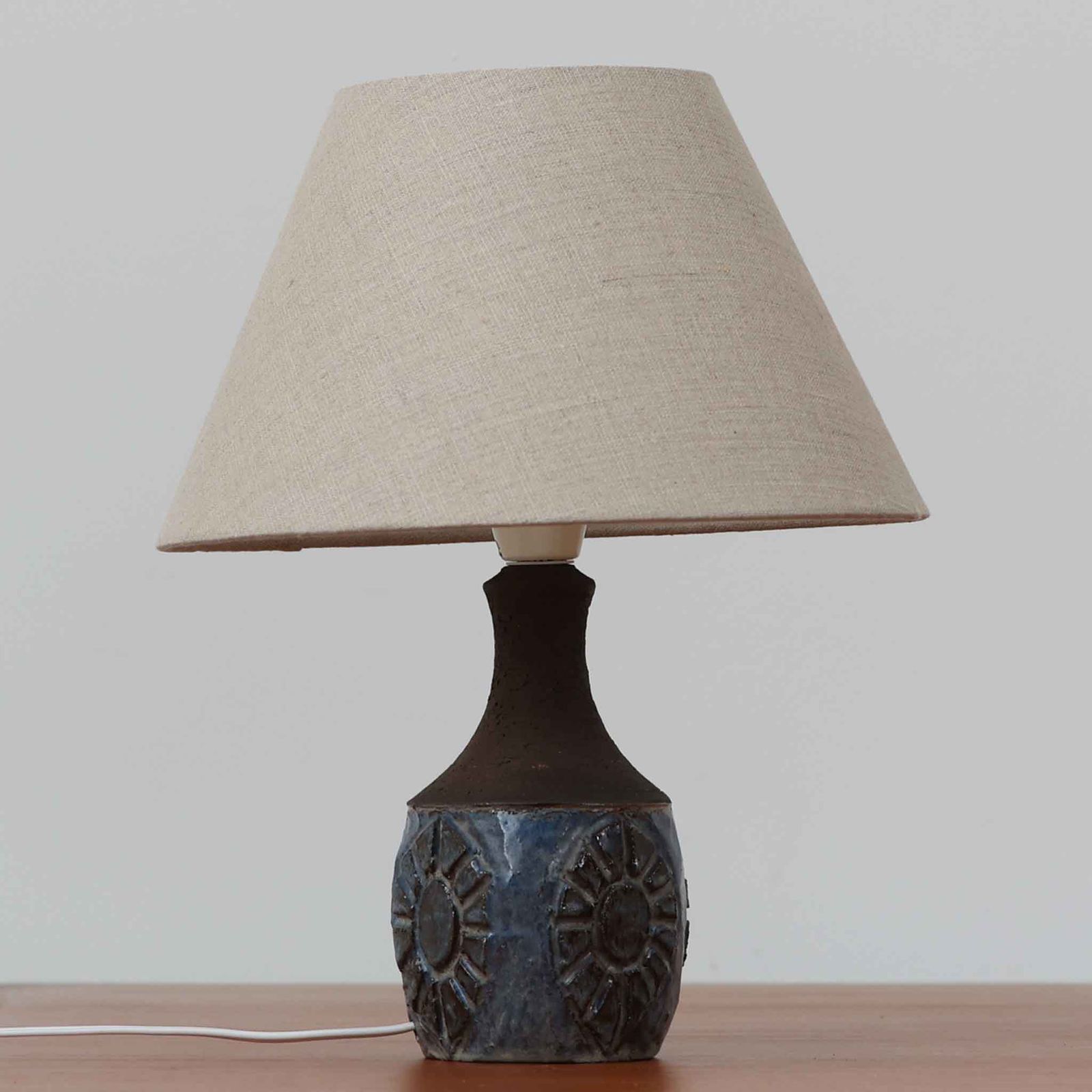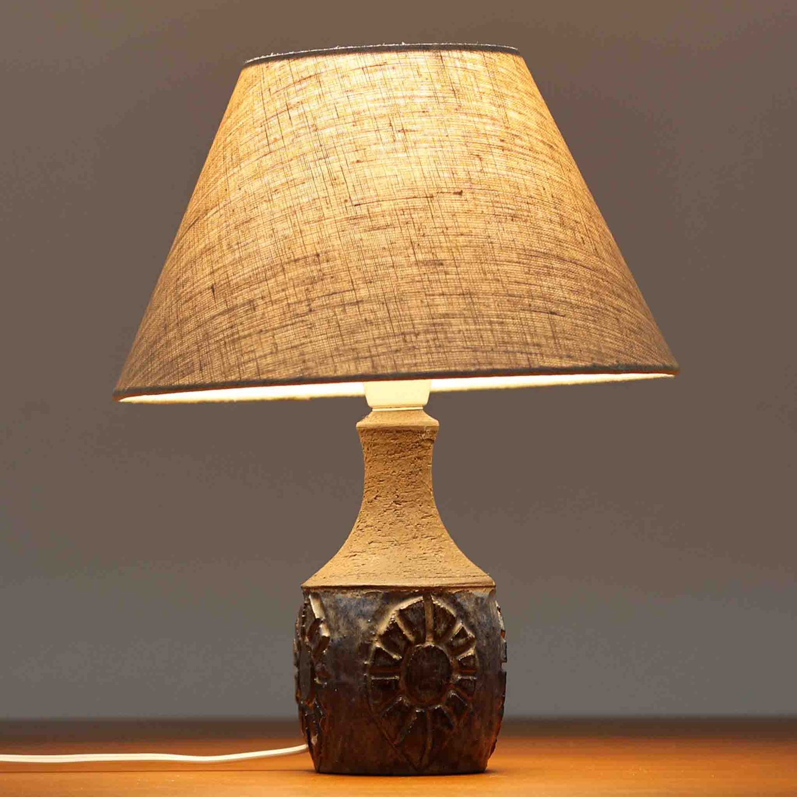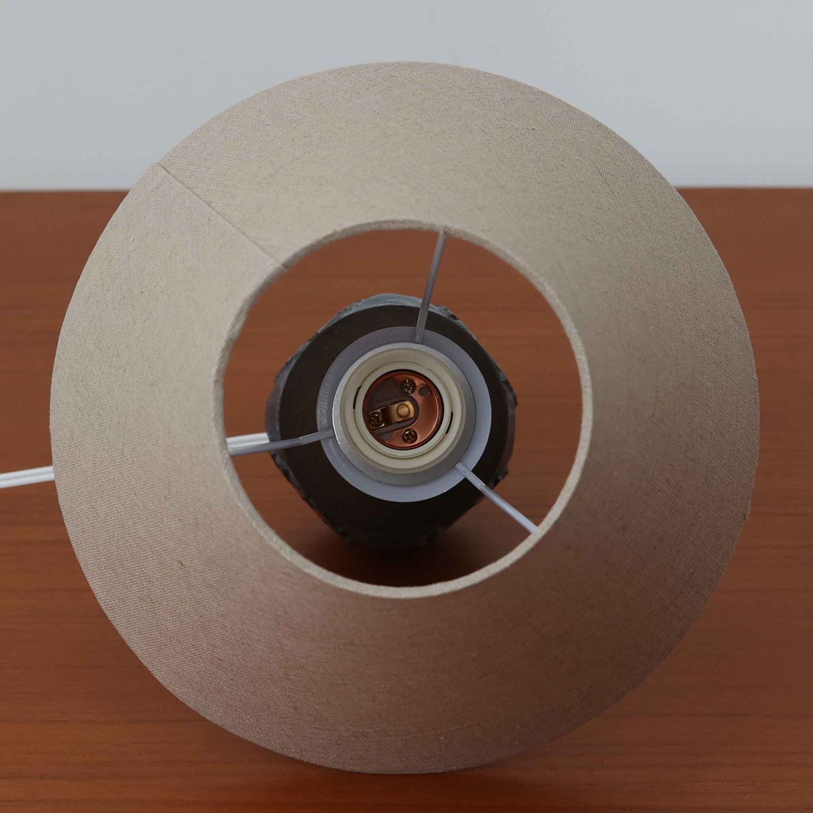 Chris HaslevがJetiのために手掛けたこちらのテーブルランプは、太陽を思わせるレリーフ模様をまとった陶器ベースと、素朴な土肌と釉薬の濃淡が織りなす豊かな表情が魅力で、コンパクトながら存在感を放つ北欧ビンテージ品です。上部のマットな質感が造形を引き締め、リネンシェード越しに広がるあたたかな灯りが空間をやさしく包み込み、リビングやベッドサイドのアクセントとして取り入れやすい一台に仕上がっています。