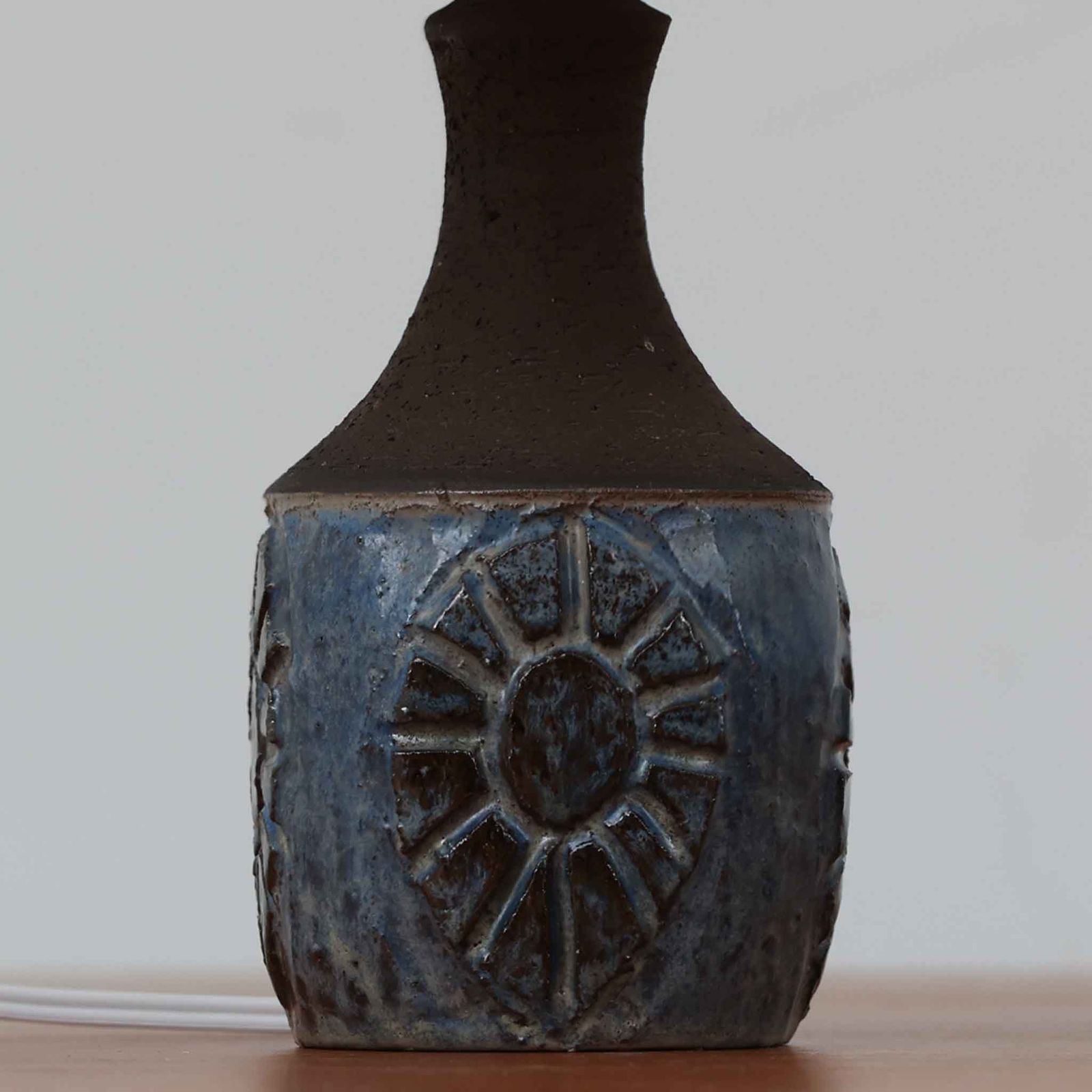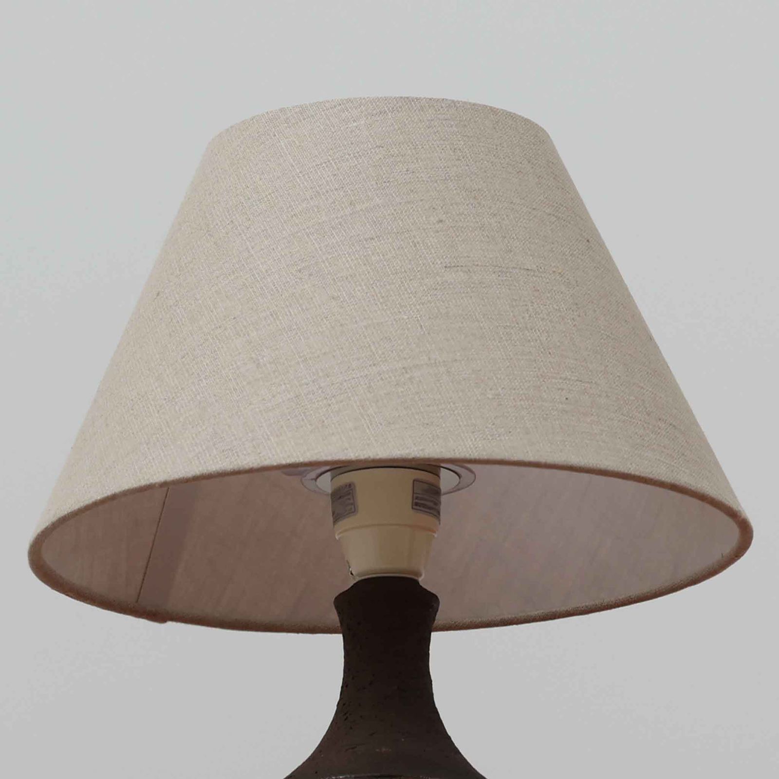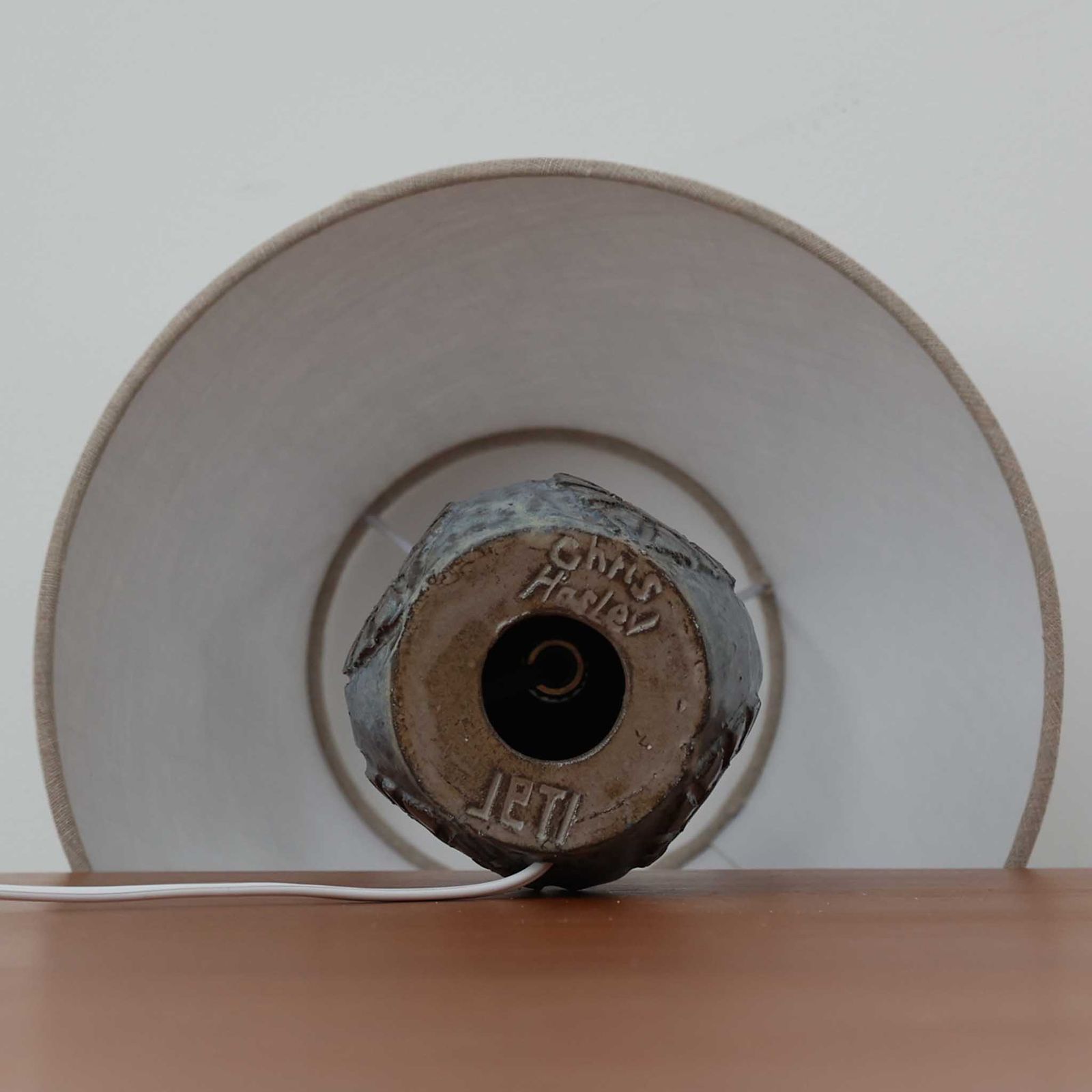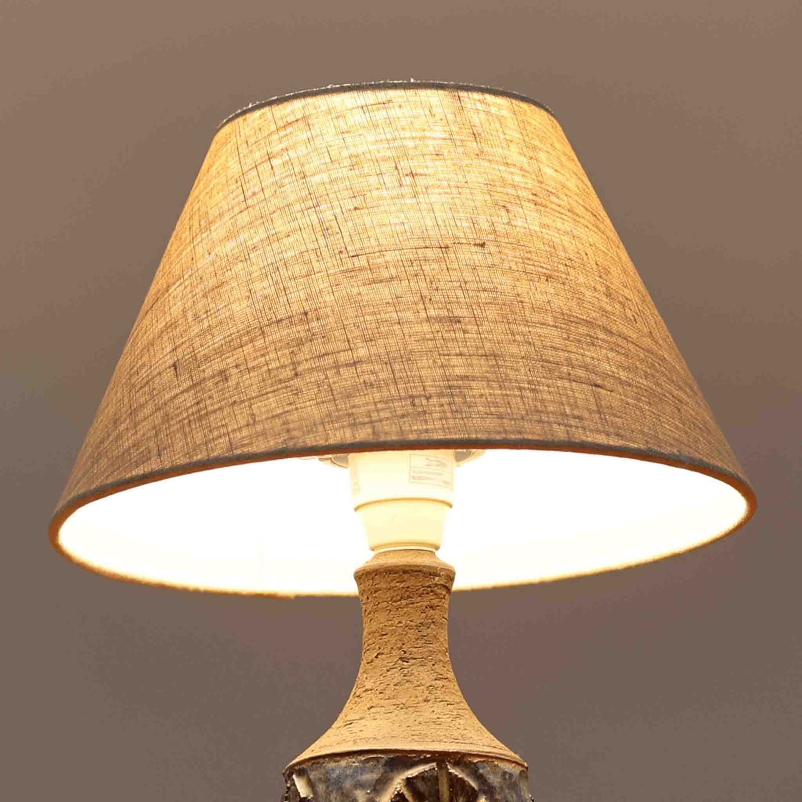 Chris HaslevがJetiのために手掛けたこちらのテーブルランプは、太陽を思わせるレリーフ模様をまとった陶器ベースと、素朴な土肌と釉薬の濃淡が織りなす豊かな表情が魅力で、コンパクトながら存在感を放つ北欧ビンテージ品です。上部のマットな質感が造形を引き締め、リネンシェード越しに広がるあたたかな灯りが空間をやさしく包み込み、リビングやベッドサイドのアクセントとして取り入れやすい一台に仕上がっています。