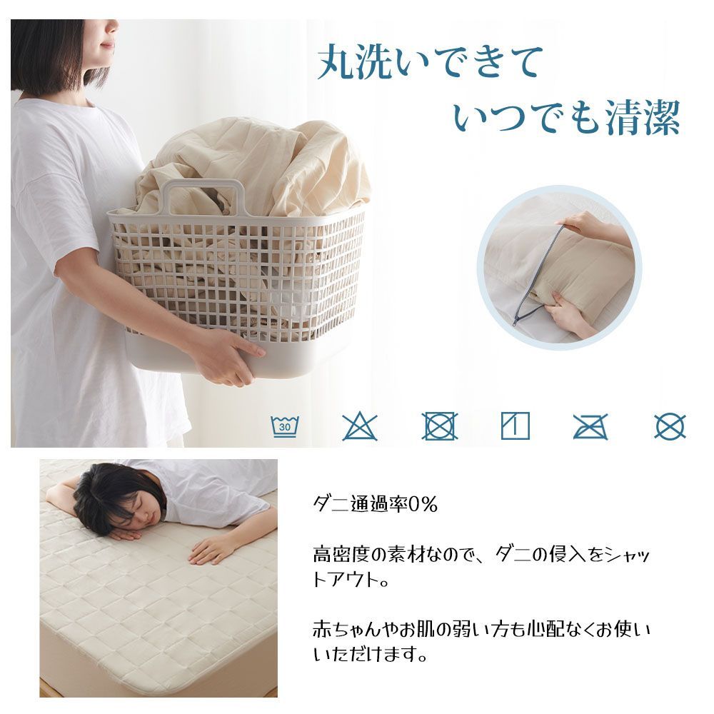 表面はソフトで心地よいピーチスキン生地。洗いざらし加工で自然なシワ感と柔らかさをプラスし、さらりとした肌触りで一年中快適に使用できます。防水・抗菌・防臭・防ダニの多機能仕様で、肌の弱い方や敏感肌の方にも安心です。