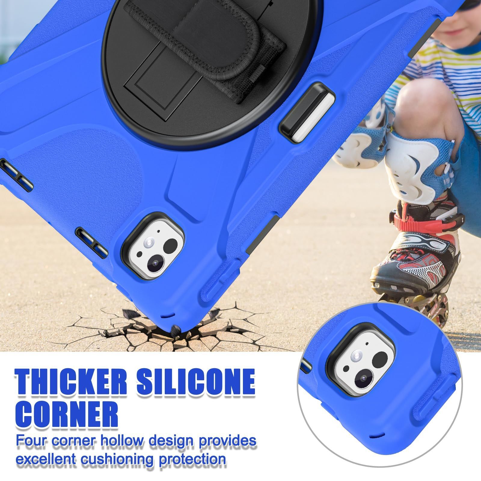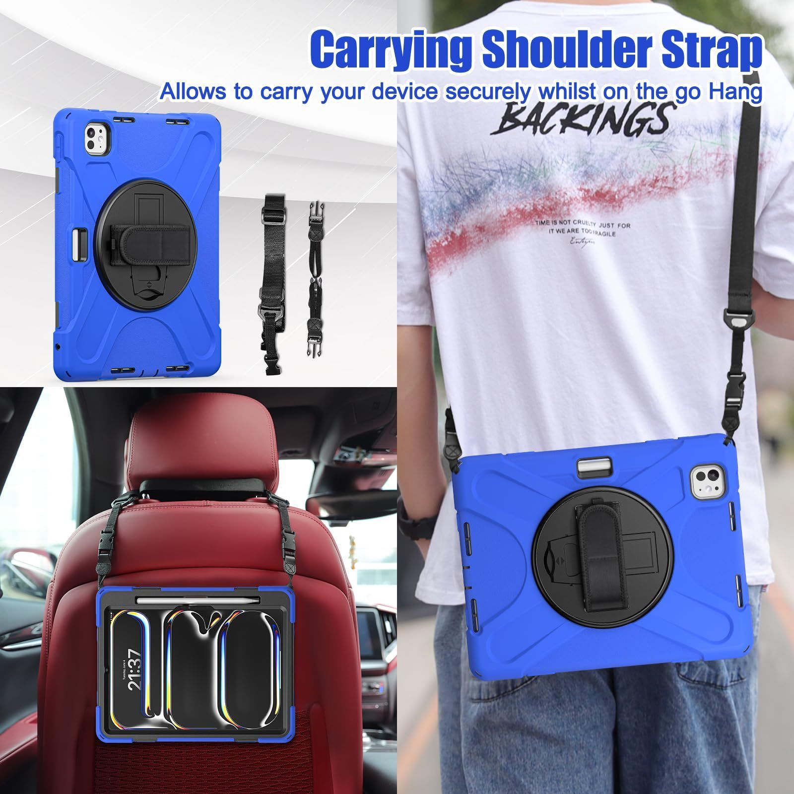 Herize iPad Pro ケース11インチ M4 (2024 第5世代)専用 耐久性ケース 保護フィルム付き,ペンシルホルダー付きタッチペン収納でき,アイパッドプロケース 11インチ2024 耐衝撃カーバ スタンド付き横置き縦置き可能ハンドストラップ付き 子供用,取り出し可能ショルダーストラップ付き 頑丈 傷防止 (ブルー)