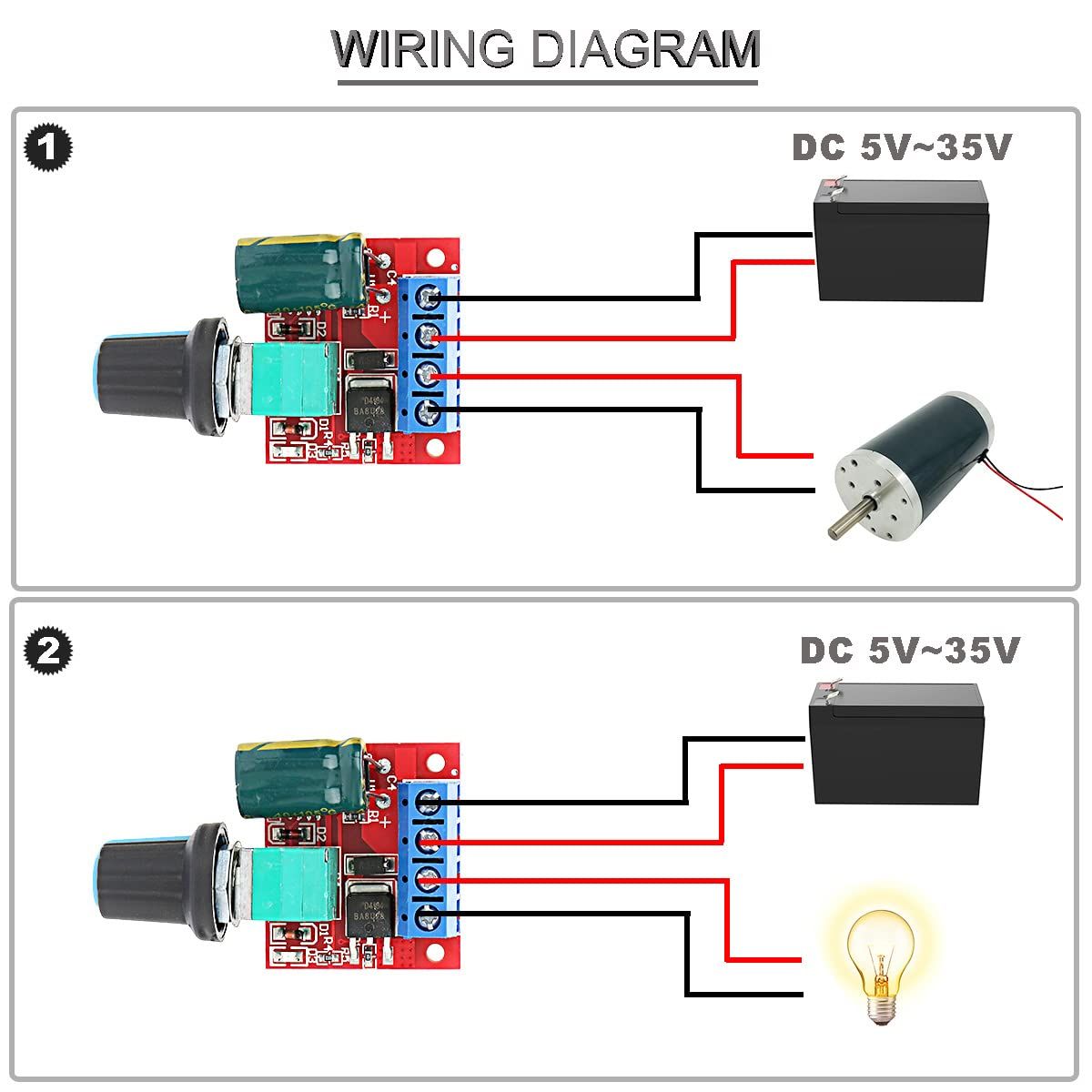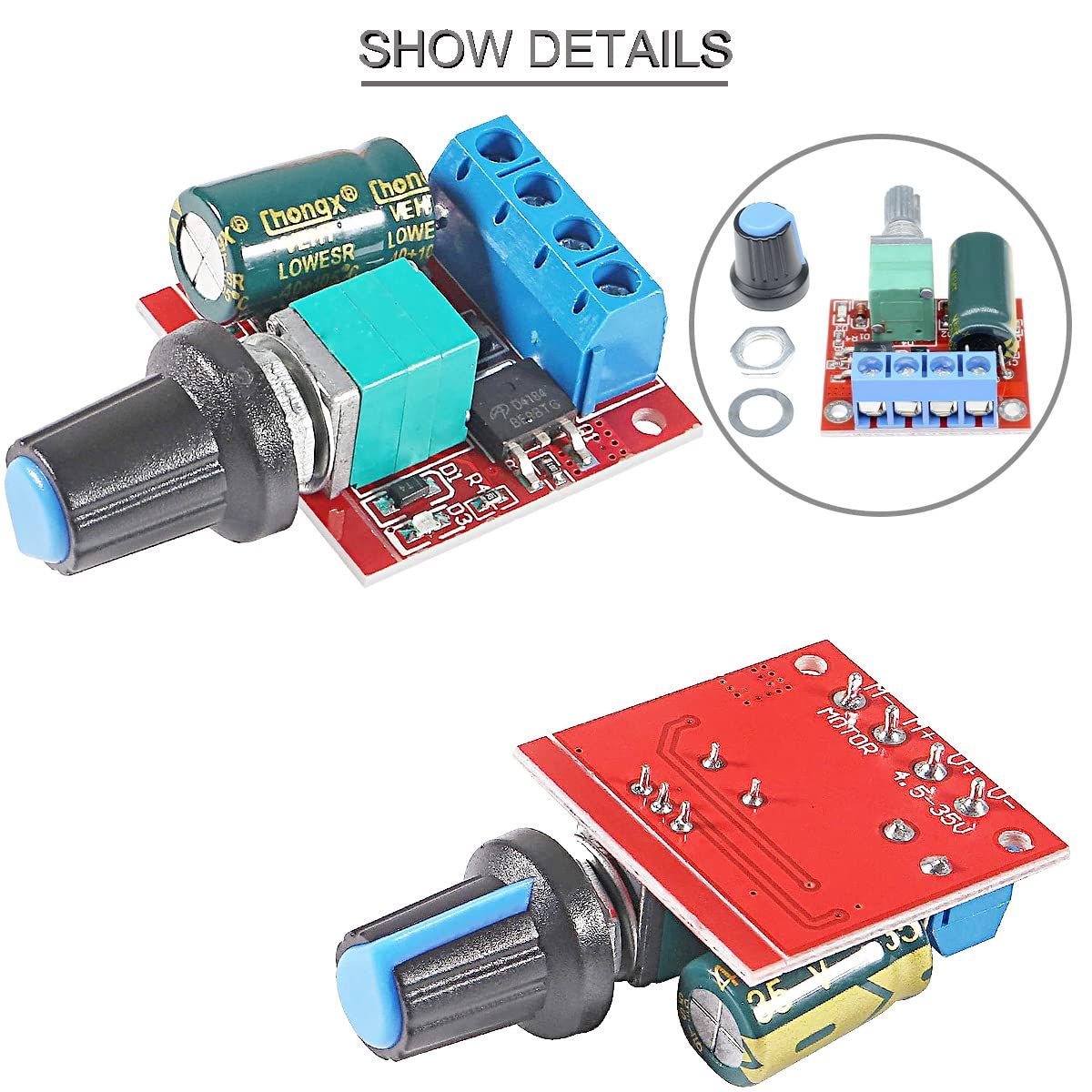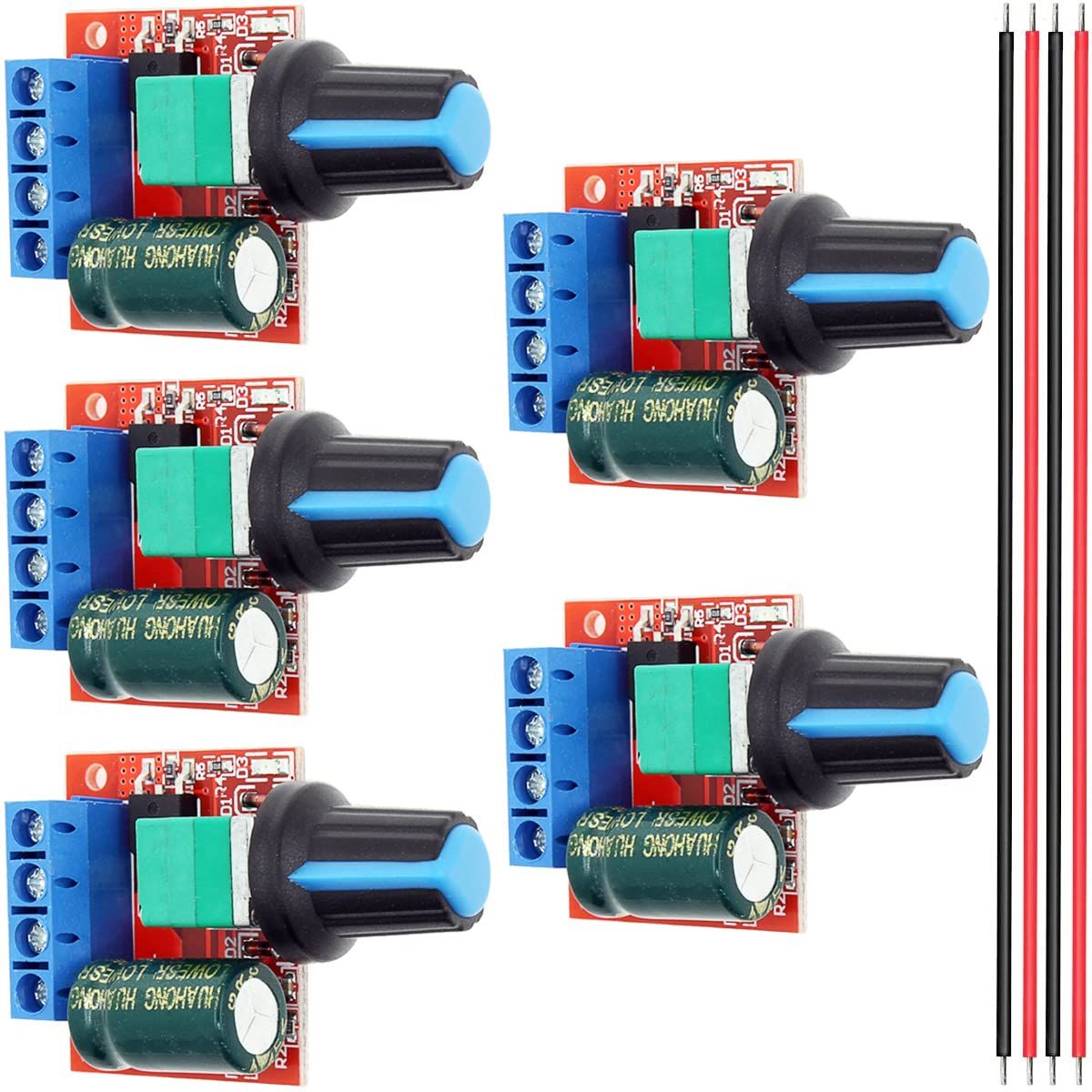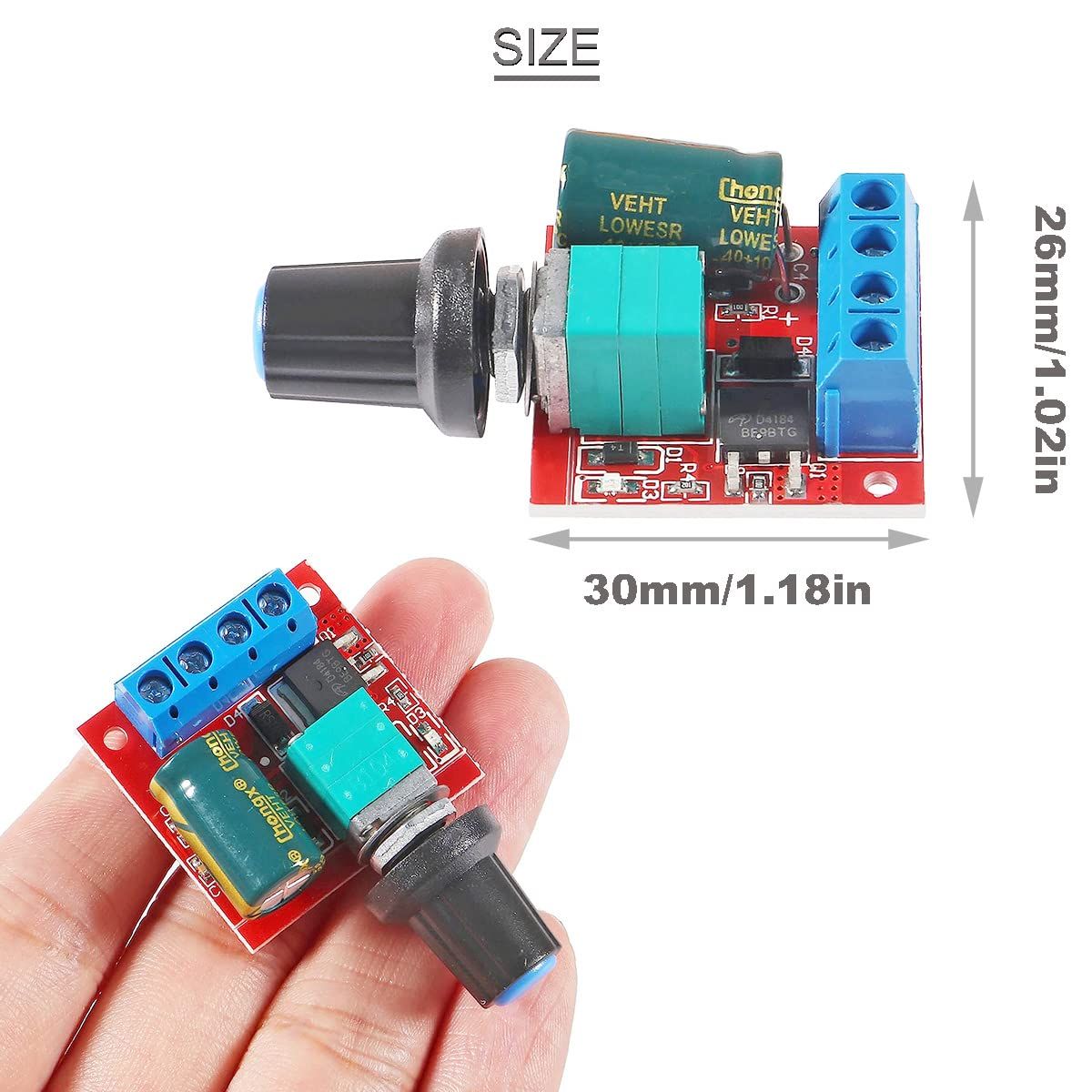 5個PWMスピードコントローラー ミニDCモーターDC 5V-35V 5A 回転式ポテンショメータ速度調整スイッチコントローラLEDインジケータ付き 耐久性スイッチ24AWG赤黒ケーブル付き