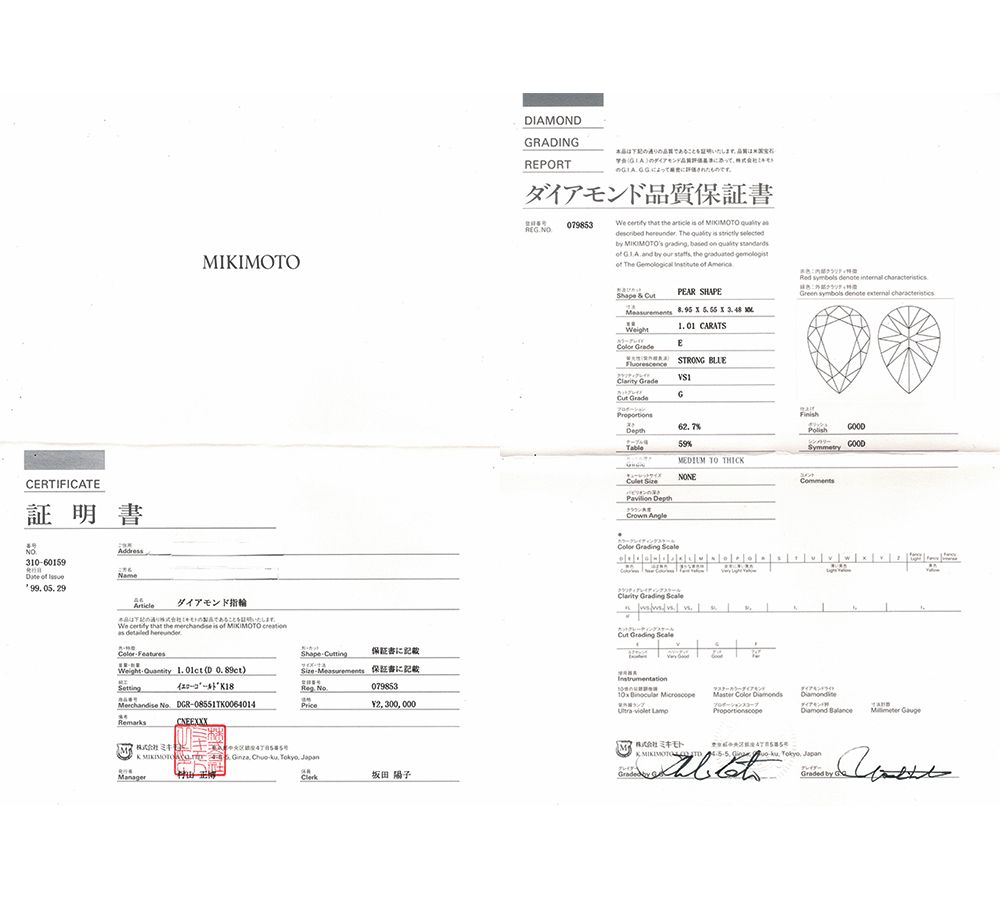 真珠だけでなく、日本におけるダイヤモンドの歴史を築き上げたことでも有名なミキモト。Eカラー、VS1、1.01ctのペアブリリアントカットダイヤモンドをセットした、贅沢なリング。メインストーンを引き立てる、マーキスとペアブリリアントカットダイヤモンドを組み合わせたエレガントなデザインに魅了されます。厳選した素材の素晴らしさを最大限に引き出した、上質なジュエリーです。※証明書に上代2,300,000円の記載があります。